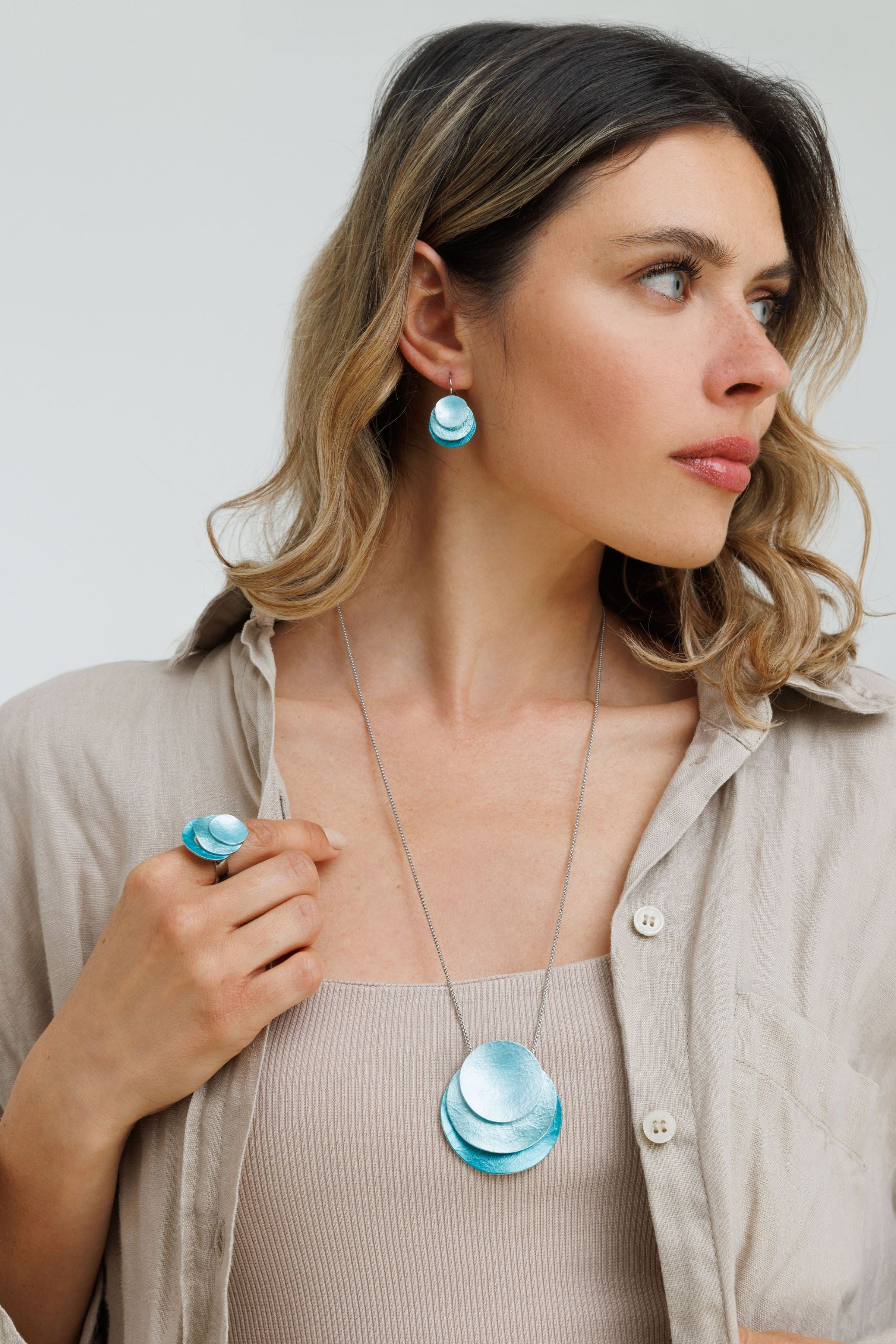 תכשיט זה חלק מקולקציית התכשיטים בגוונים ייחודיים המתקבלים באמצעות צביעה בעבודת יד.