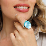 טבעת מעוצבת ואופנתית בעלת גווני טורקיז ייחודים בריקוע עדין.
