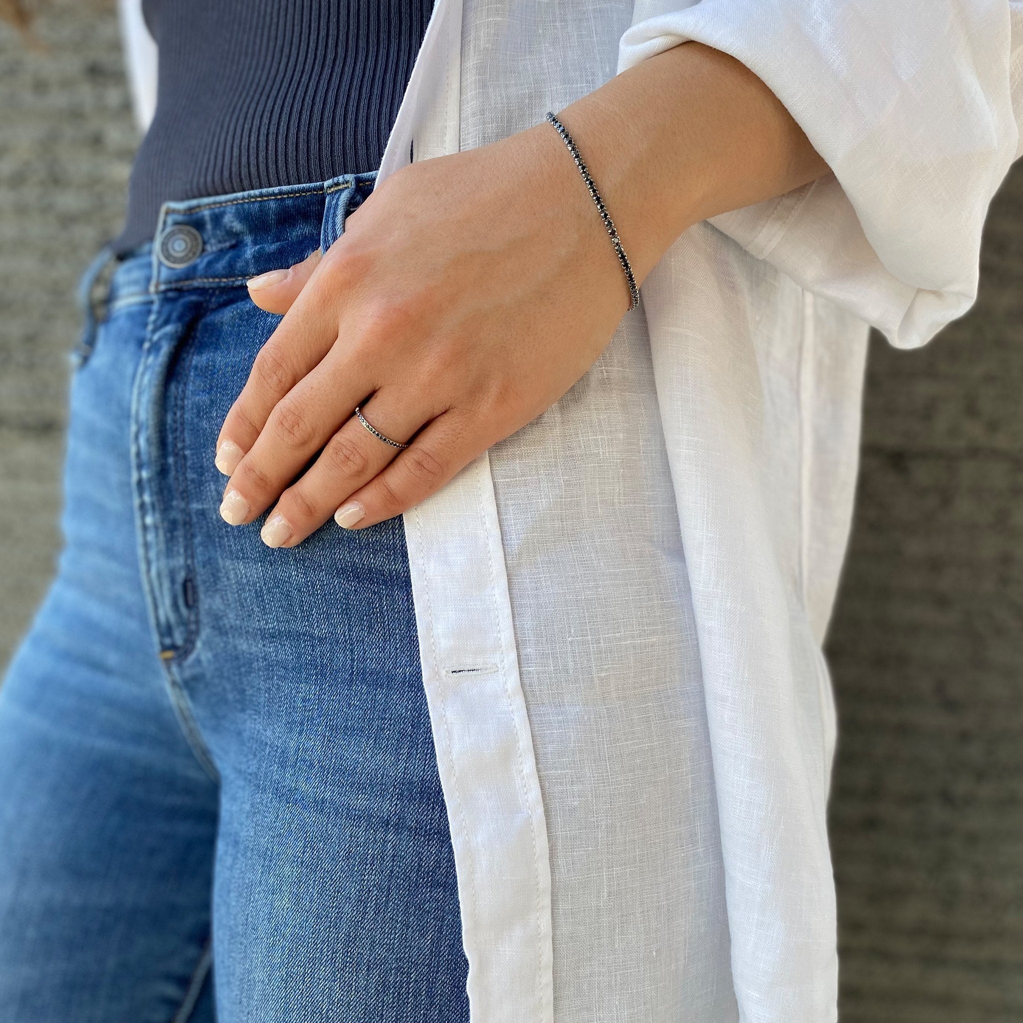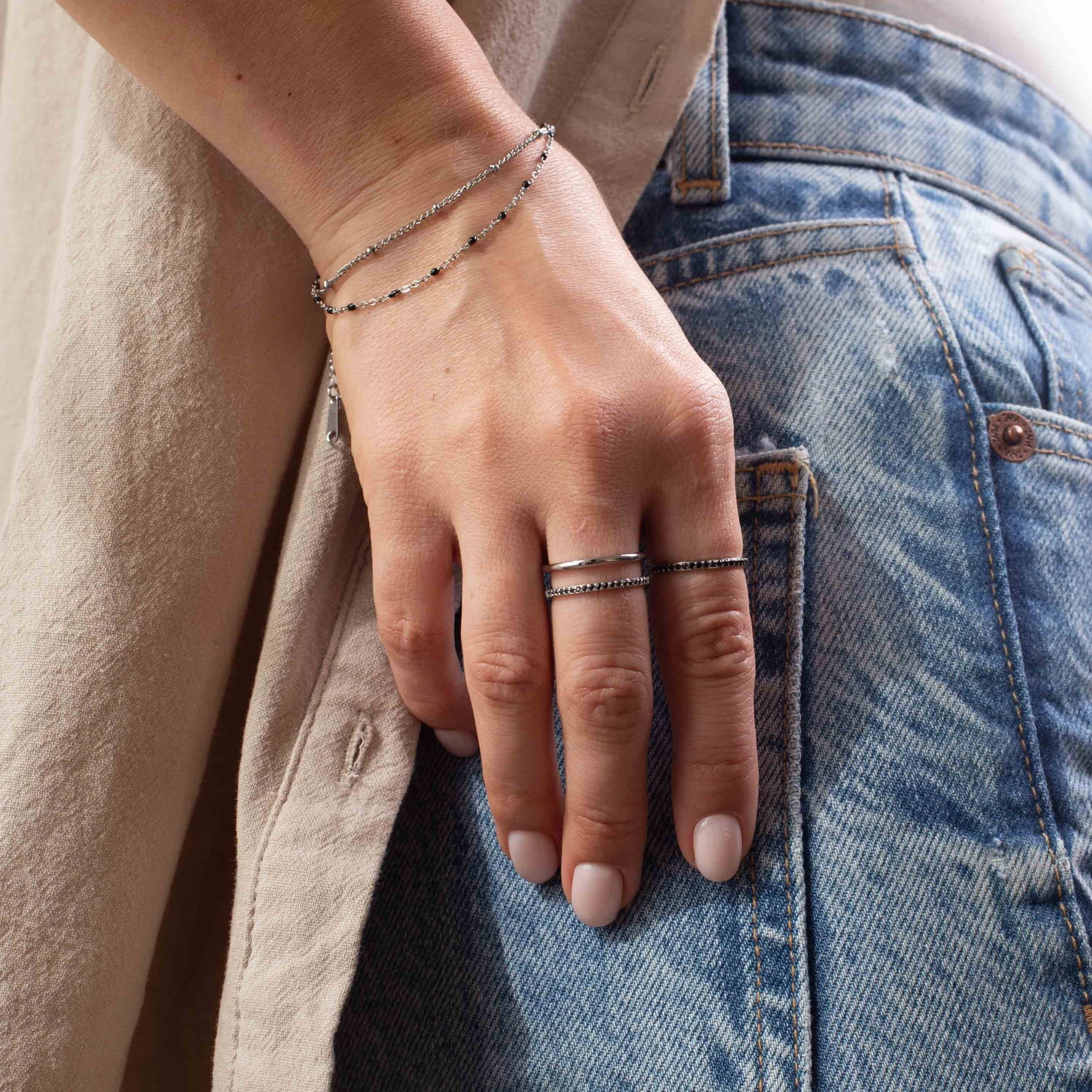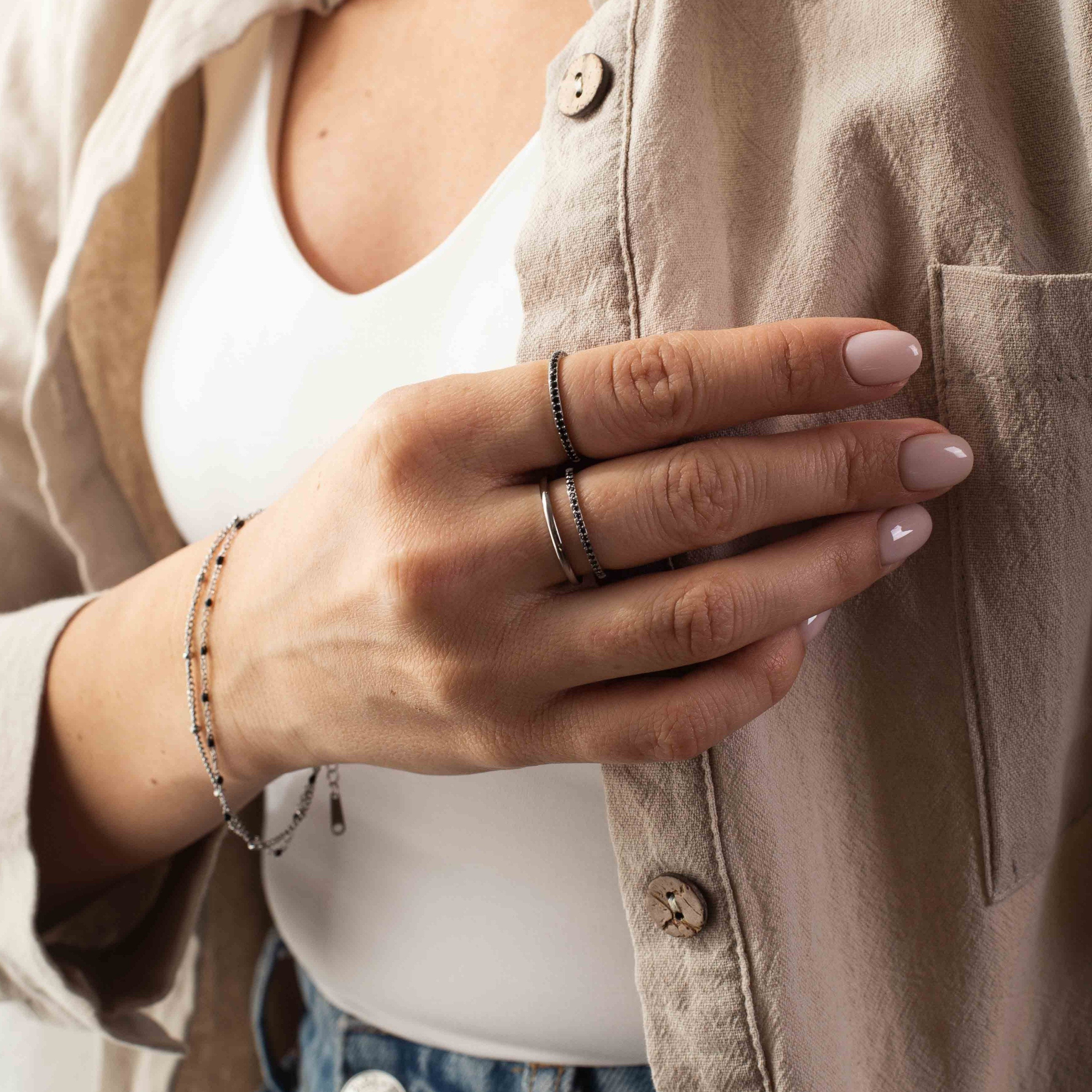 טבעת טניס קלאסית בשיבוץ זרקונים שחורים, שיפה על היד בפני עצמה או בשילוב טבעות נוספות למראה עשיר יותר באקססוריז.