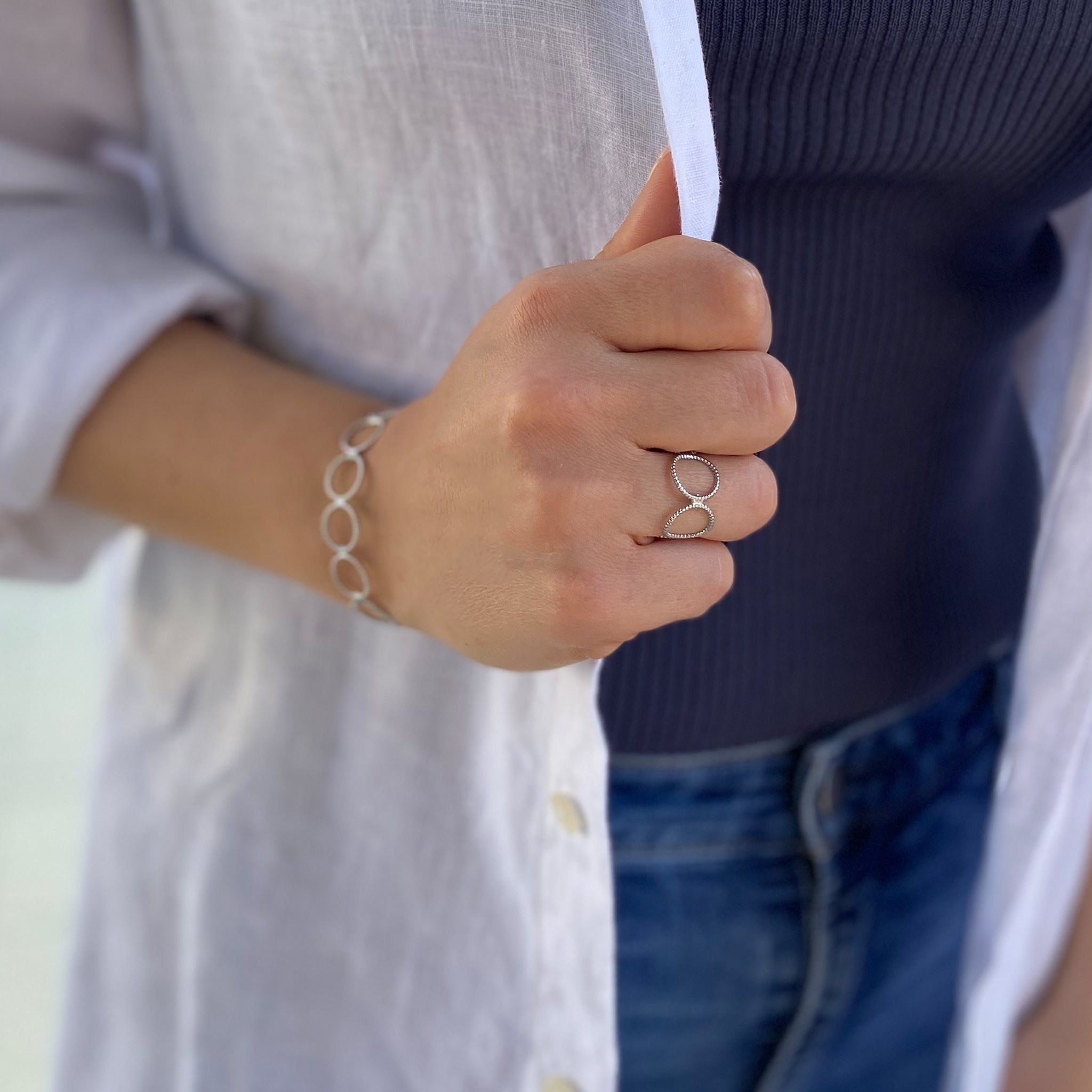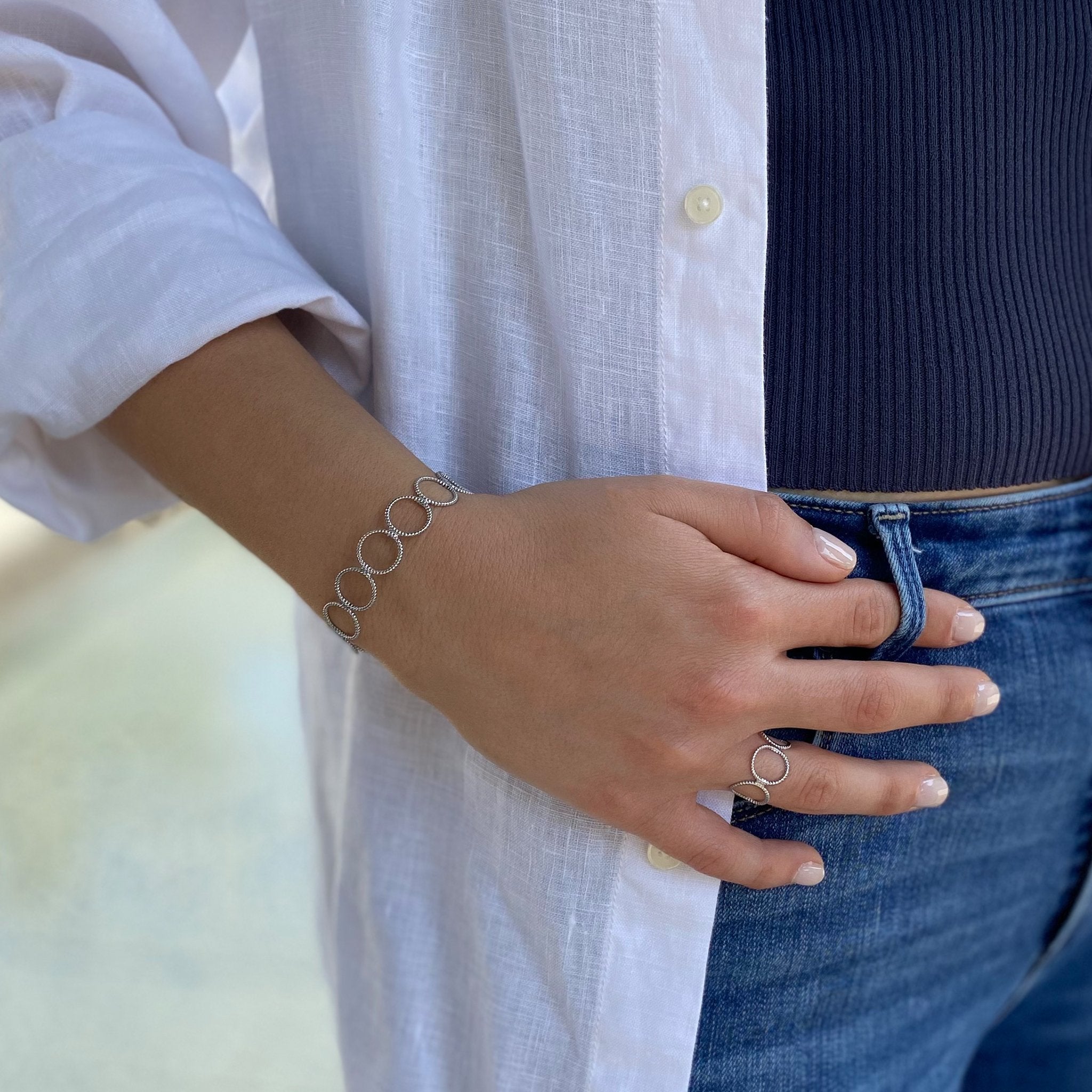 סט צמיד וטבעת הרפר הוא סט צמיד בנגל קשיח וטבעת נפתחת MUST HAVE עם עיגולים חלולים בריקוע ייחודי.