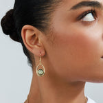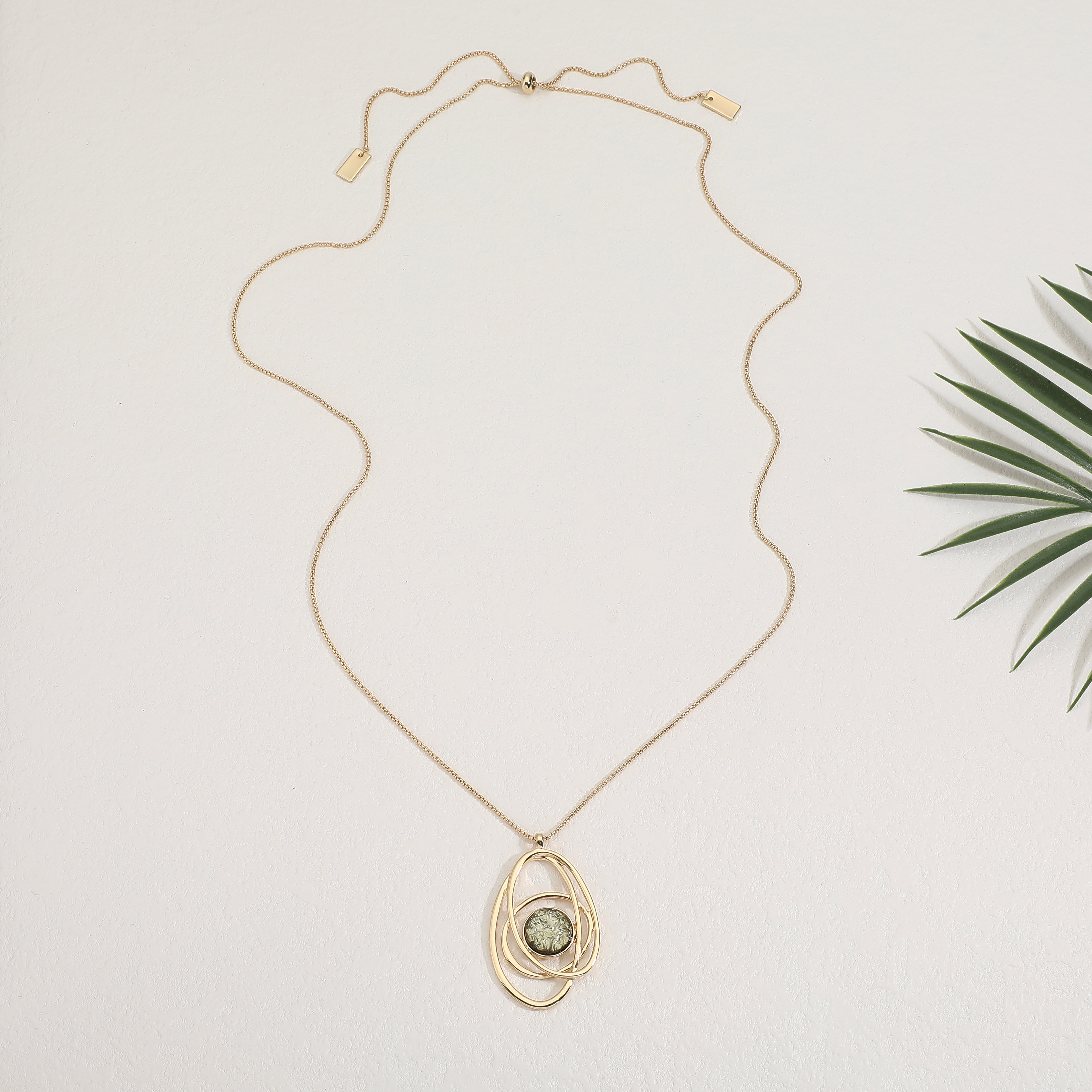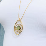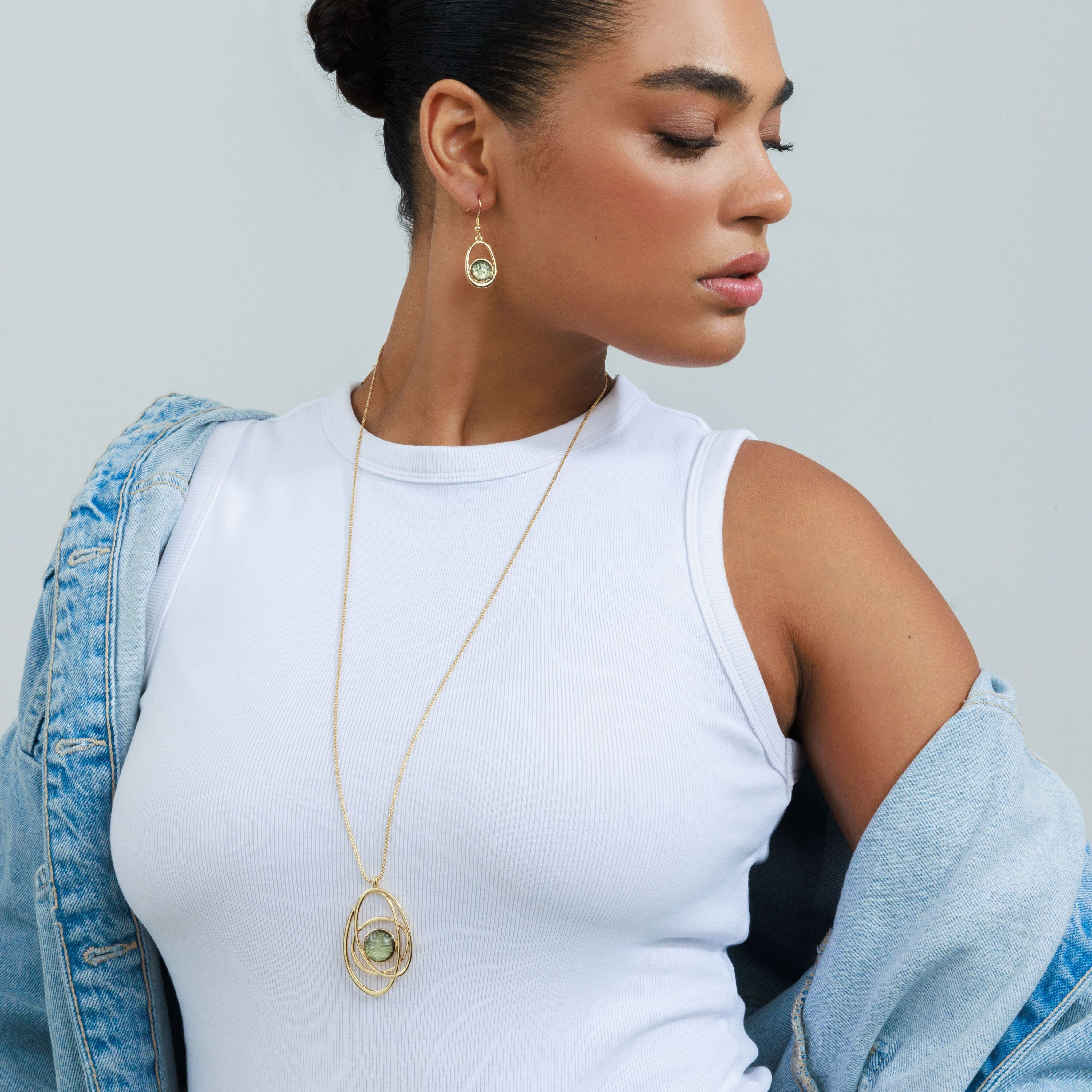 סט שרשרת ארוכה ועגילי אלודי אוליב הוא סט בעיצוב פיסולי ייחודי, המשלב תליוני מעגלים סביב דמוי אבן מרכזית בגוון ירוק זית מהמם.
