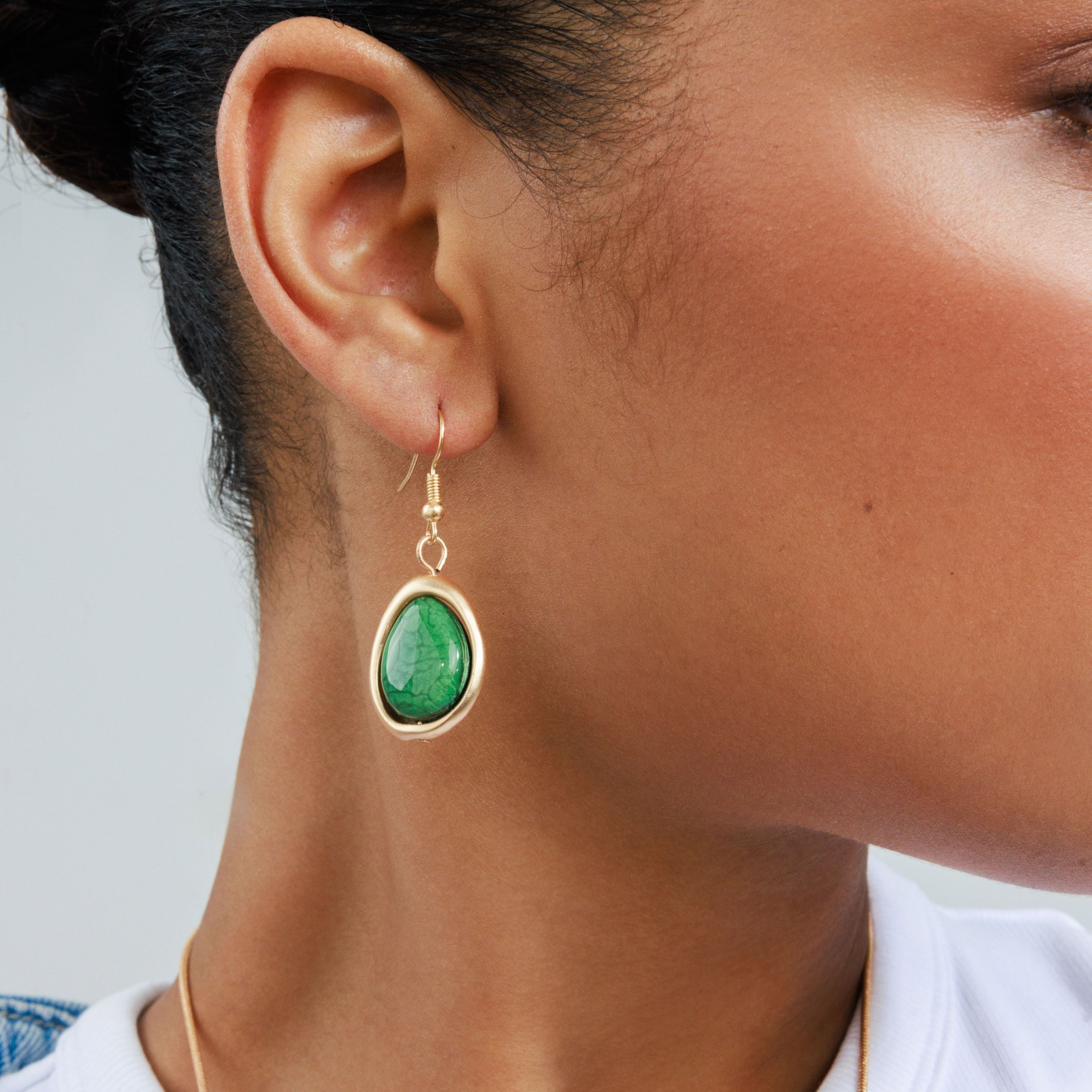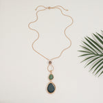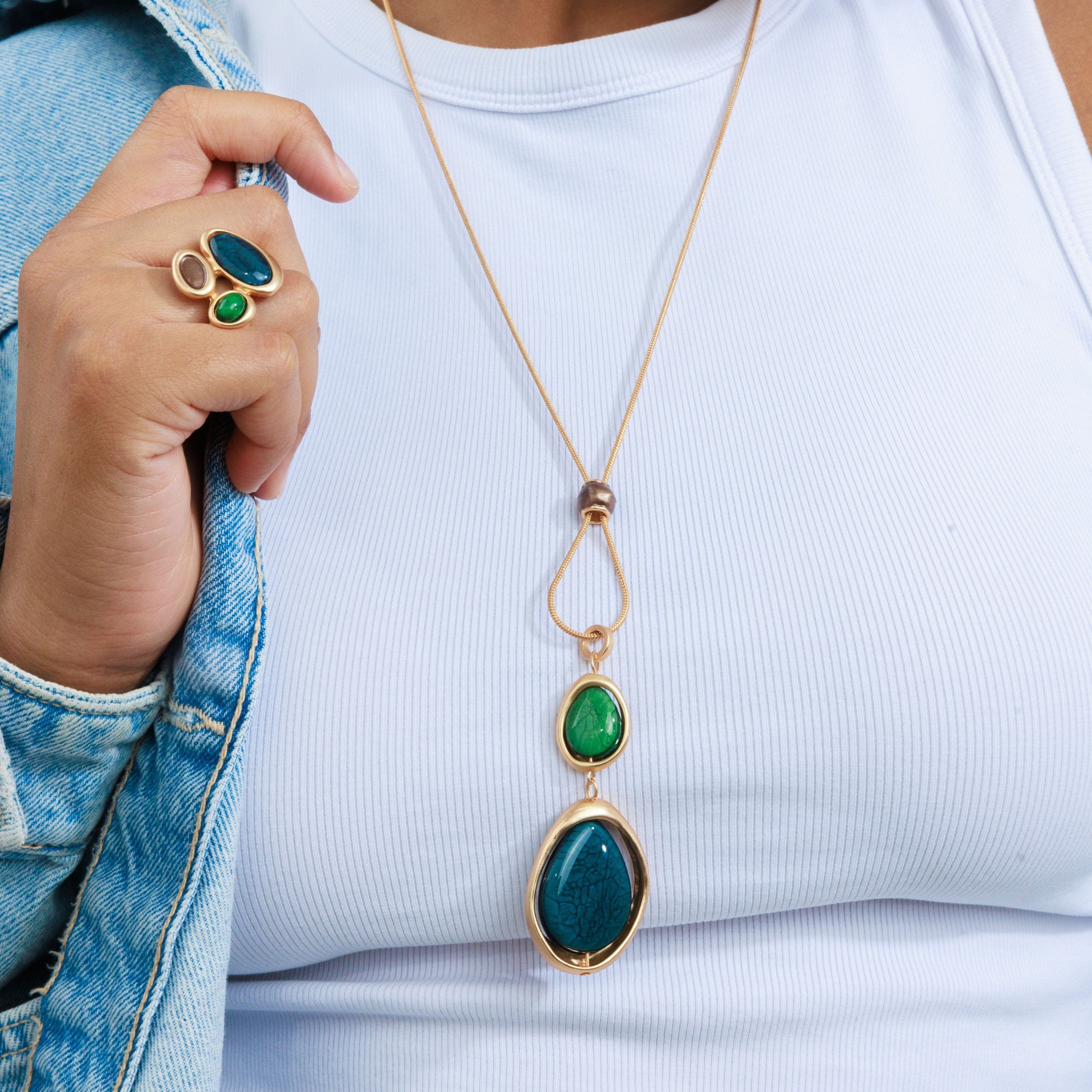 סט שרשרת ארוכה, עגילי וטבעת דאייר הוא סט מעוצב בעל אלמנטים ייחודיים בגווני כחול-ירוק.
