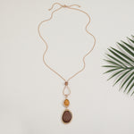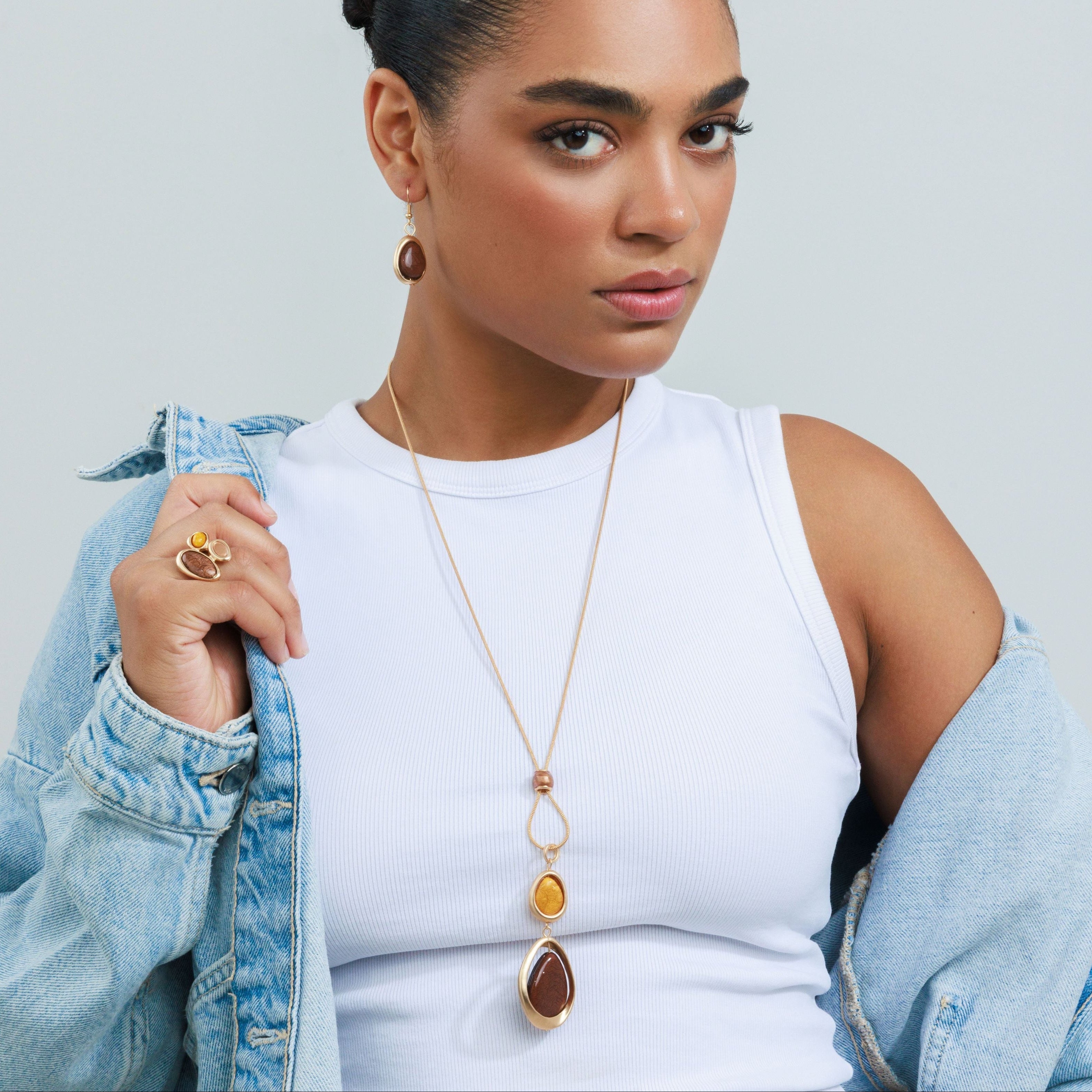 סט שרשרת ארוכה, עגילי וטבעת דאייר גולד הוא סט מעוצב בעל אלמנטים ייחודיים בגווני חום-זהב.