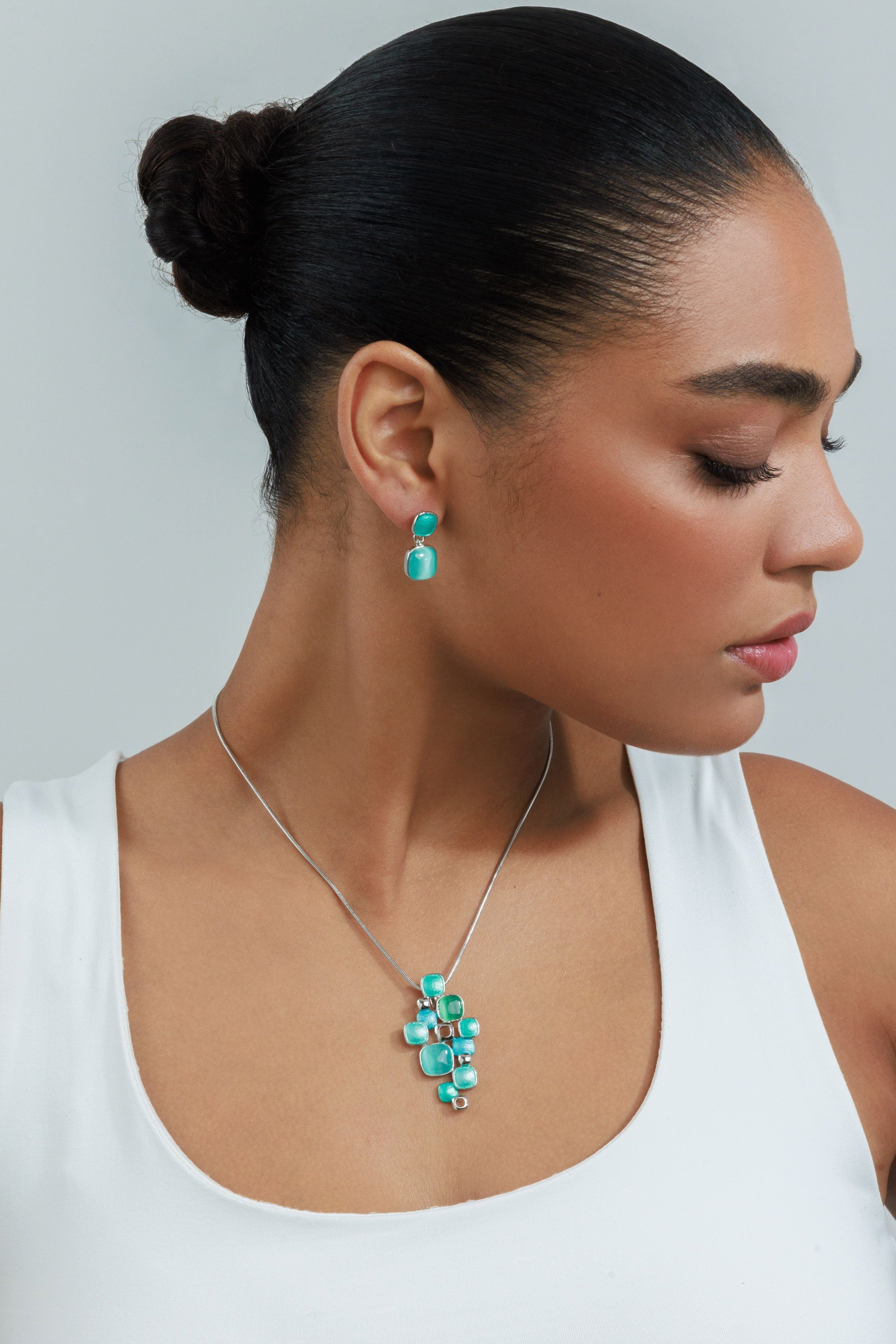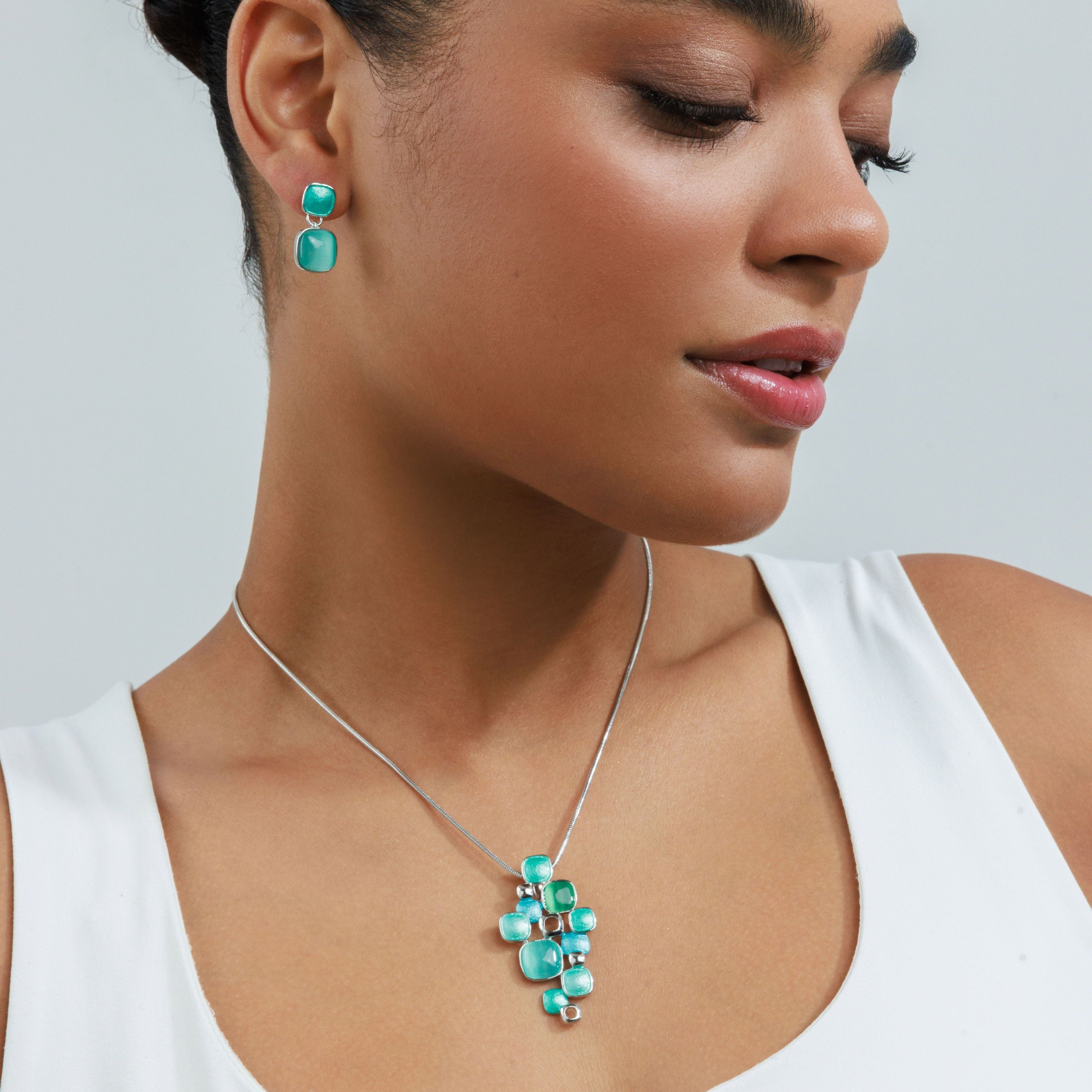 סט שרשרת ועגילי ליאן הוא סט תליונים מרובעים ומעוצבים בשילוב אלמנטים מהממים בגווני טורקיז.