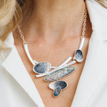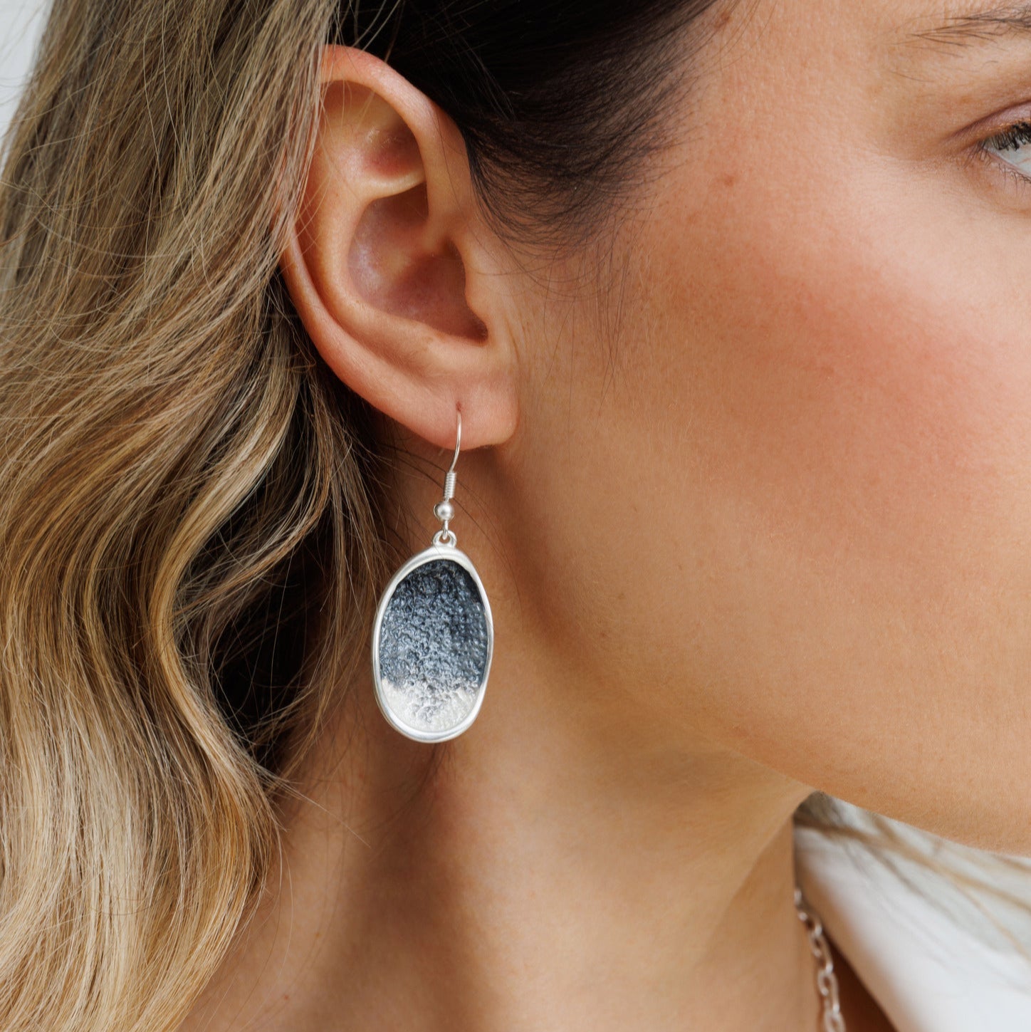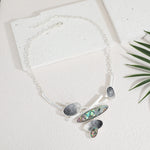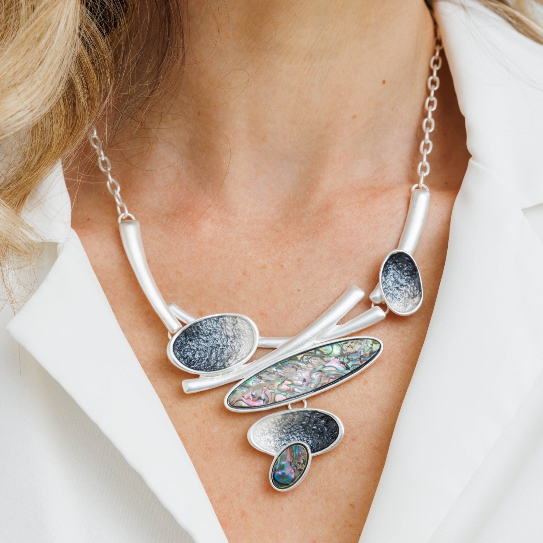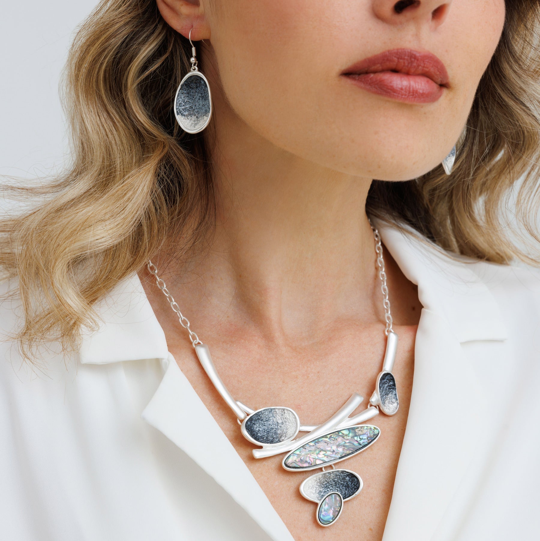 סט שרשרת ועגילי ניו קירה הוא סט תליונים מעוגלים בגווני אפור שונים בשילוב צדף וריקוע סנדי חדשני.