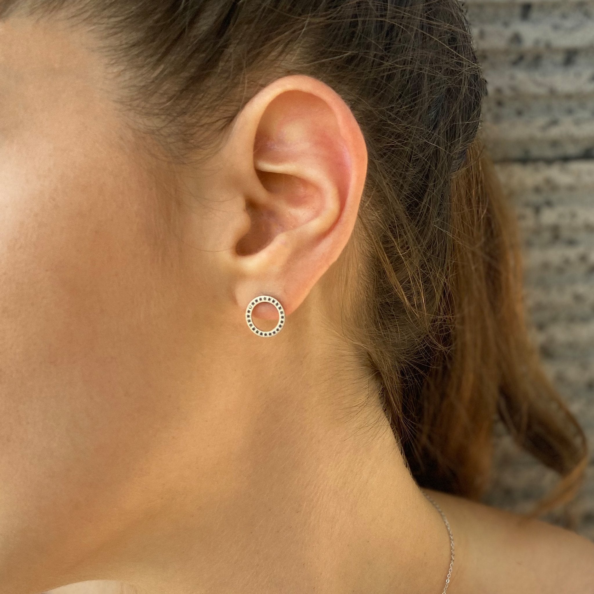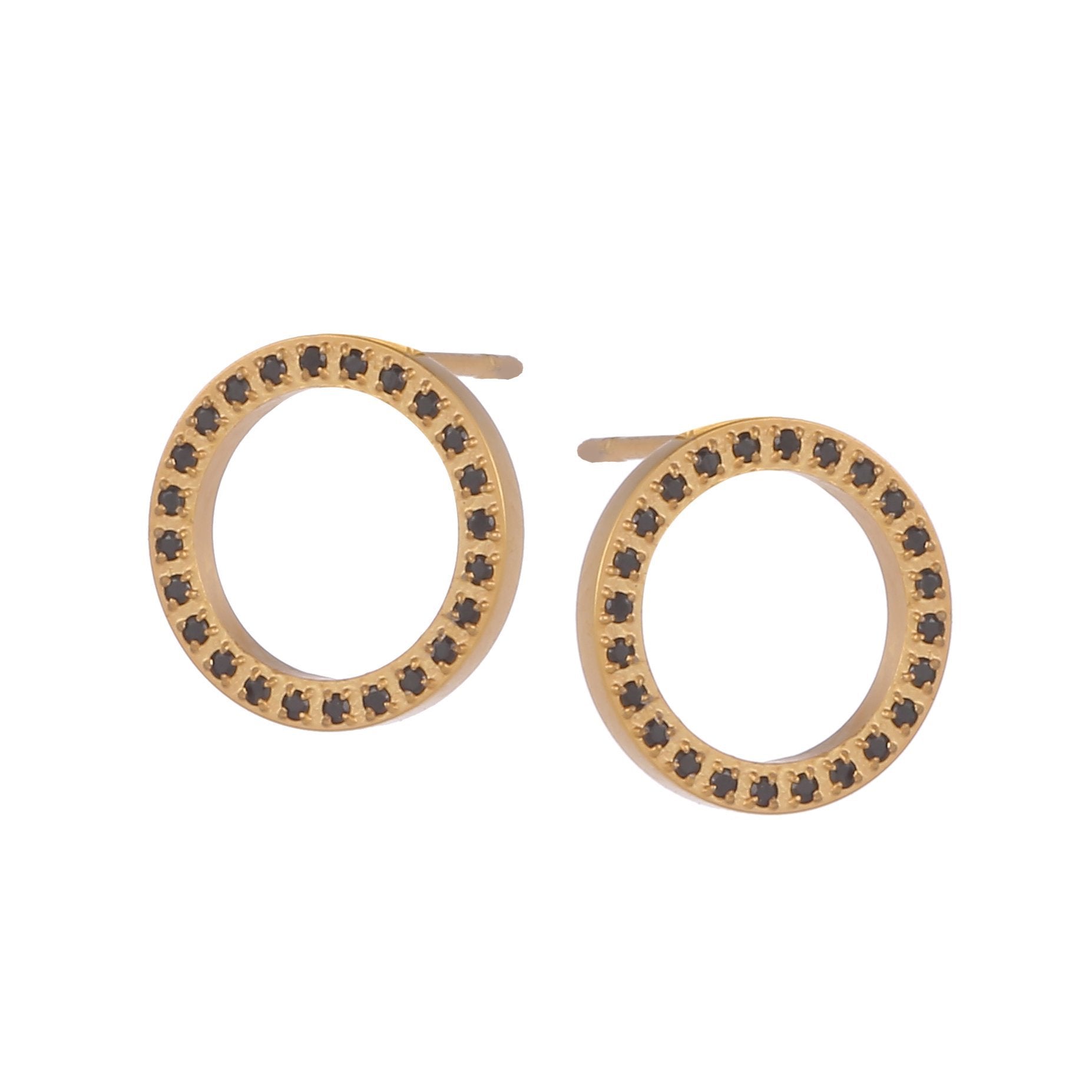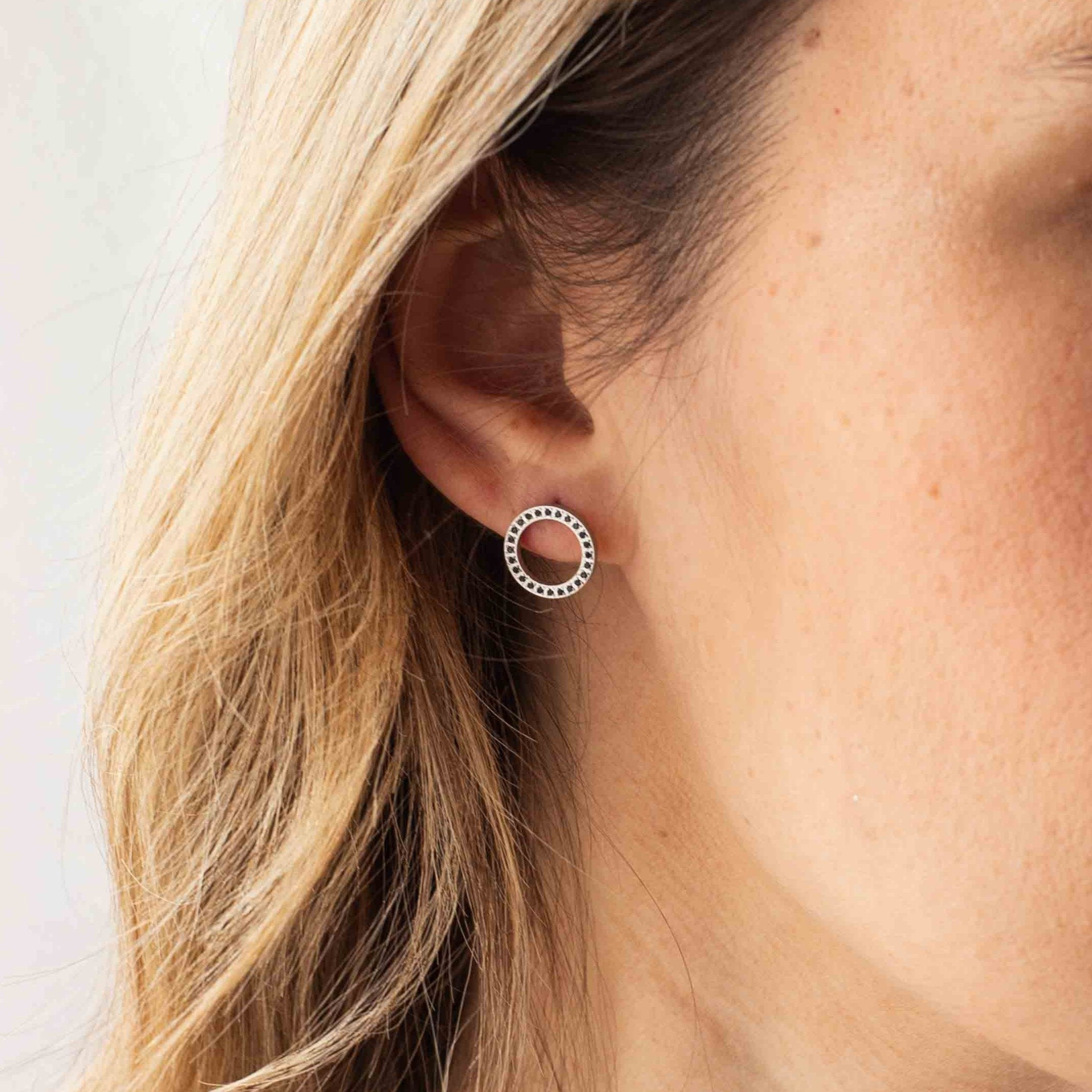העגיל בצורת עיגול חלול ומשובץ זרקונים שחורים.