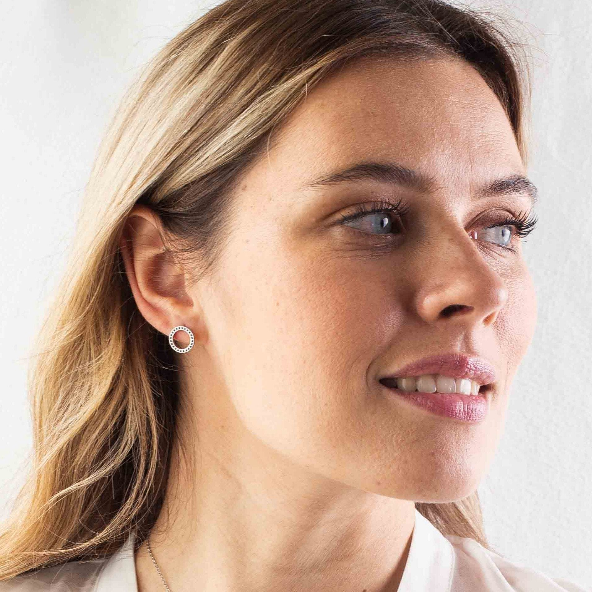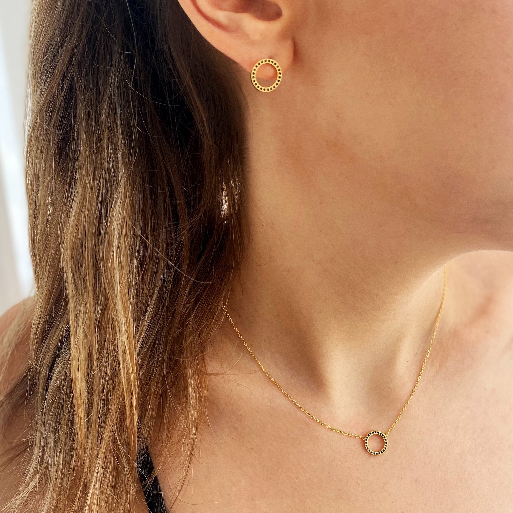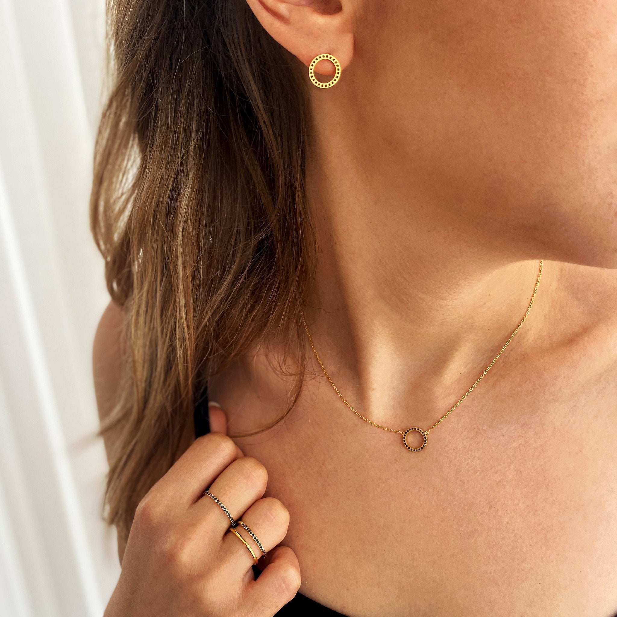 העגיל בצורת עיגול חלול ומשובץ זרקונים שחורים.