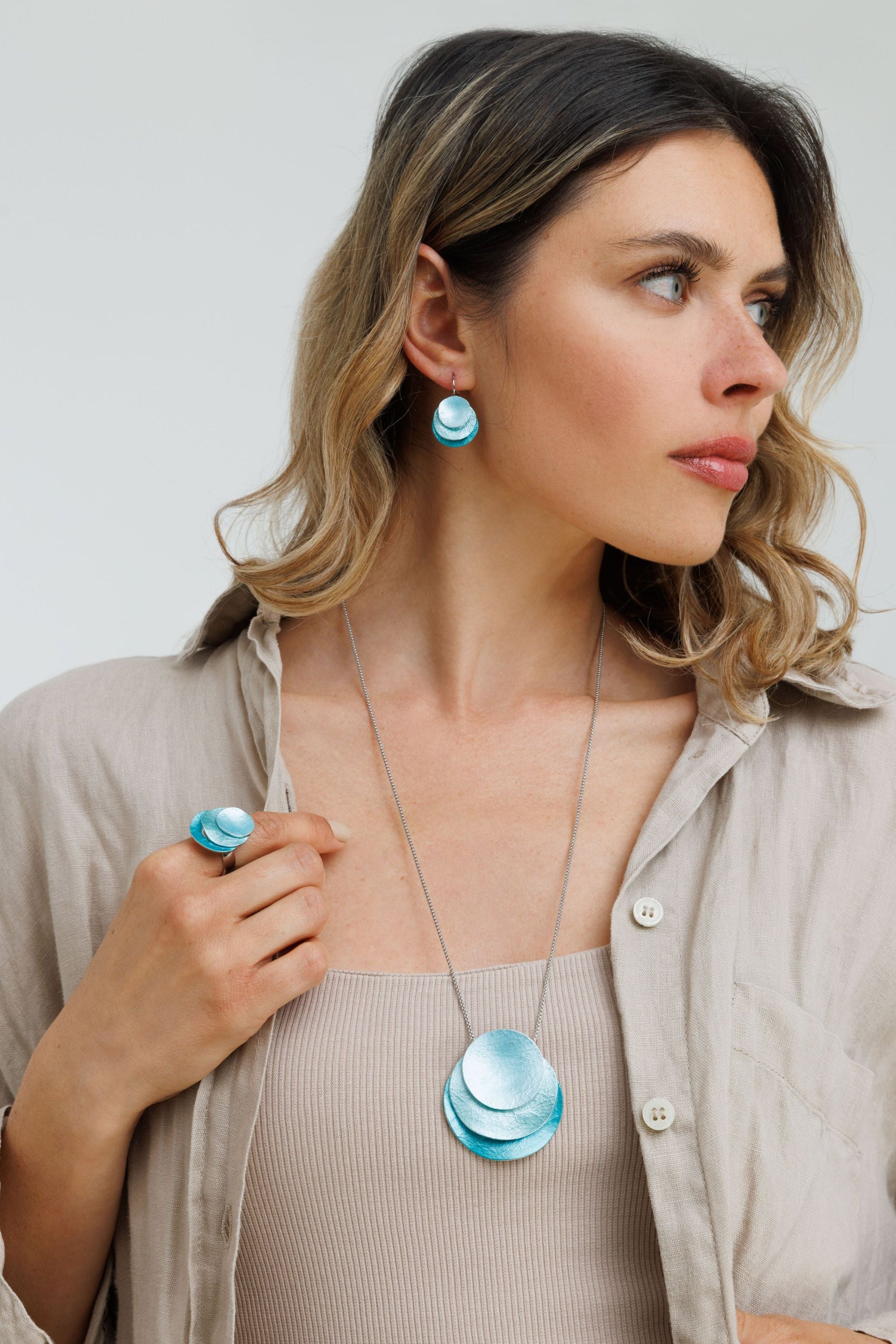 תכשיט זה חלק מקולקציית התכשיטים בגוונים ייחודיים המתקבלים באמצעות צביעה בעבודת יד.