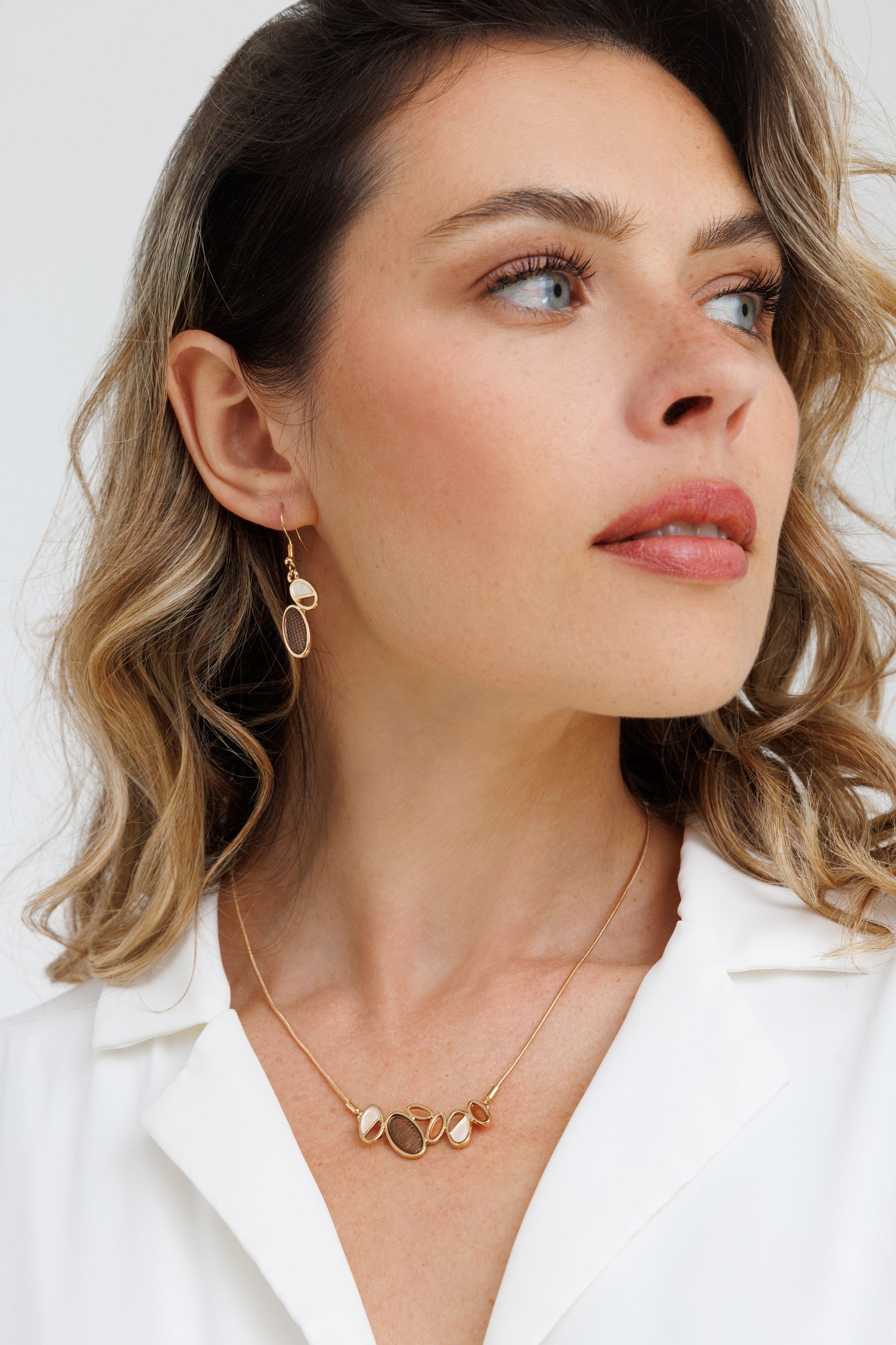 עגילי האריס גולד הם עגילי תלייה עם תליונים מעוגלים בגווני חום בשילוב אלמנט מרוקע עדין.