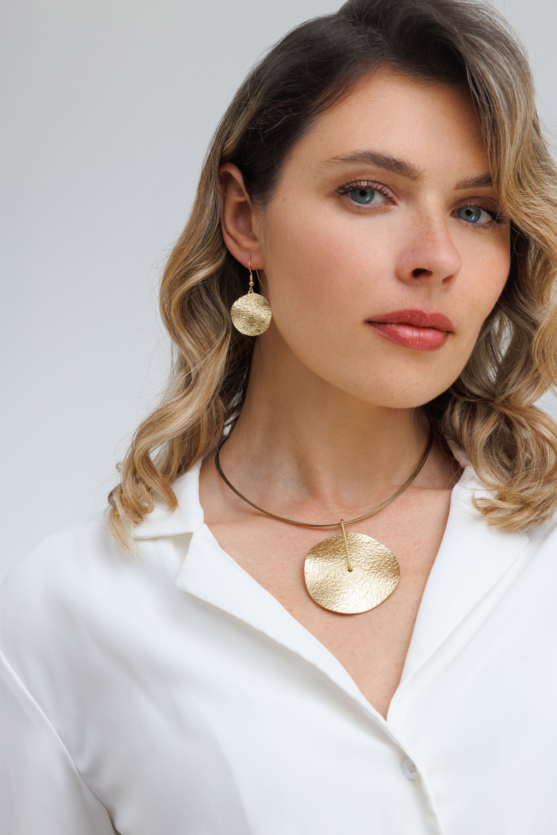 עגילי מטבע בראש הם עגילים תלויים בעיצוב מטבע בעל טקסטורה עשירה, המעניקים מסגרת מאירה ומחמיאה לפנים בכל תנועה. העגילים משלימים באופן מושלם את השרשרת התואמת ליצירת מראה יוקרתי, הרמוני ומלא נוכחות.