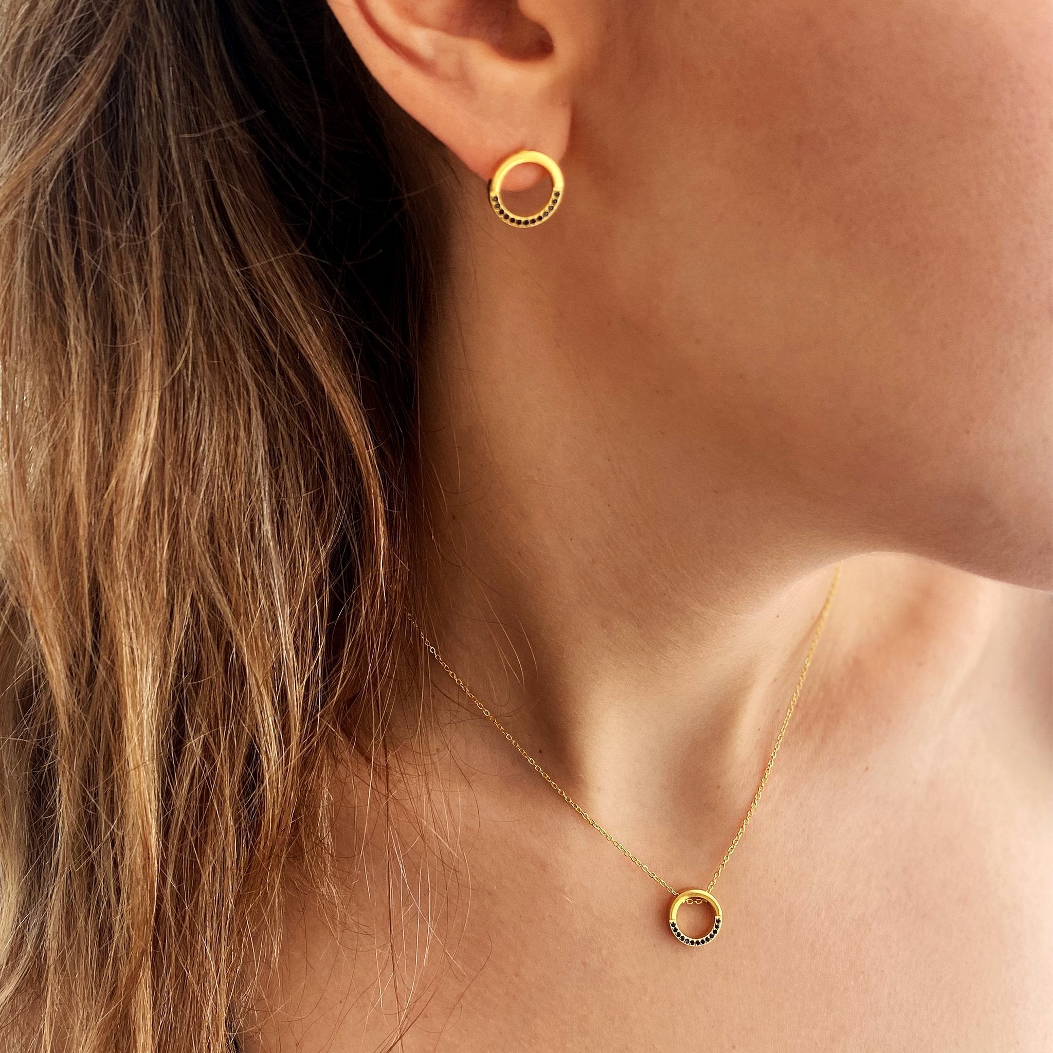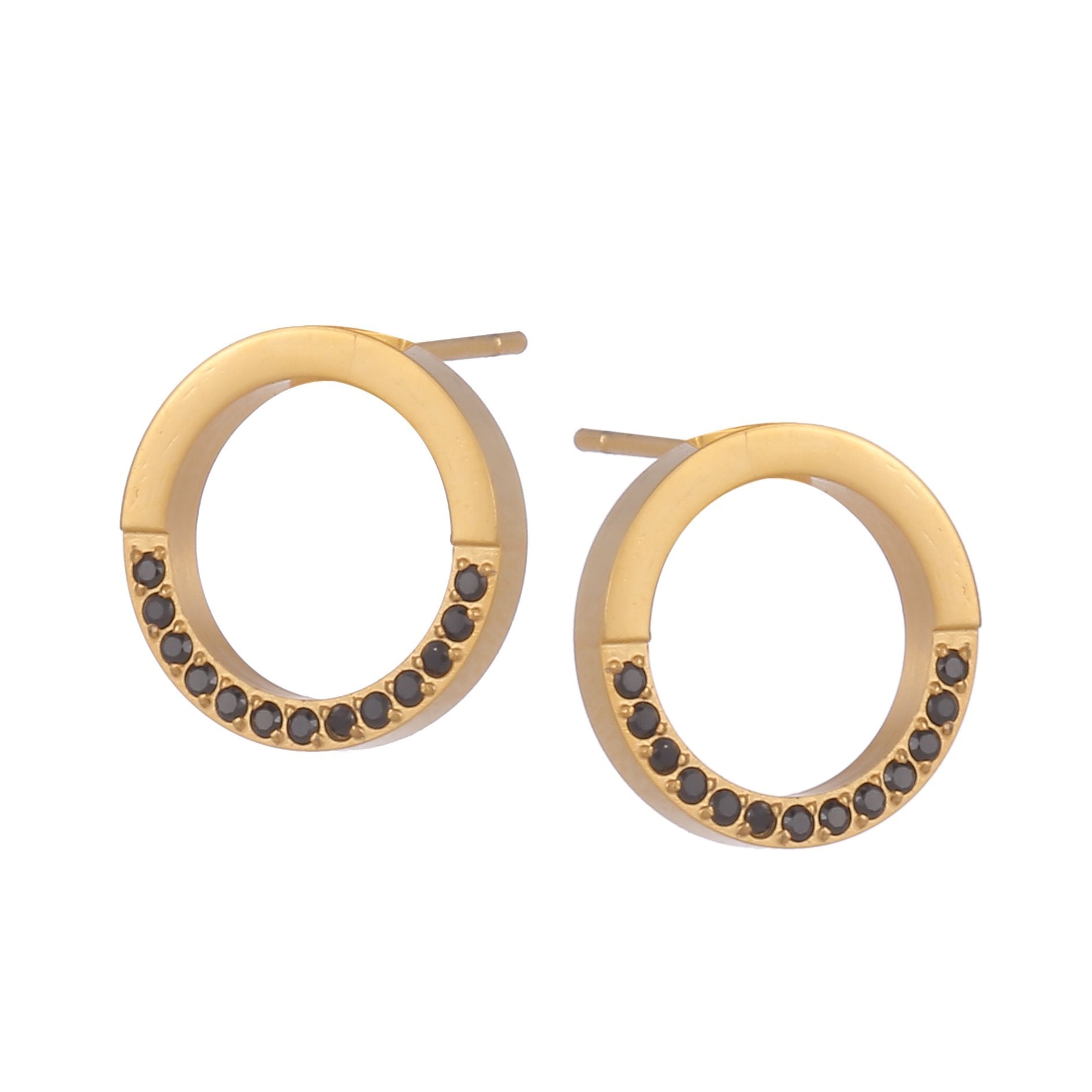 העגיל בחציו עיגול חלק ובחציו משובץ זרקונים שחורים.