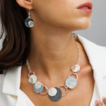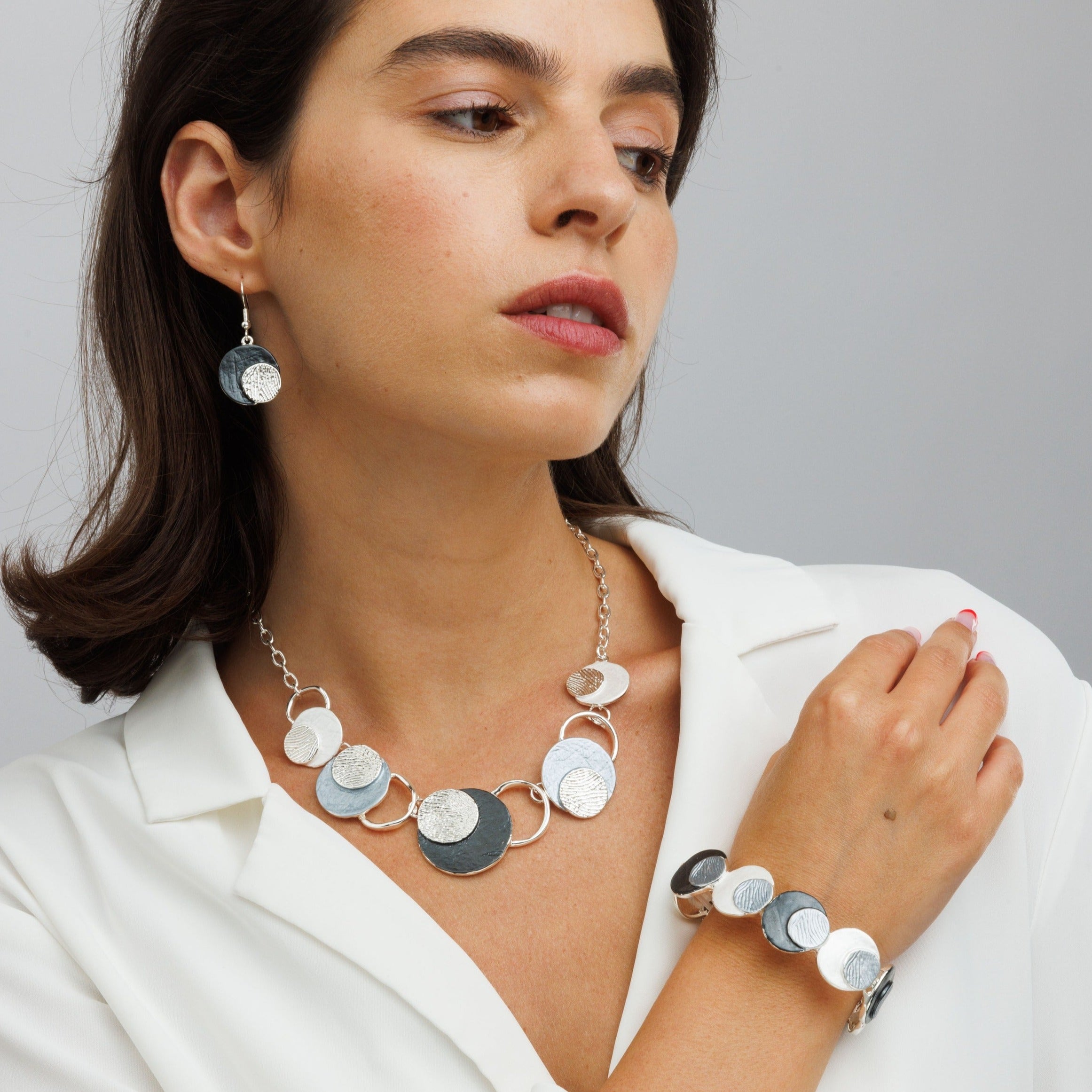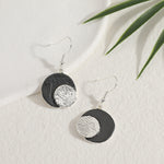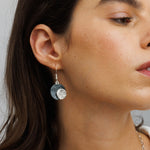 עגילי סטן הם עגילי תלייה עם אלמנט עיגול אפור רקוע ומבריק.