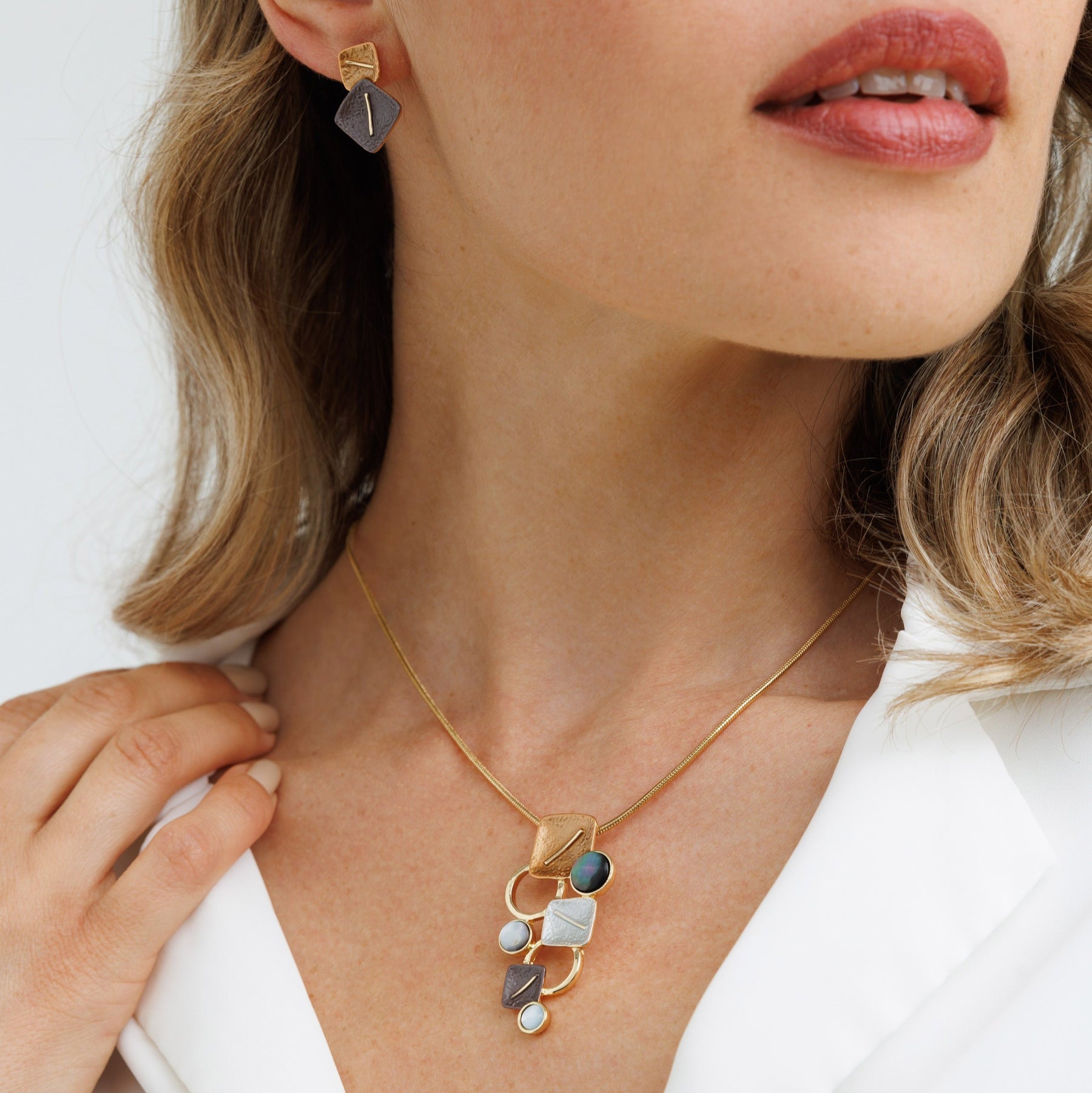 עגילי קלייר גולד הם עגילים צמודים בעיצוב קלאסי עם טוויסט של גווני חום בהיר ואפור.