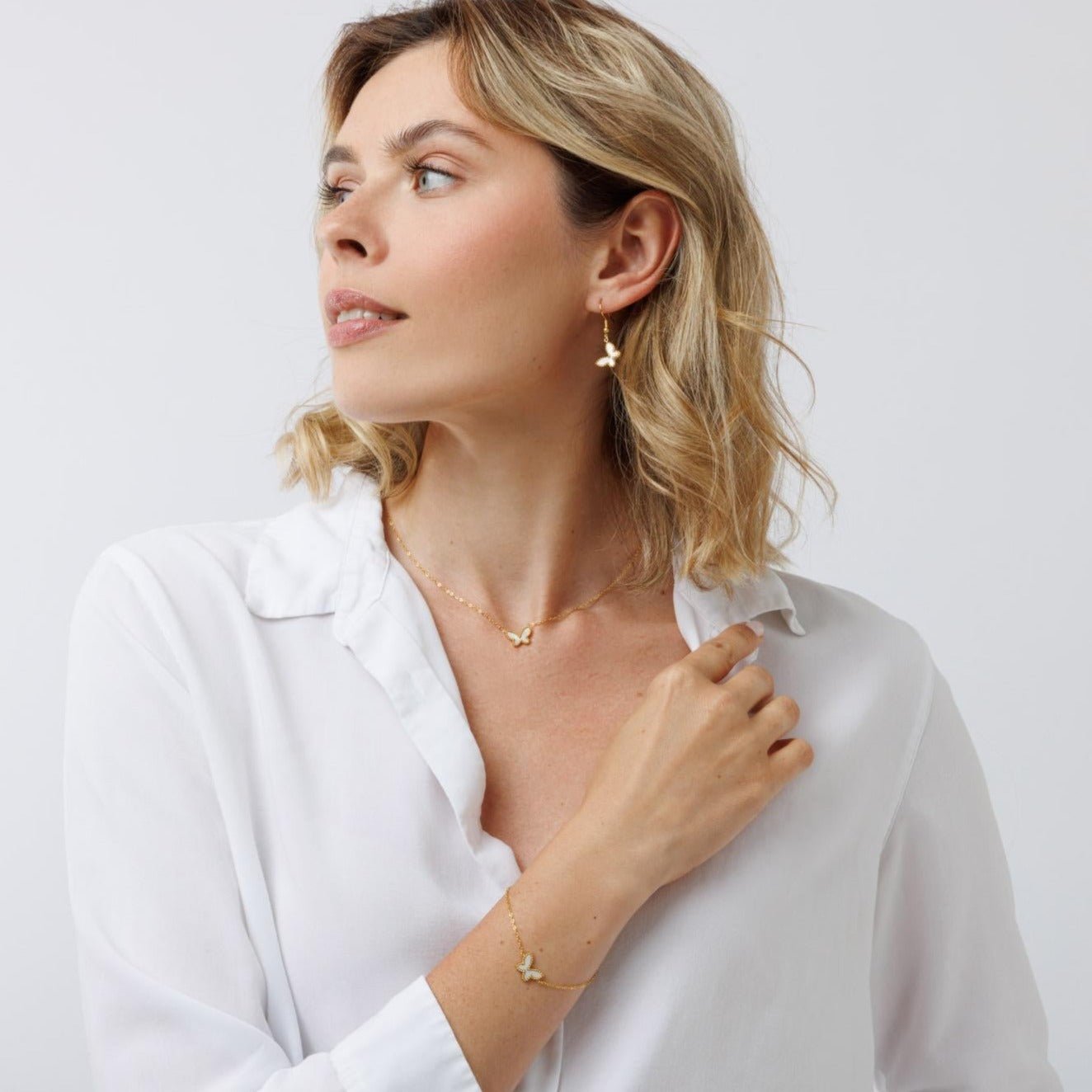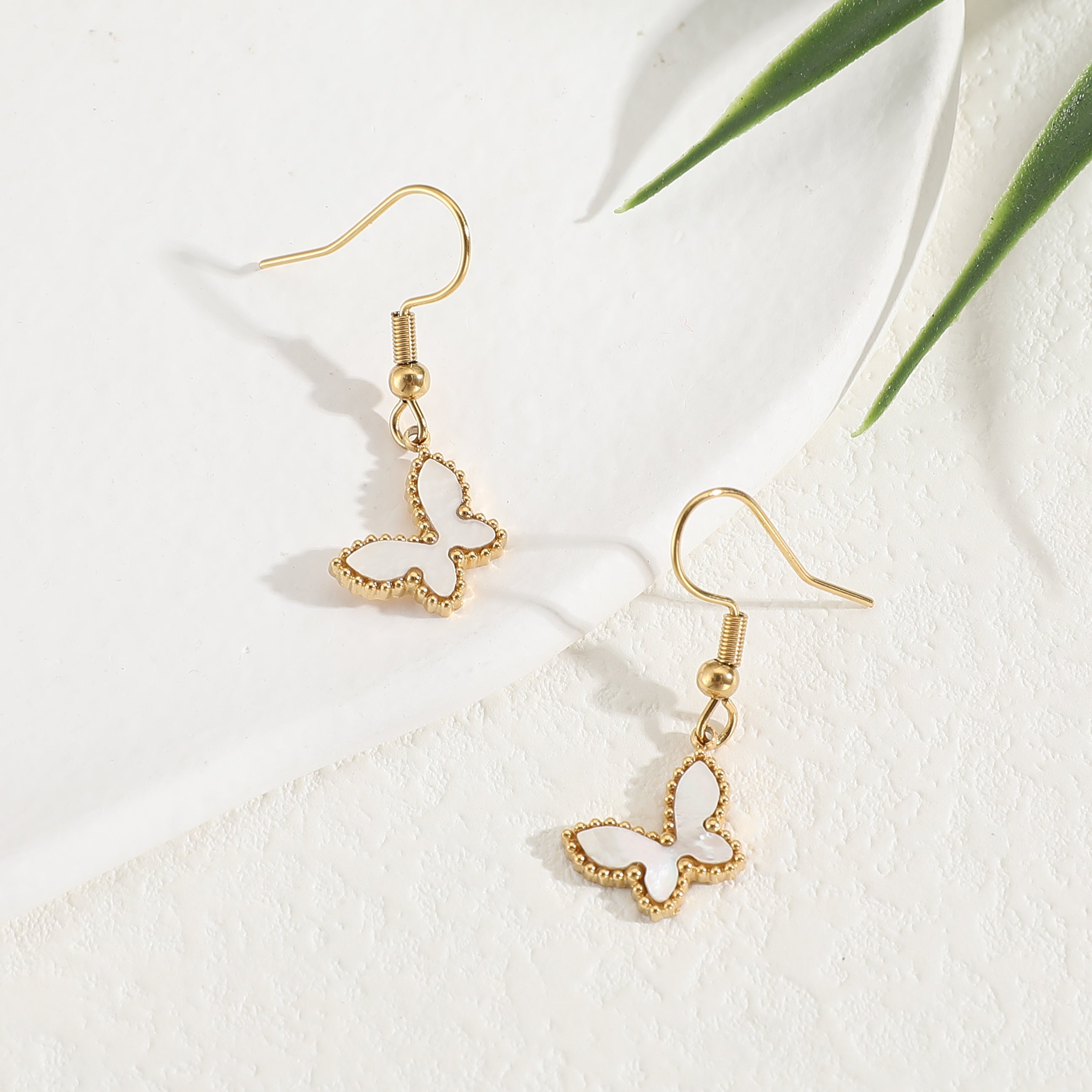 עגילי שייל פרפר הם עגילים תלויים עם תליון פרפר בשילוב צדף לבן מעוצב עדין, קלאסי ונצחי.