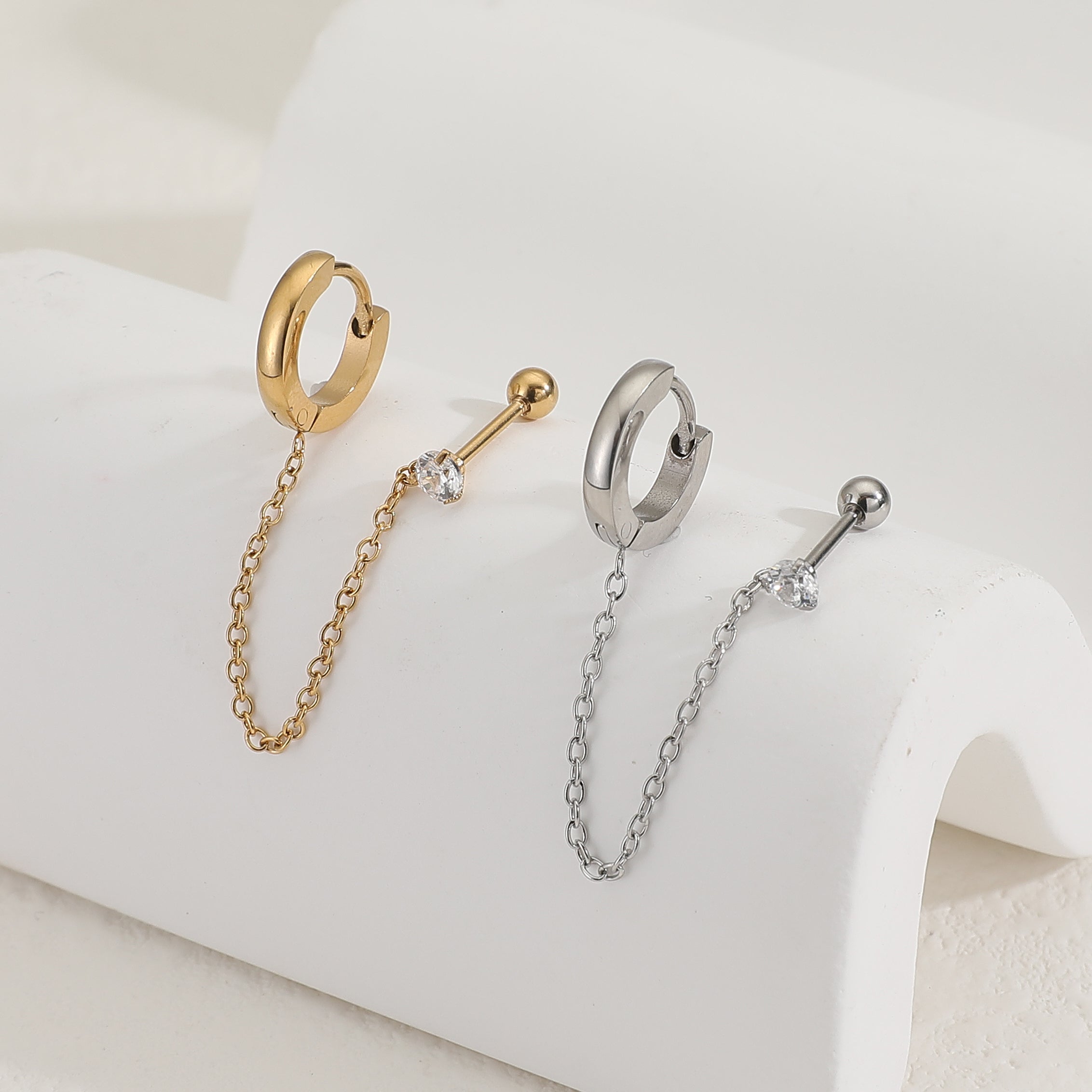 צד אחד של העגיל הוא חישוק קלאסי עם סגירת קליק, והצד השני הוא עגיל הליקס זרקון עם הברגה אחורית.