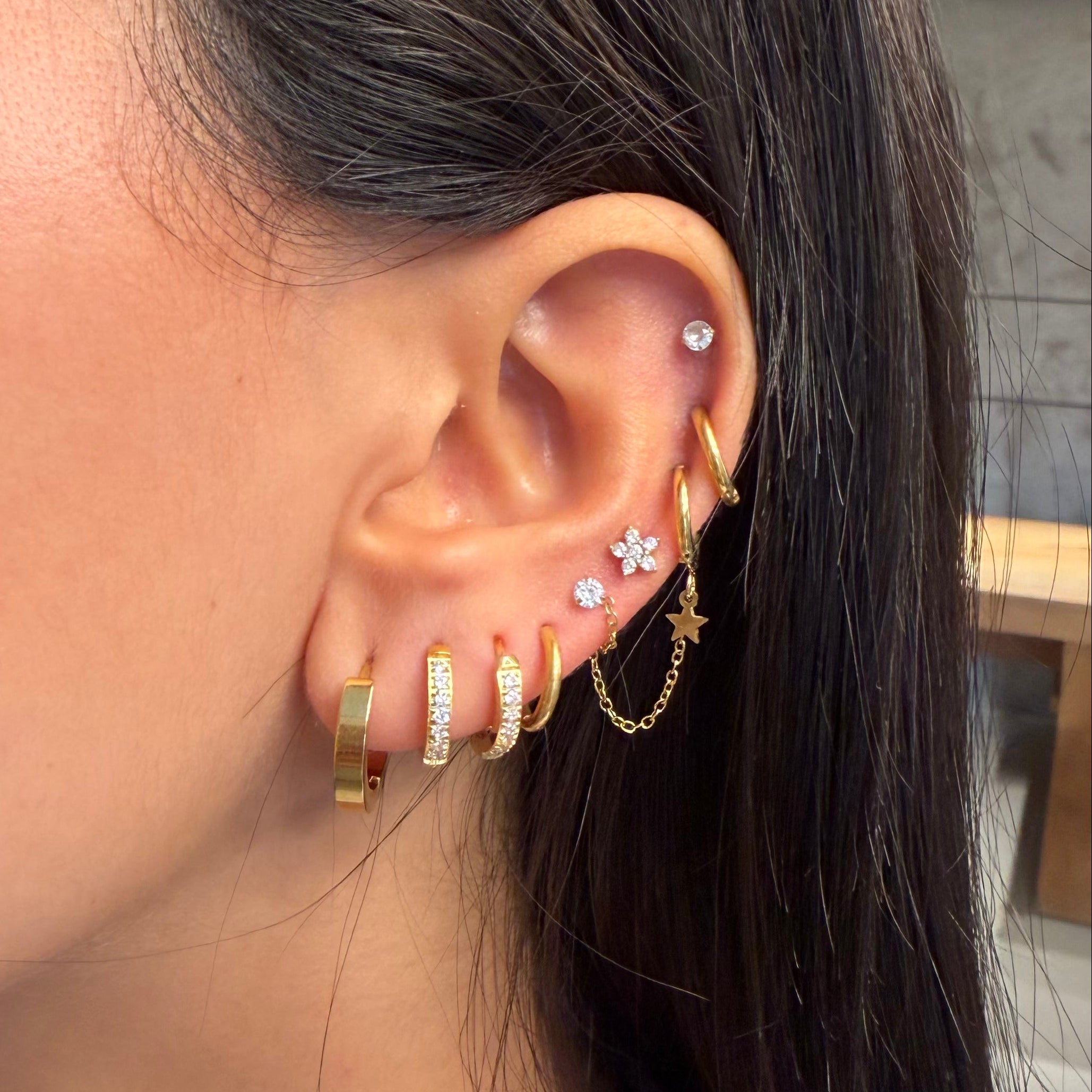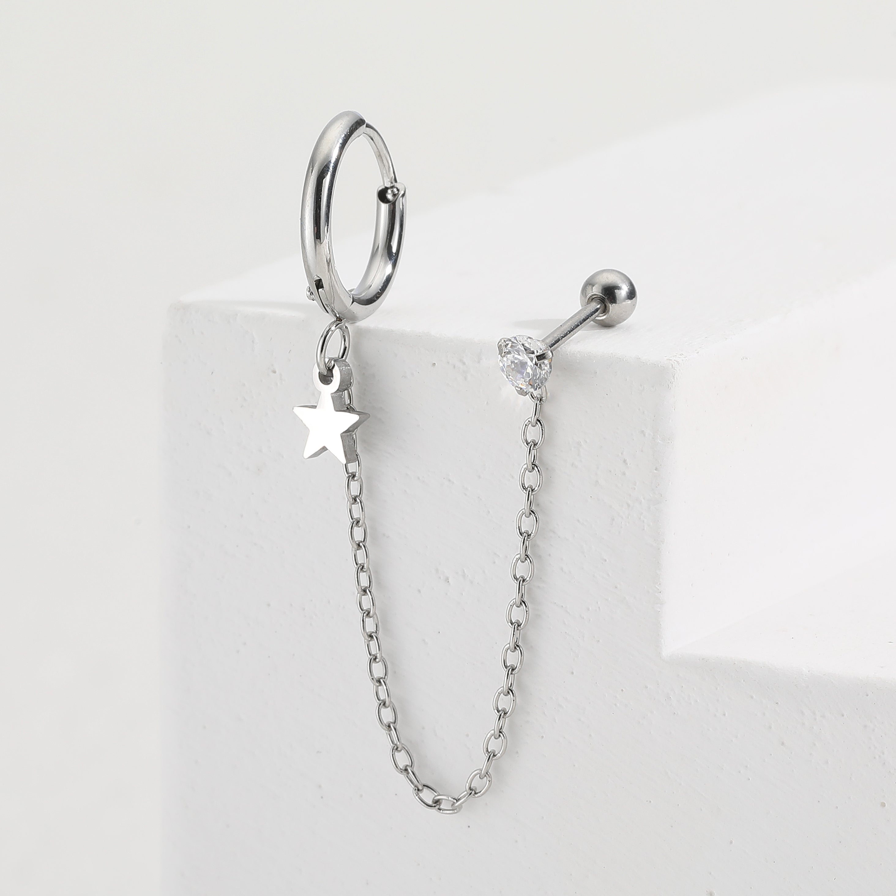 צד אחד של העגיל הוא חישוק בסגירת קליק עם תליון כוכב קטן, והצד השני הוא עגיל זרקון שמתאים גם להליקס וגם לחור רגיל עם הברגה אחורית (או סוגר סיליקון למי שמעדיפה).