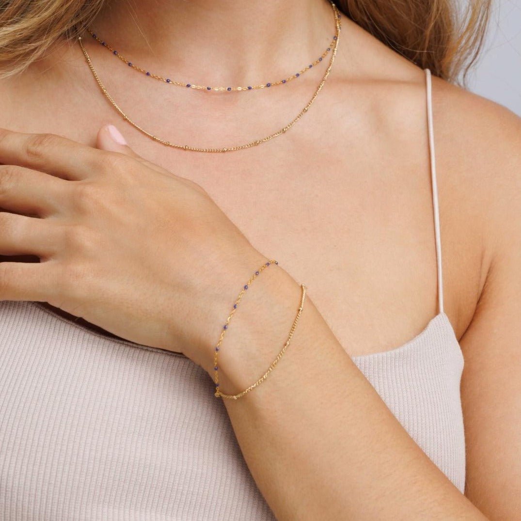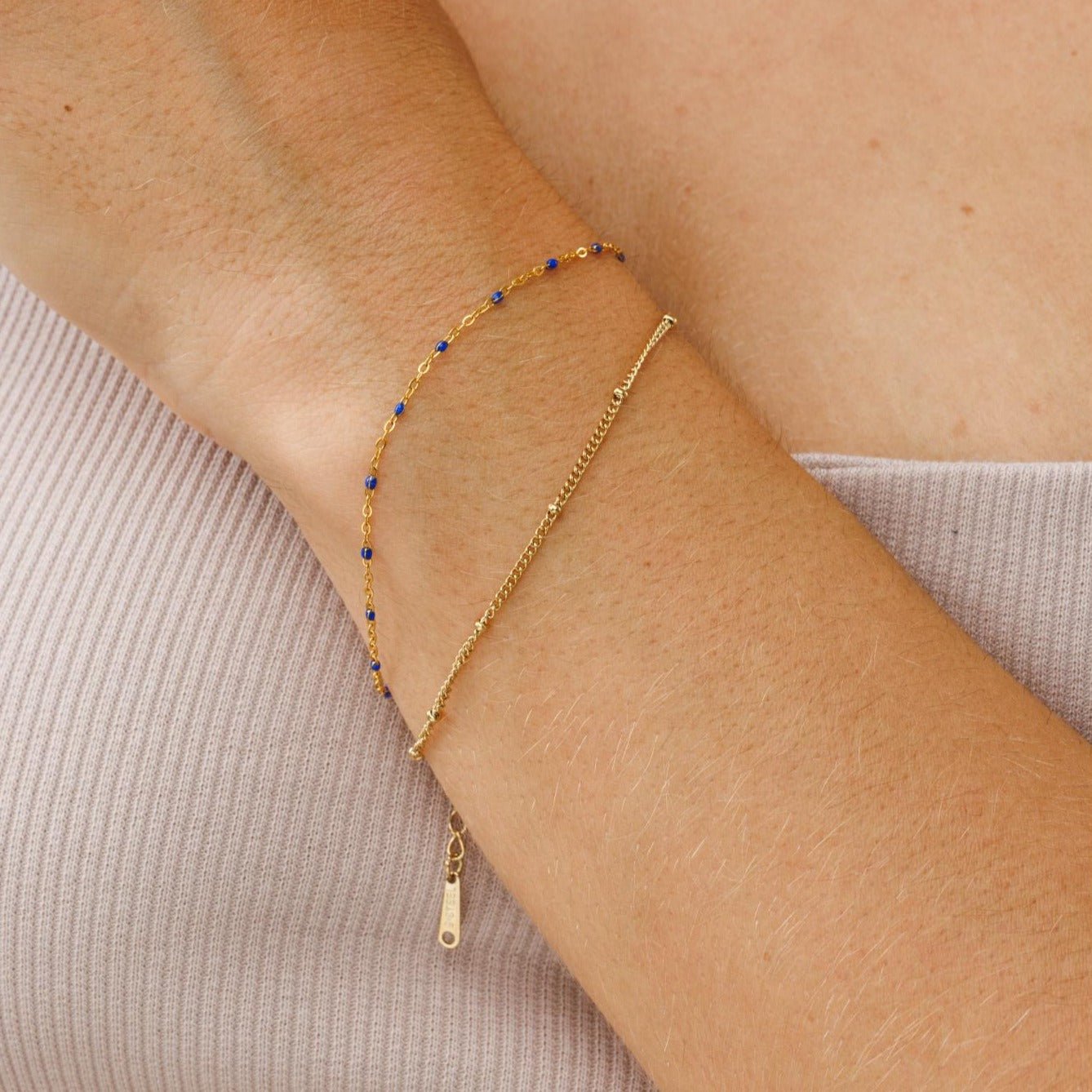 הצמיד מורכב משורה בשילוב חרוזים בצבע כחול ובשורה ארוכה יותר שיוצרות יחדיו מראה שכבות מושלם.