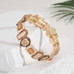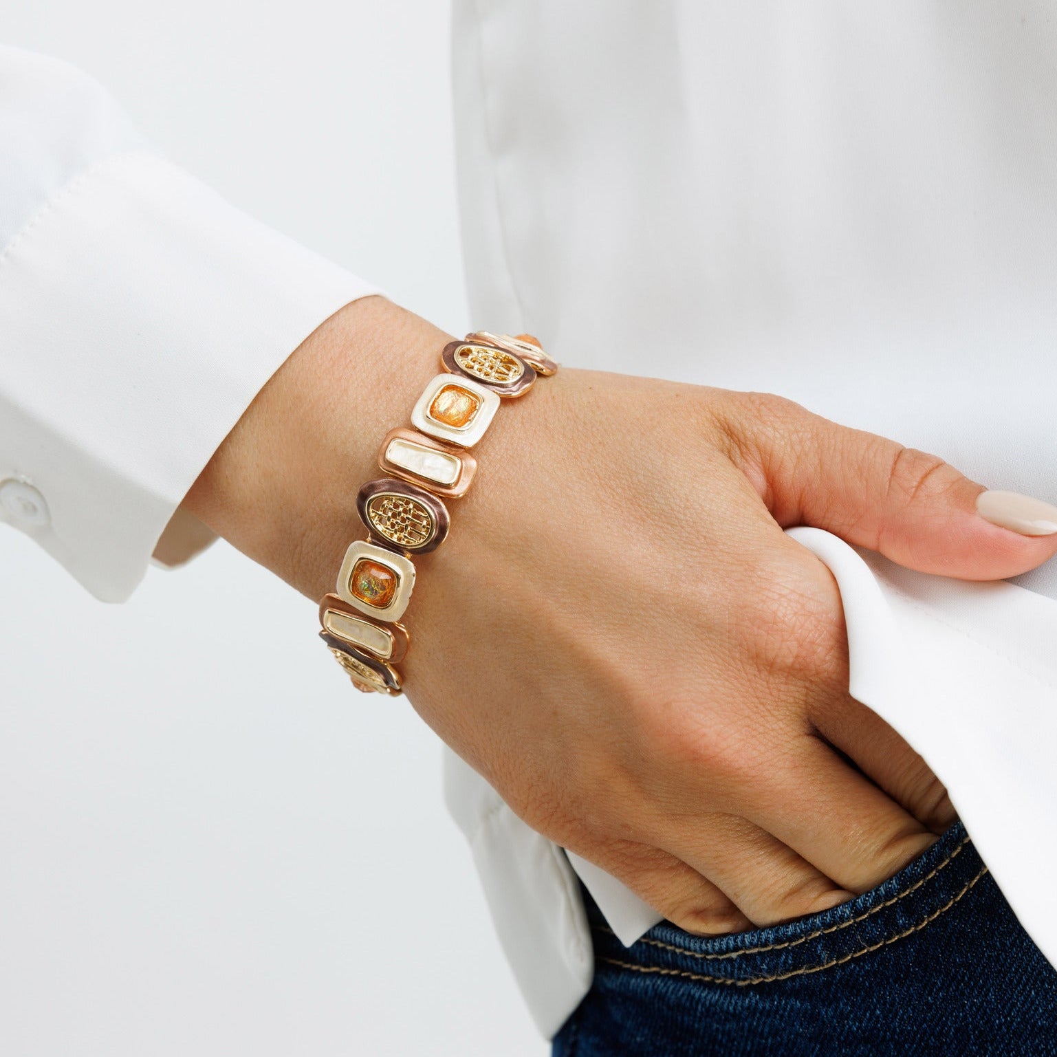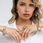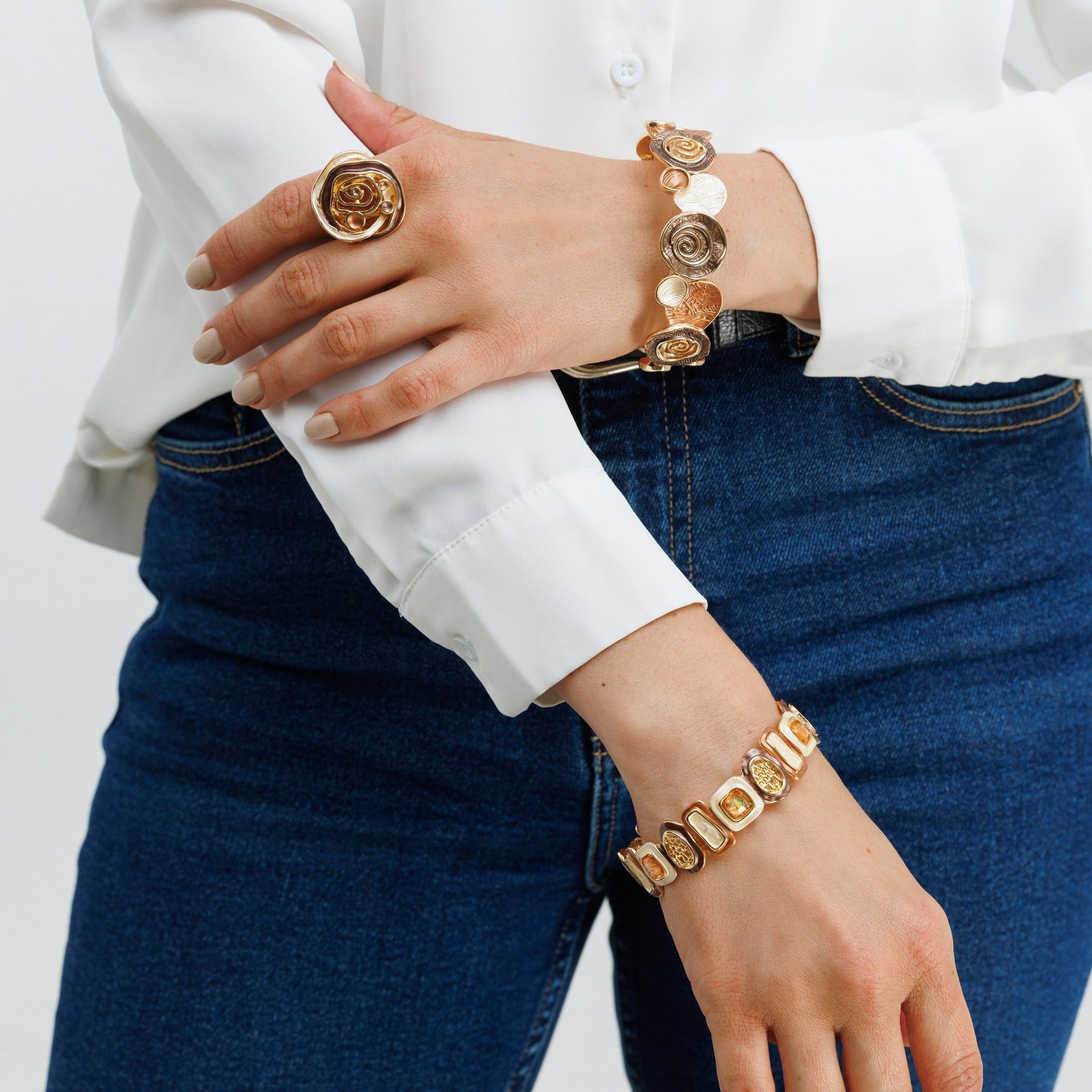 צמיד מיראל גולד הוא צמיד אלמנטים מרובעים עם נגיעות של ריקוע עדין היוצרים מראה גאומטרי ושיקי.