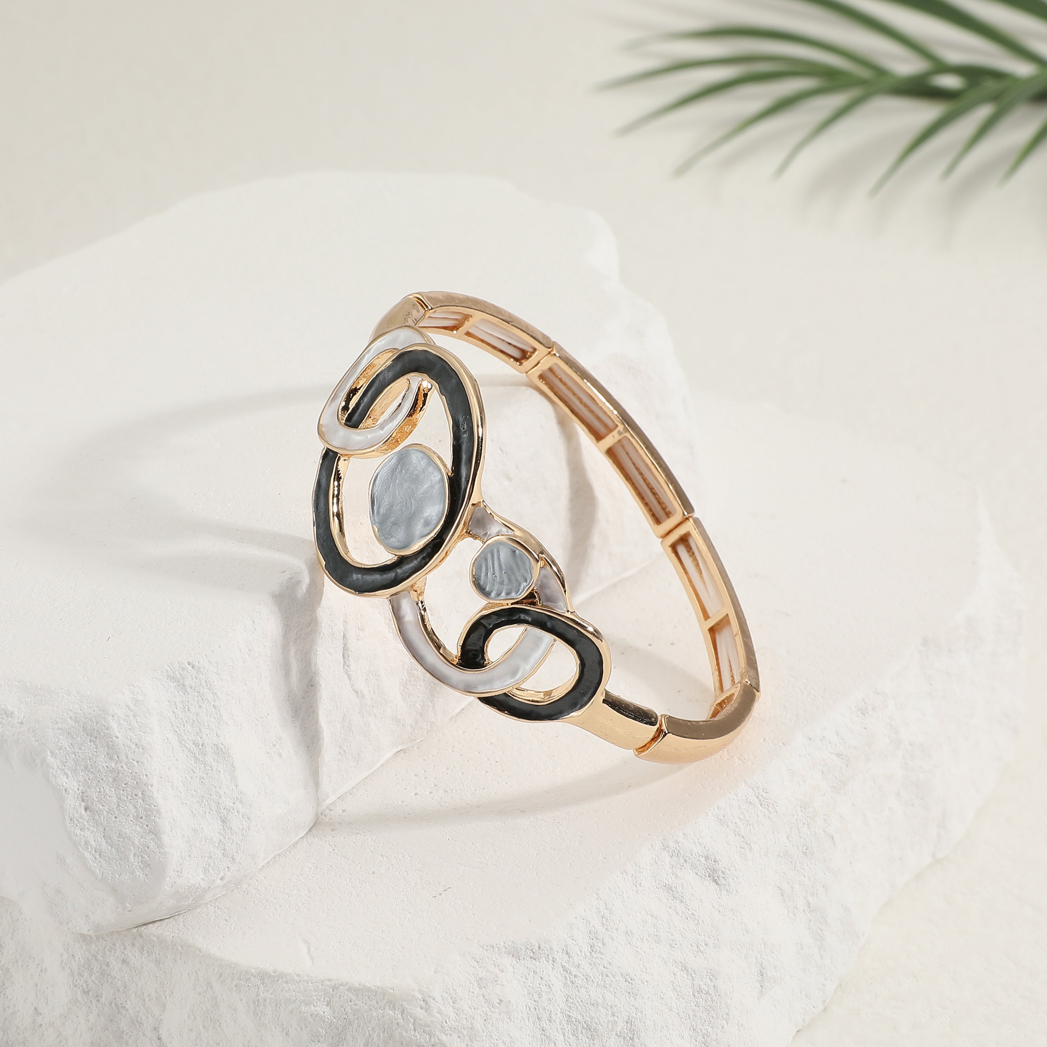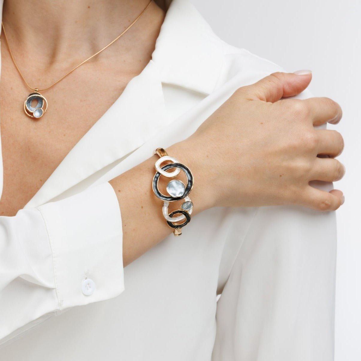 צמיד נורת גריי הוא צמיד בגווני אפור לבן עם אלמנטים עגולים מלאים וחלולים בריקוע ייחודי.