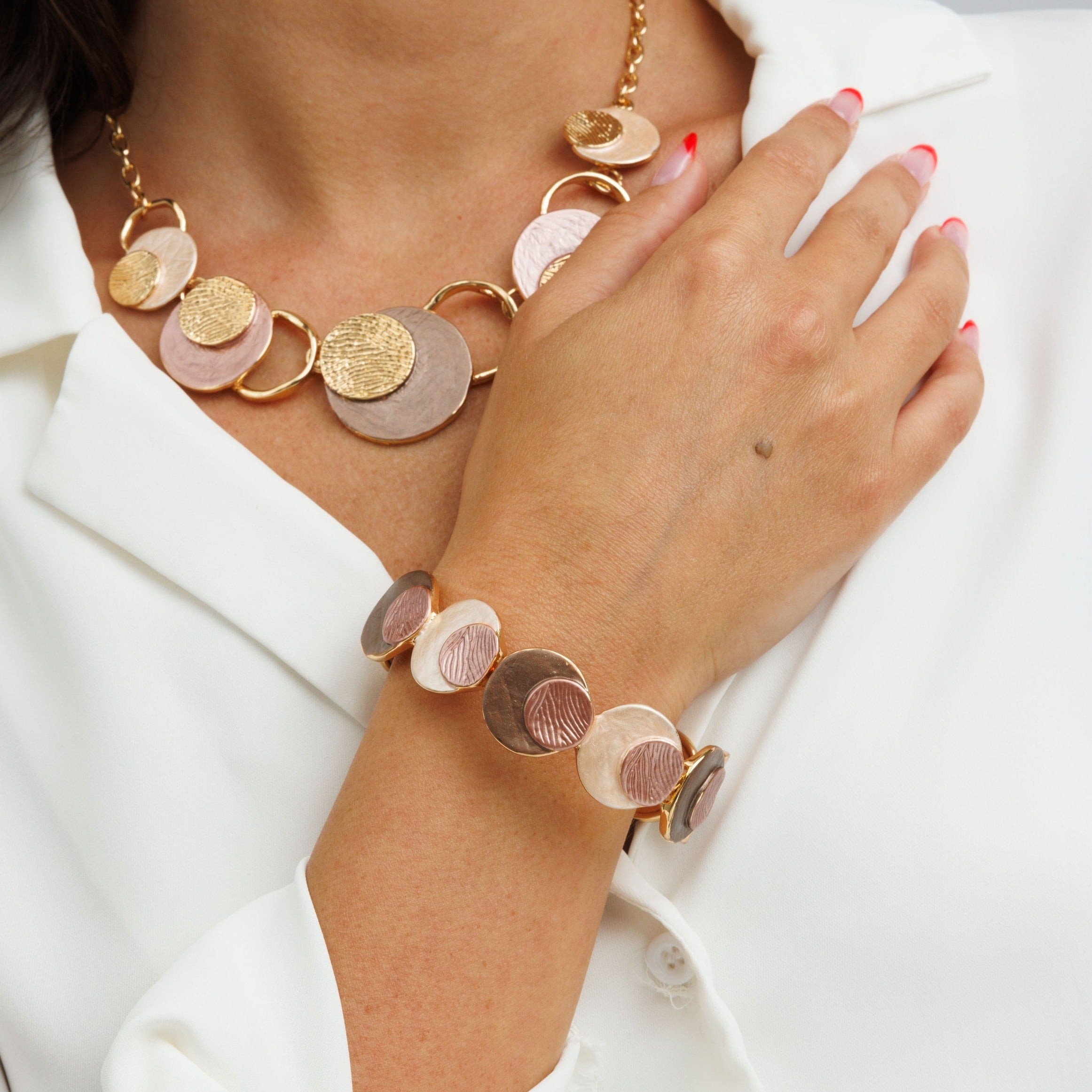 צמיד סטן הוא צמיד בגווני חום עם אלמנטים של עיגול רקוע ומבריק.