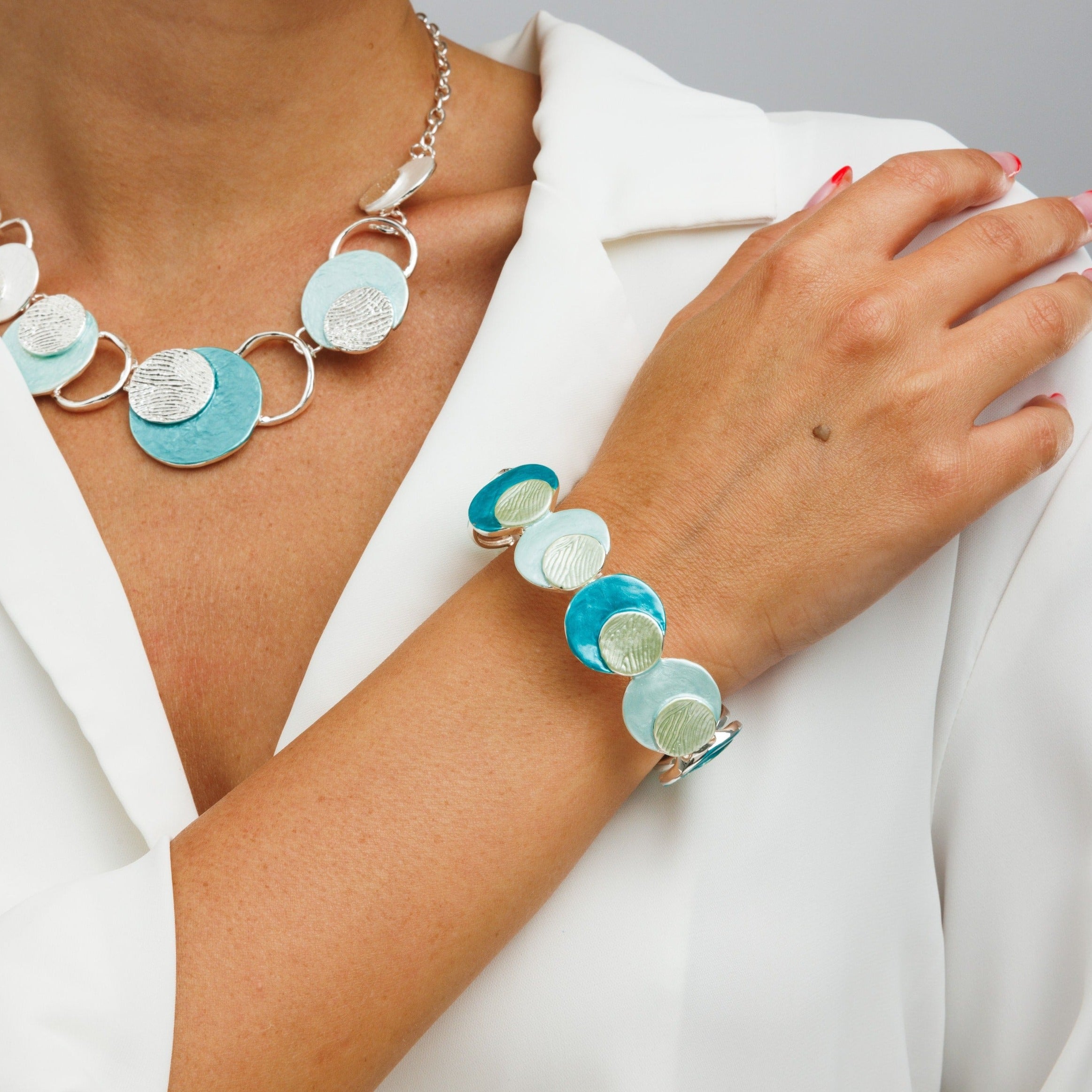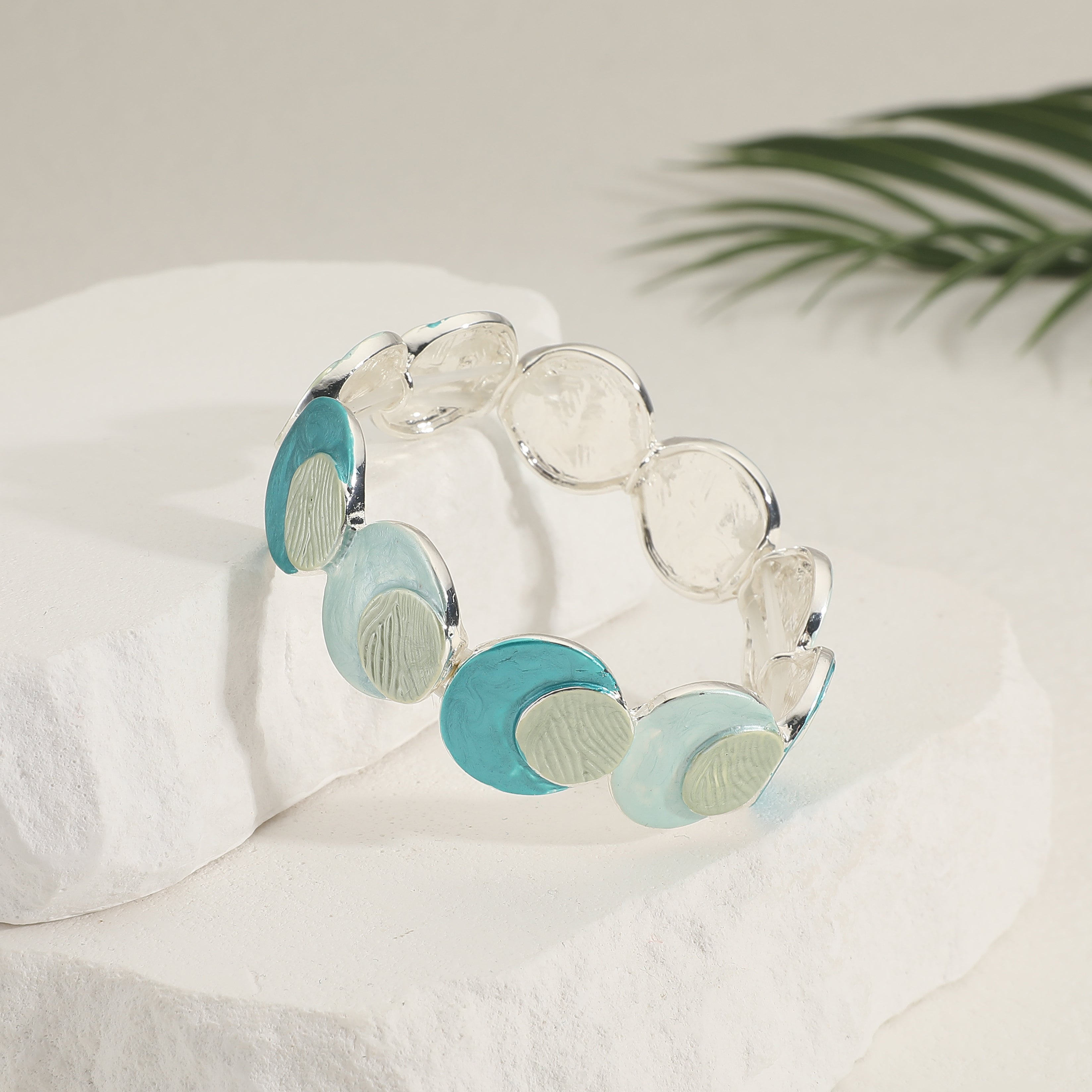 צמיד סטן הוא צמיד בגווני טורקי עם אלמנטים של עיגול רקוע ומבריק.