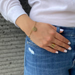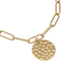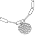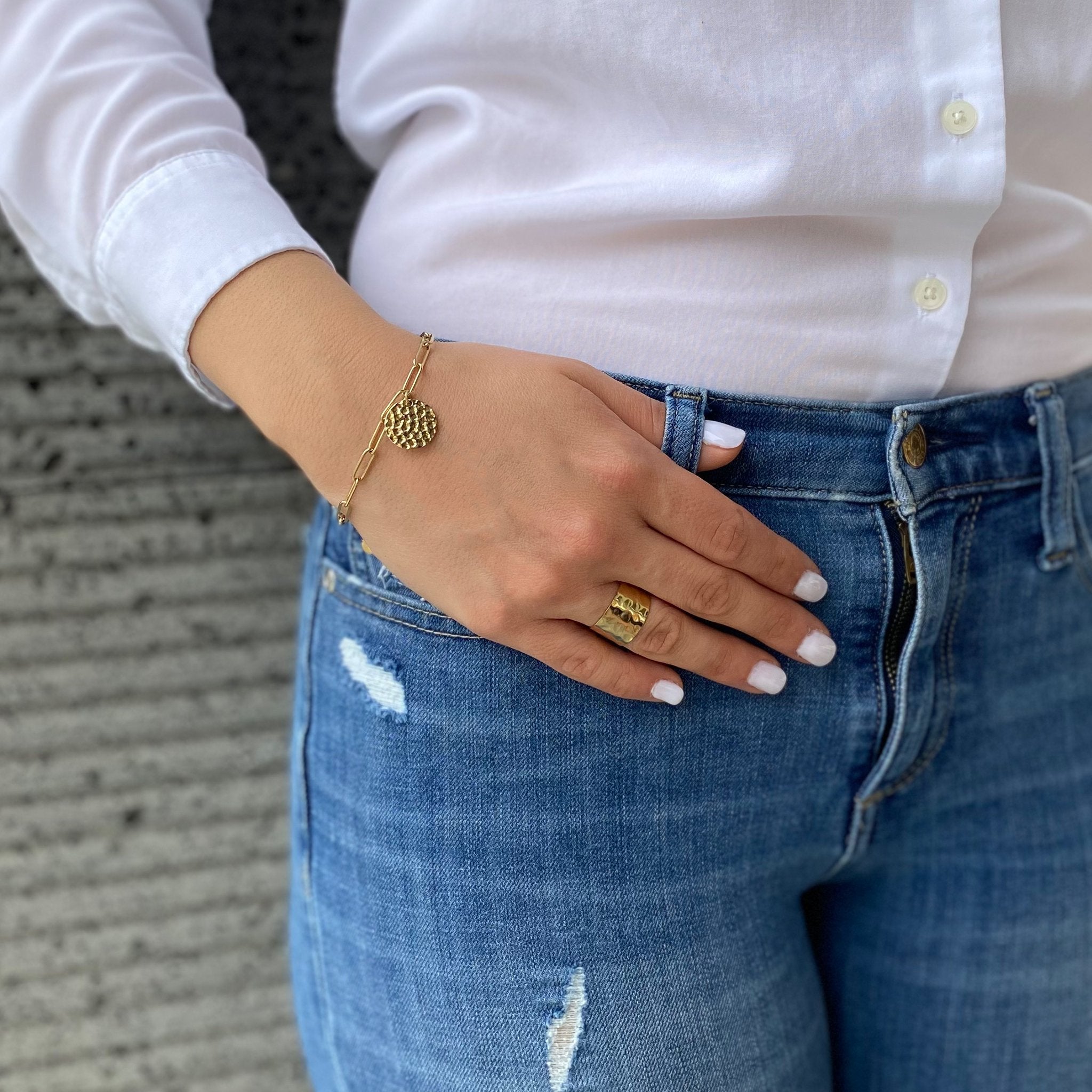 תליון הצמיד בצורת עיגול מרוקע קלאסי עם טוויסט ריקוע ייחודי.