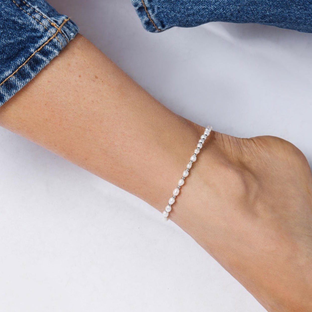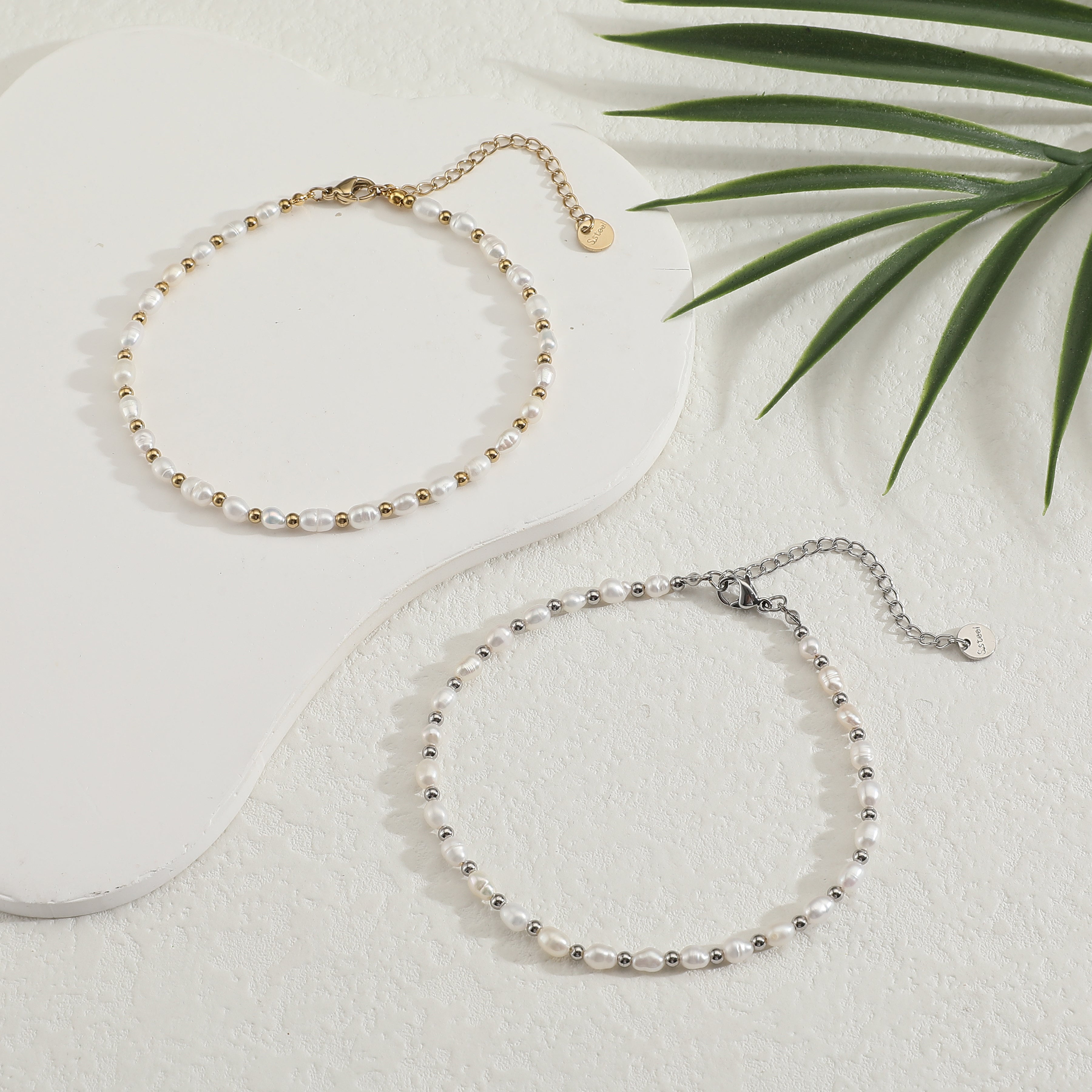 צמיד רגל פנינים דק, עדין וקלאסי בשילוב עיגולים עדינים למראה קלאסי ונקי.