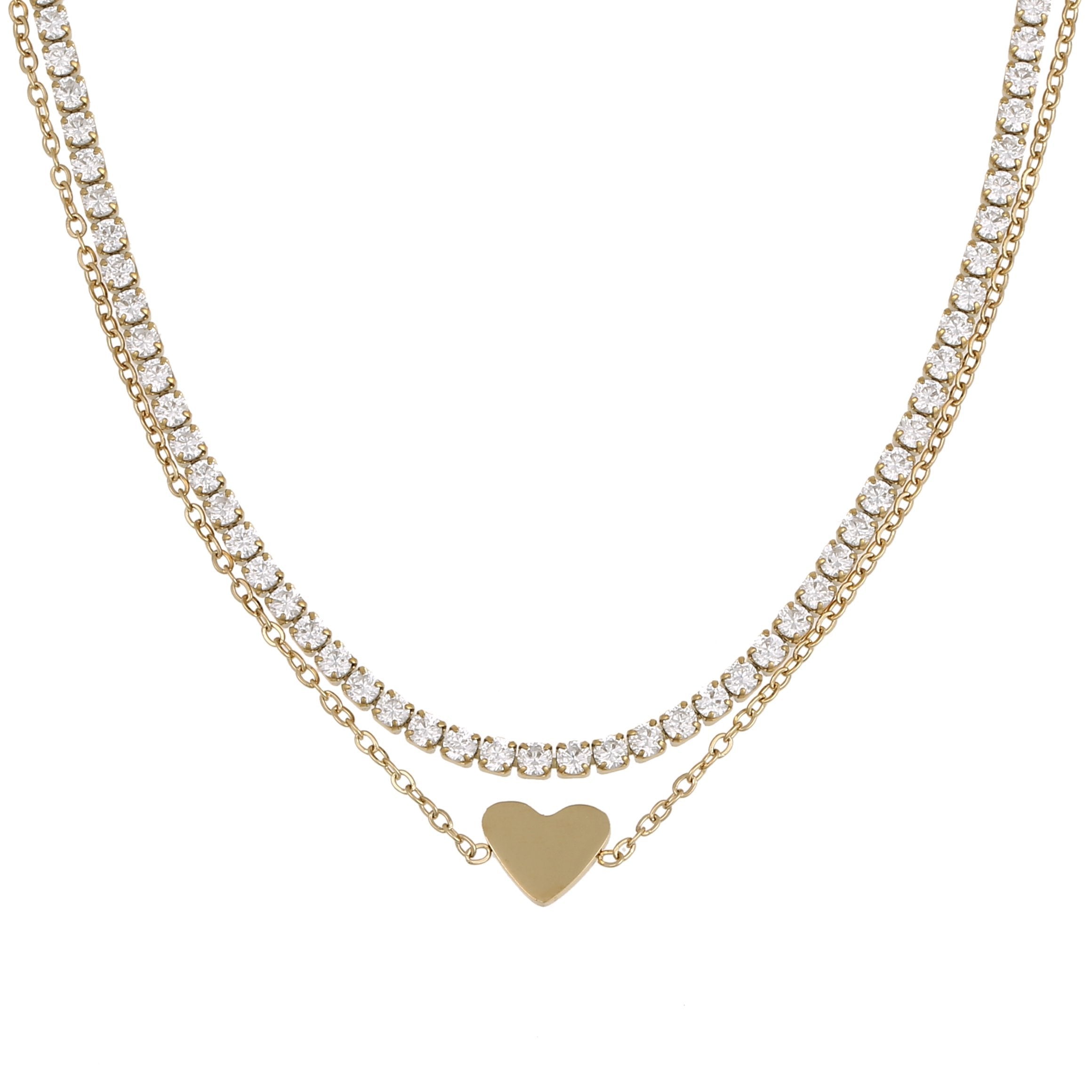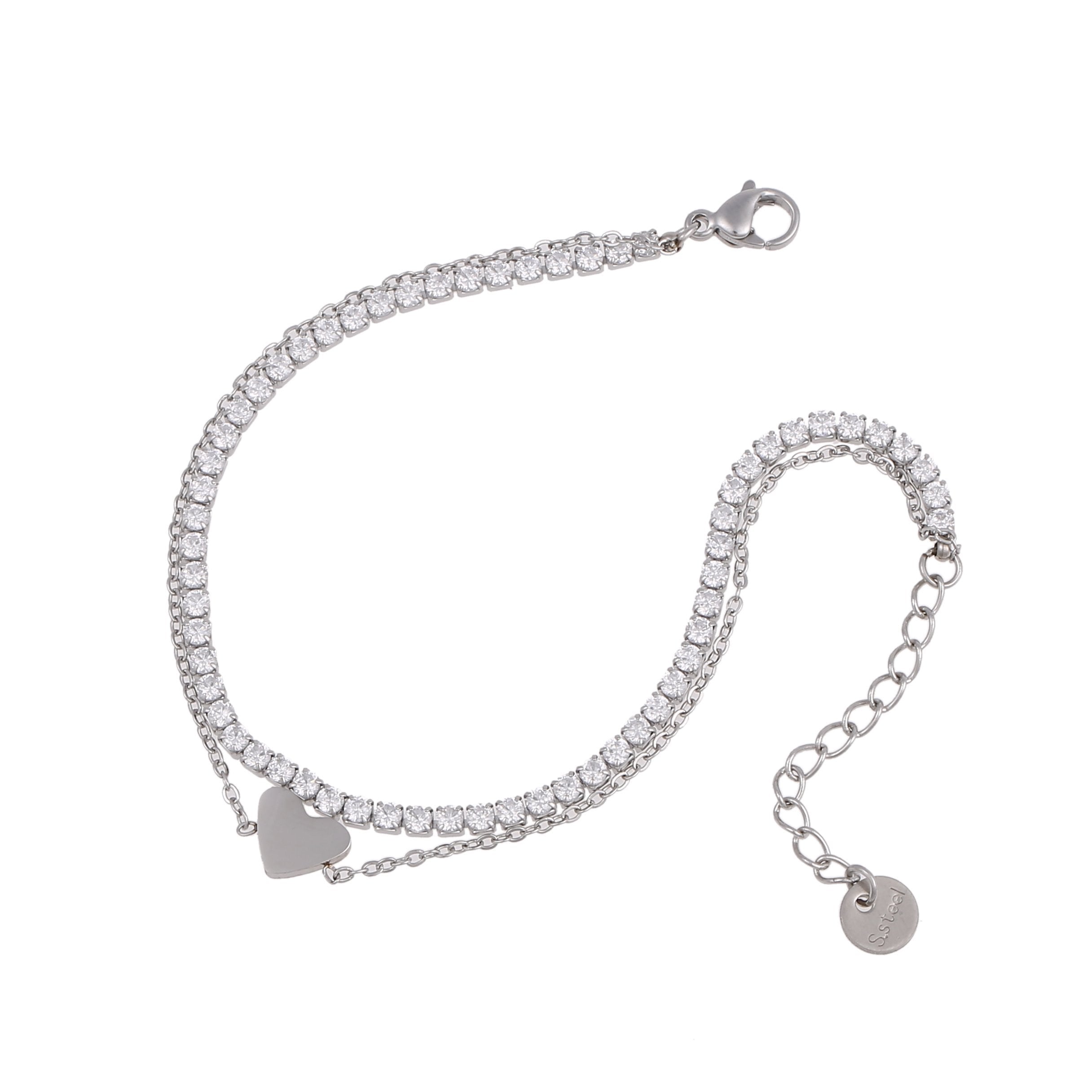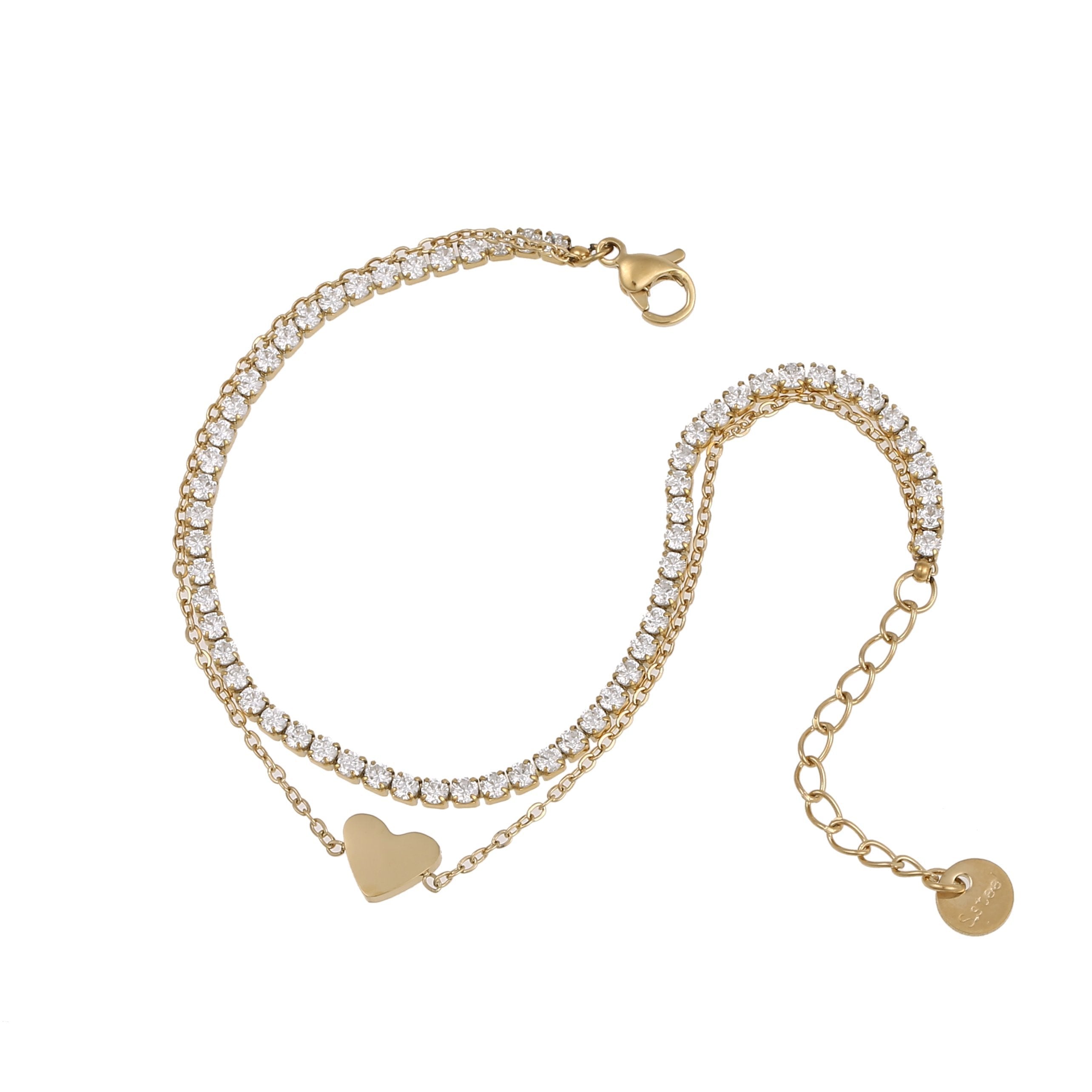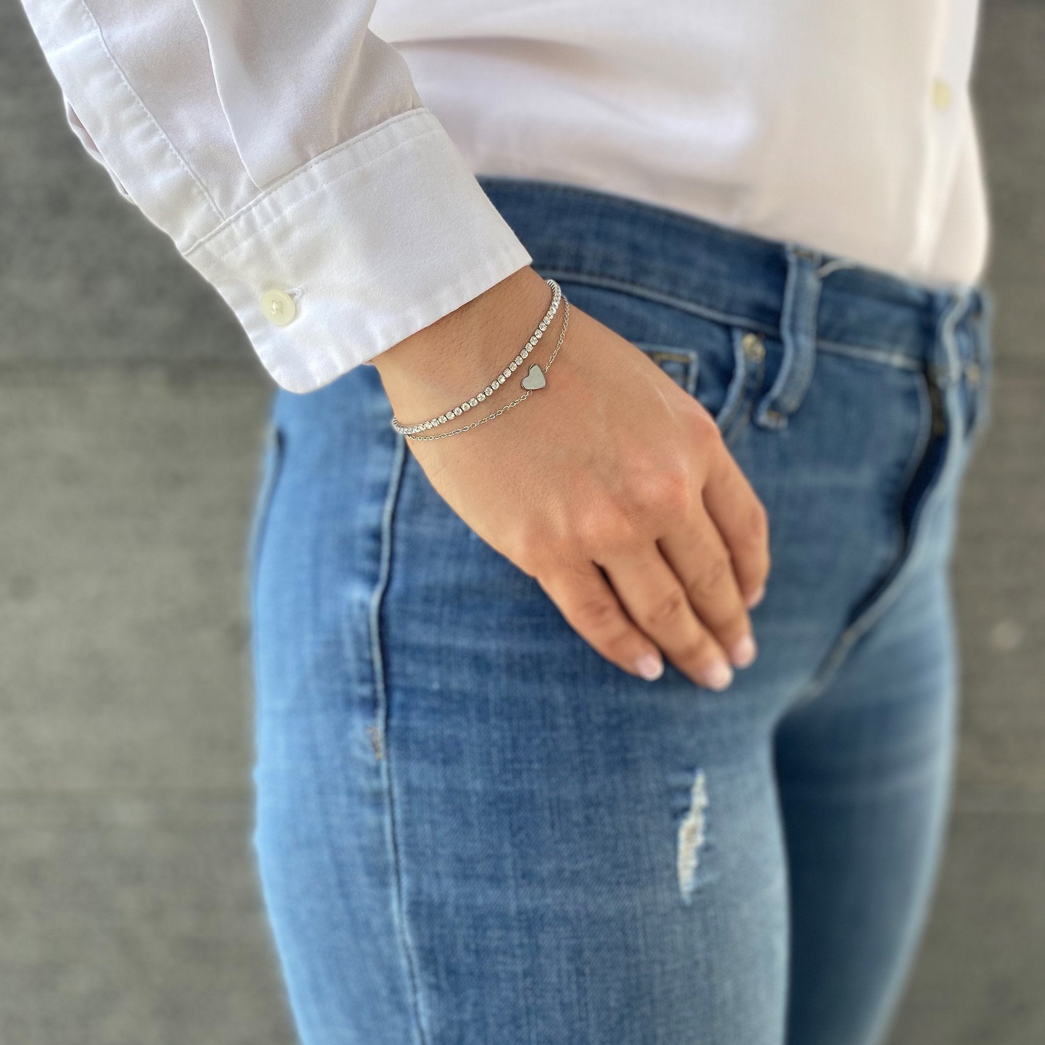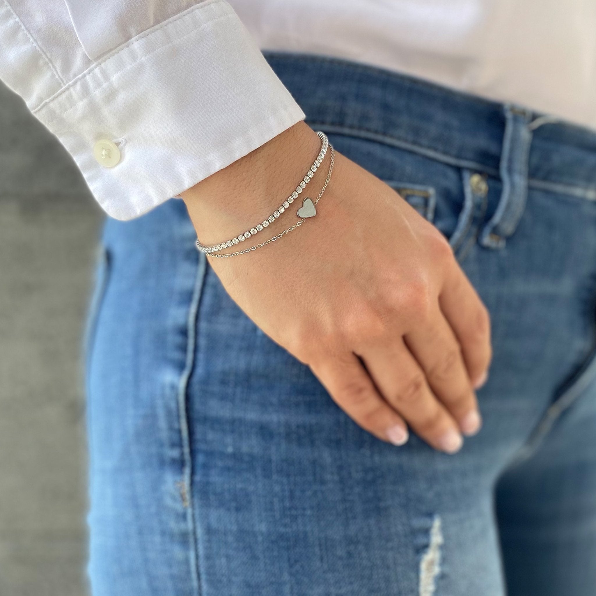 צמיד כפול שיין לב נותן לנו להנות מכל העולמות עם השילוב של הלב הקטן והמינימליסטי וצמיד הטניס המשובץ והקלאסי.