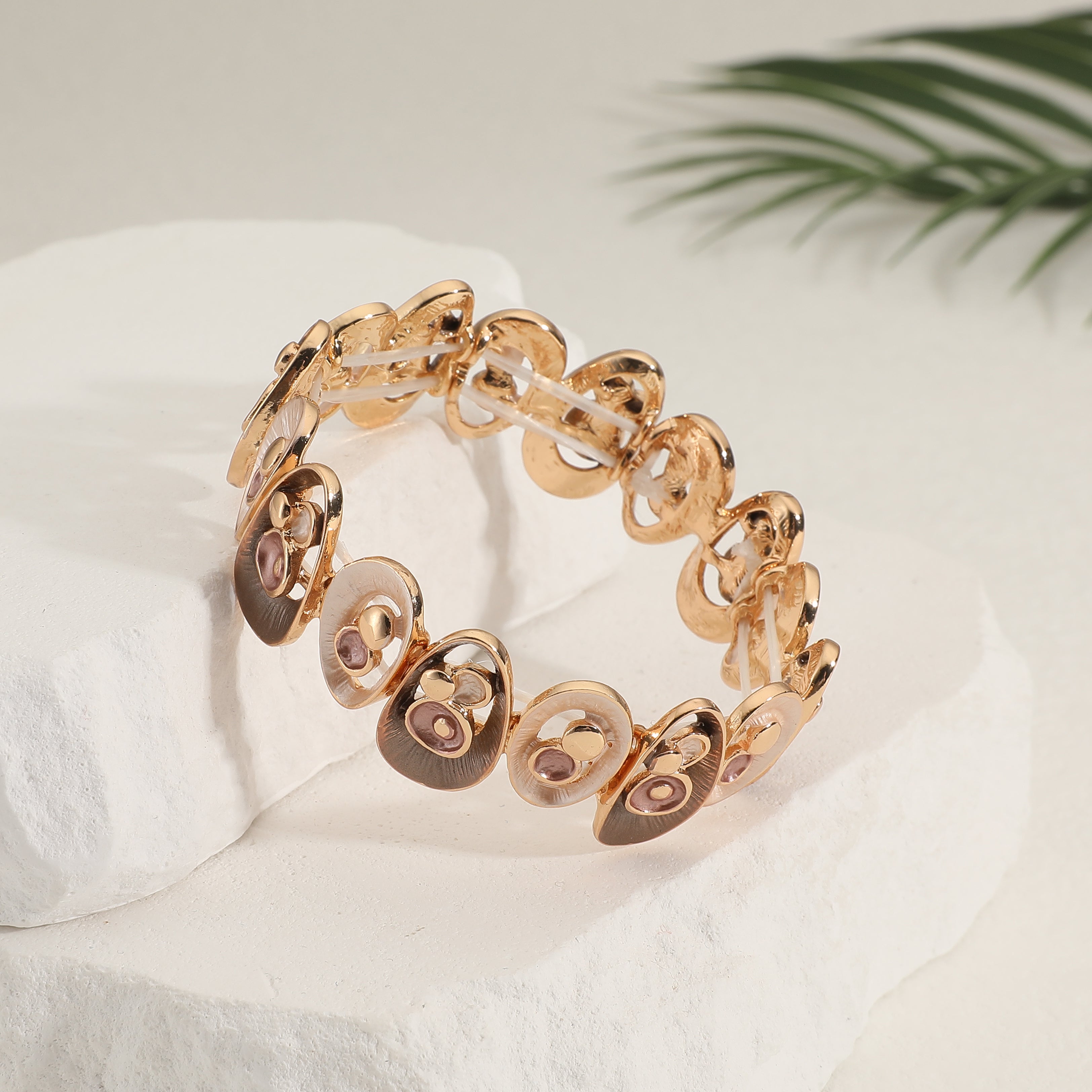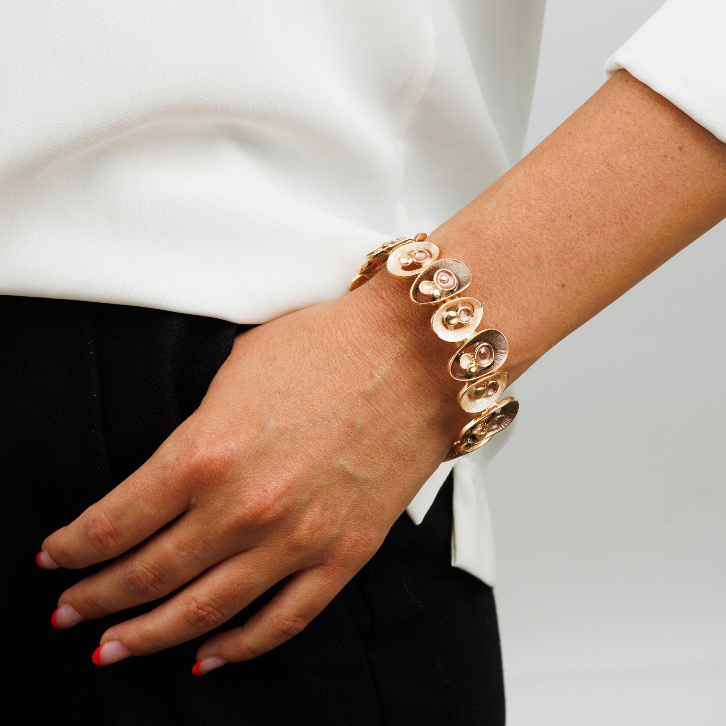 צמיד שנזי גולד הוא צמיד בגווני חום עם אלמנטים אובלים חלולים בשילוב פטרנים עגולים ייחודיים.
