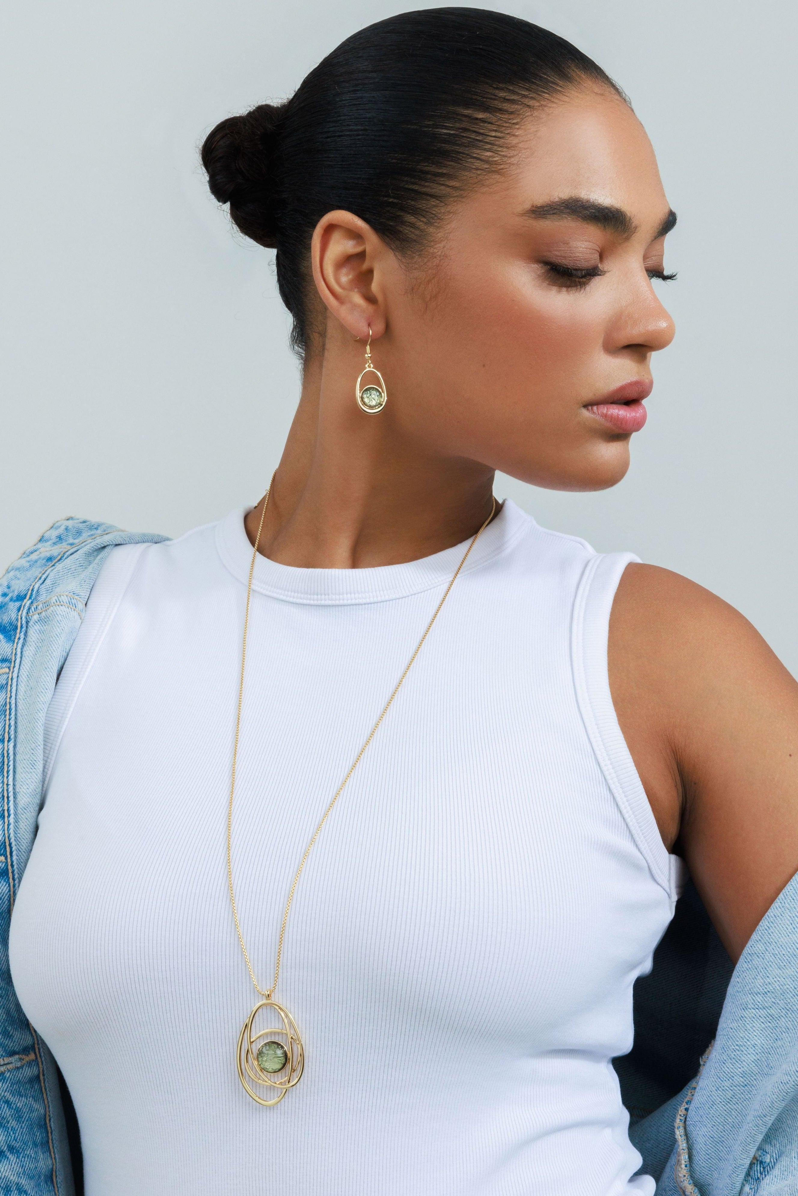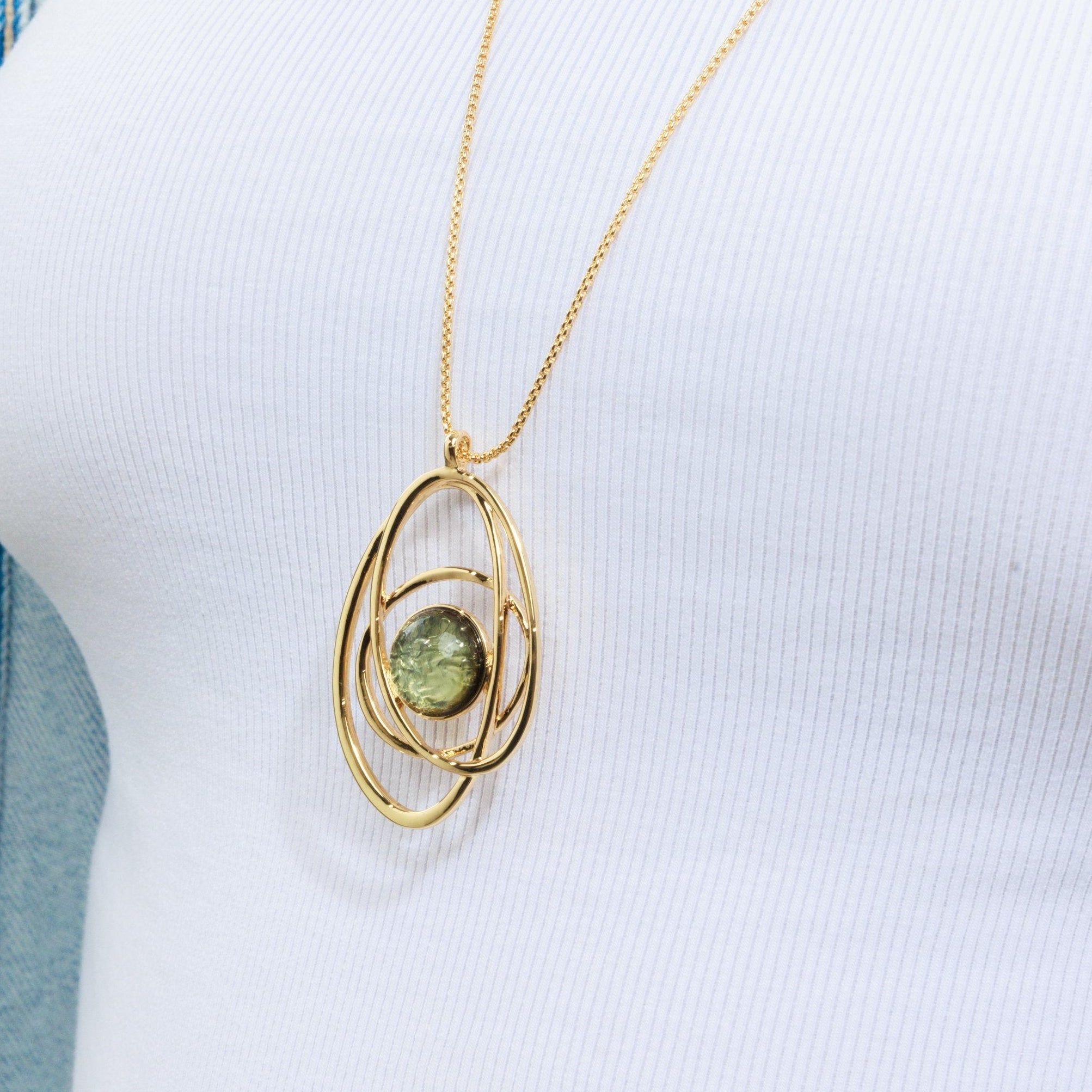 שרשרת ארוכה אלודי אוליב היא שרשרת ארוכה בעיצוב פיסולי ייחודי, המשלבת תליון מעגלים א-סימטריים סביב דמוי אבן מרכזית בגוון ירוק זית מהמם.