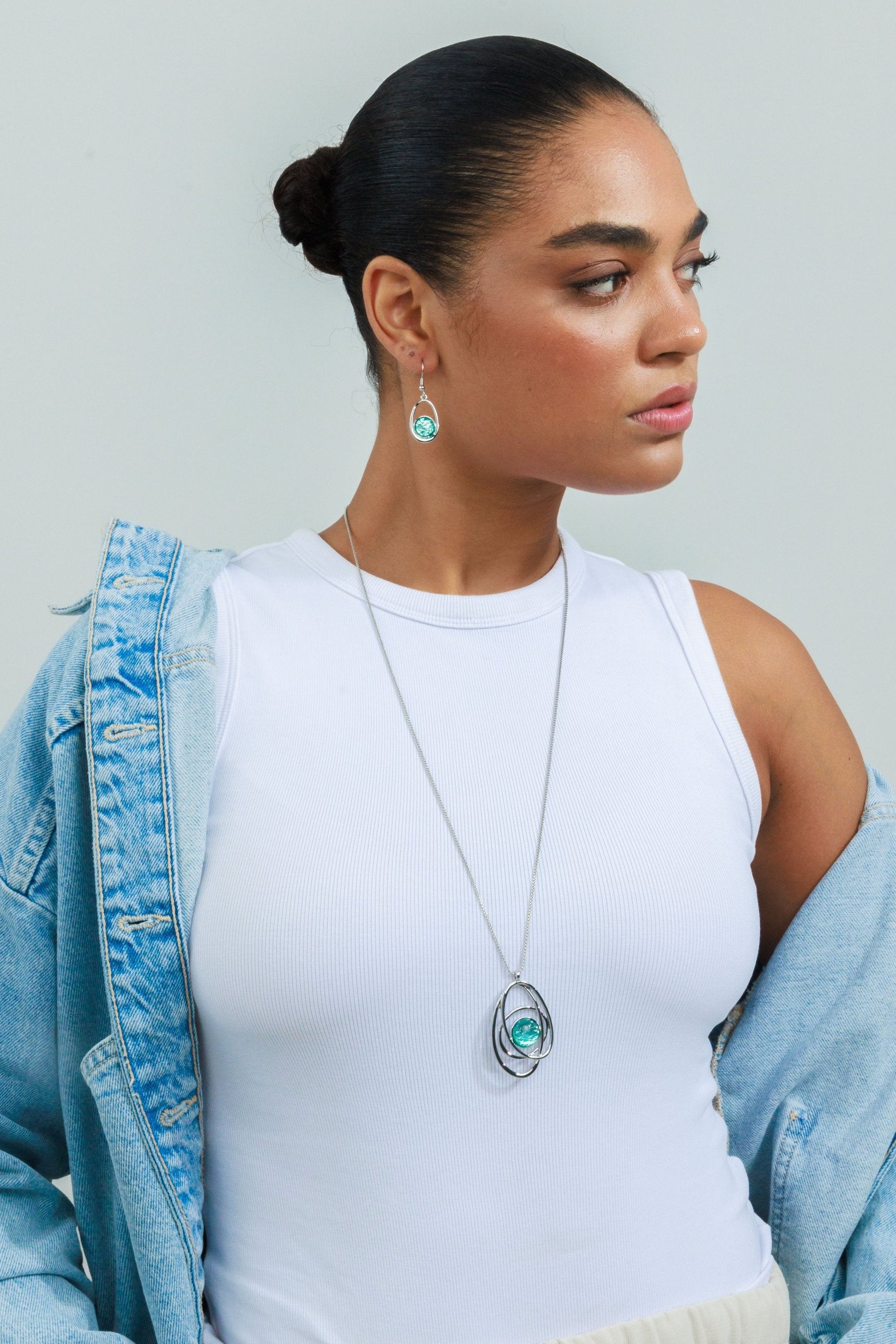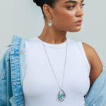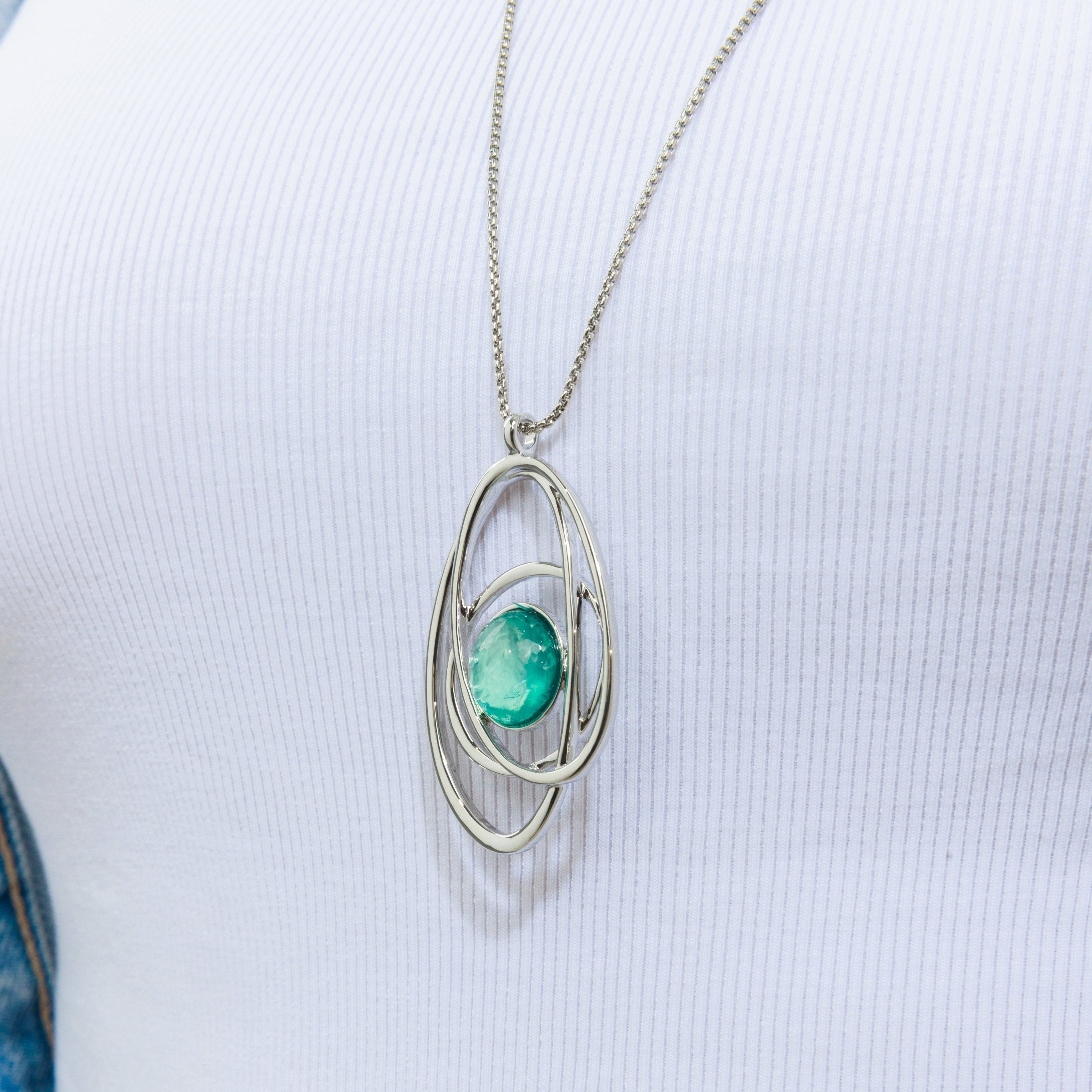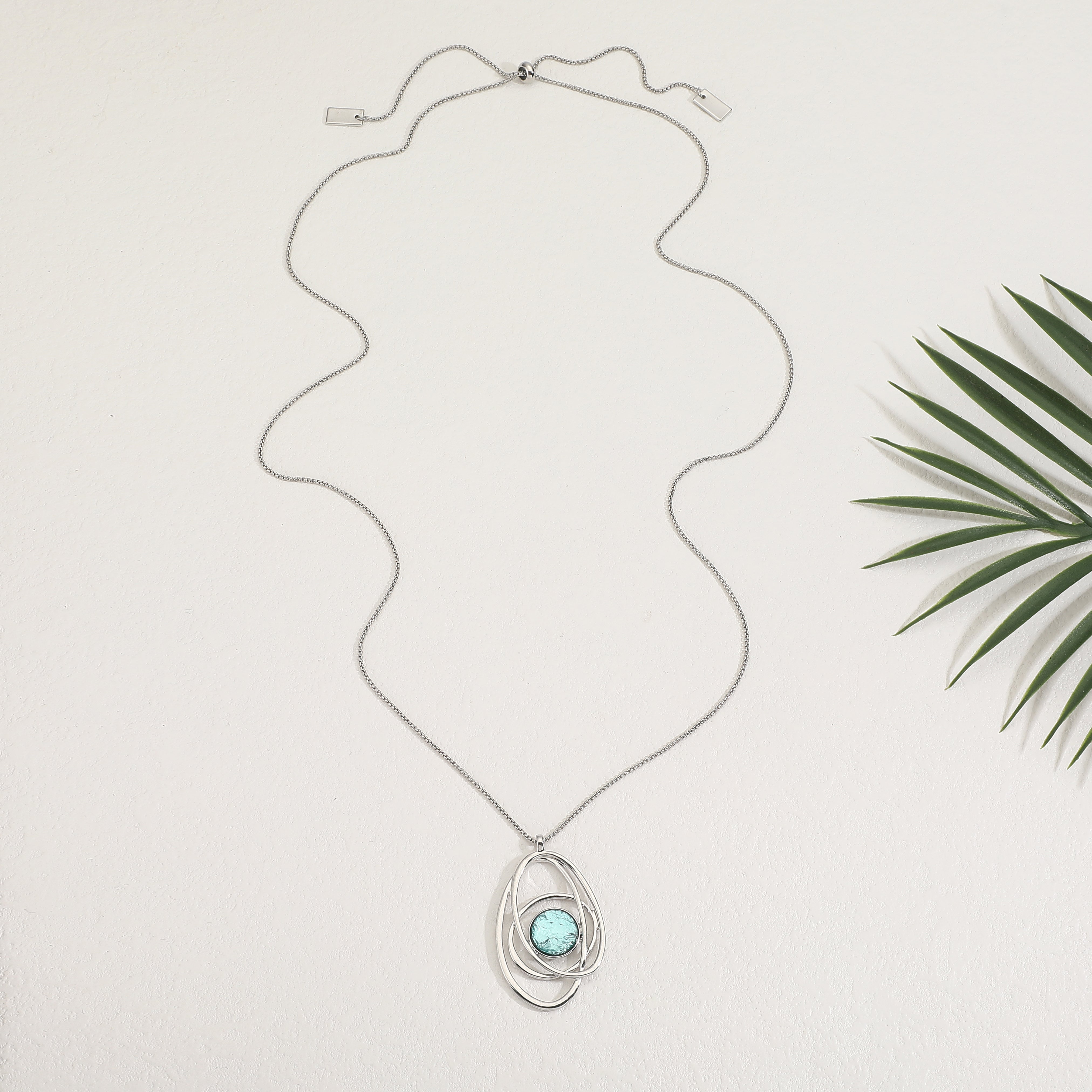 שרשרת ארוכה אלודי טורקיז היא שרשרת ארוכה בעיצוב פיסולי ייחודי, המשלבת תליון מעגלים א-סימטריים סביב דמוי אבן מרכזית בגוון טורקיז מהמם.