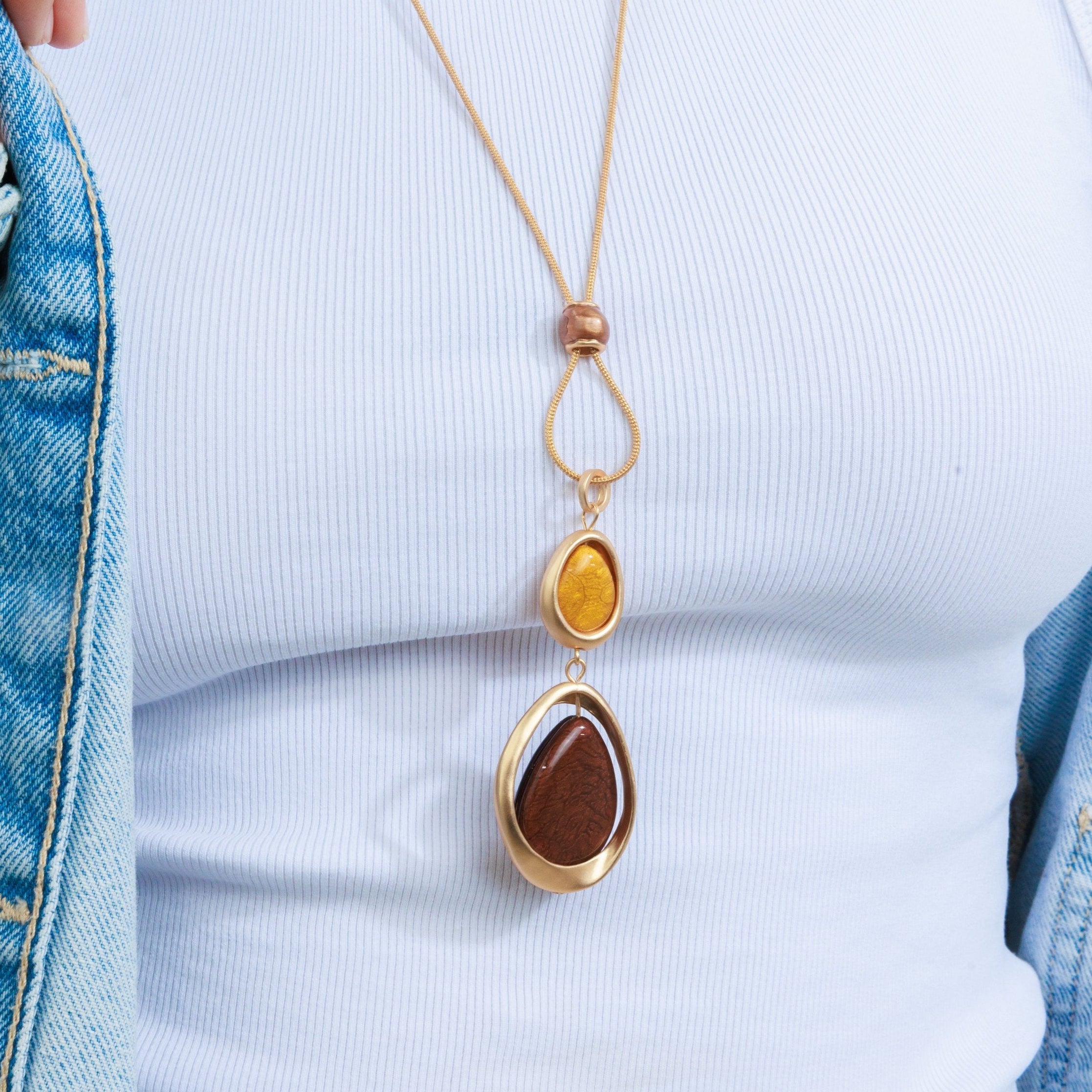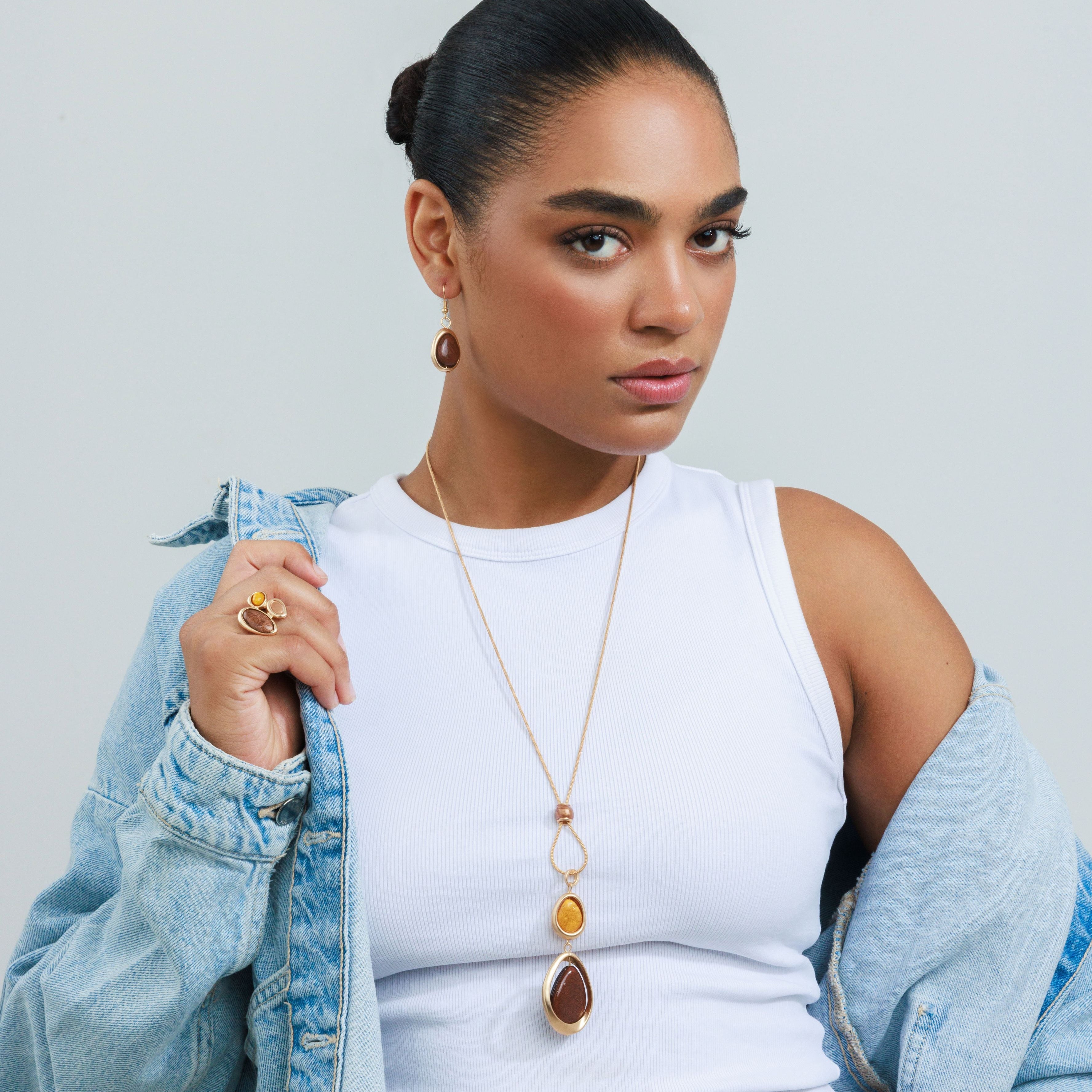 שרשרת ארוכה דאייר גולד היא שרשרת ארוכה מעוצבת בעלת תליונים מעוגלים עם אלמנטים ייחודיים בגווני חום-זהב.