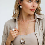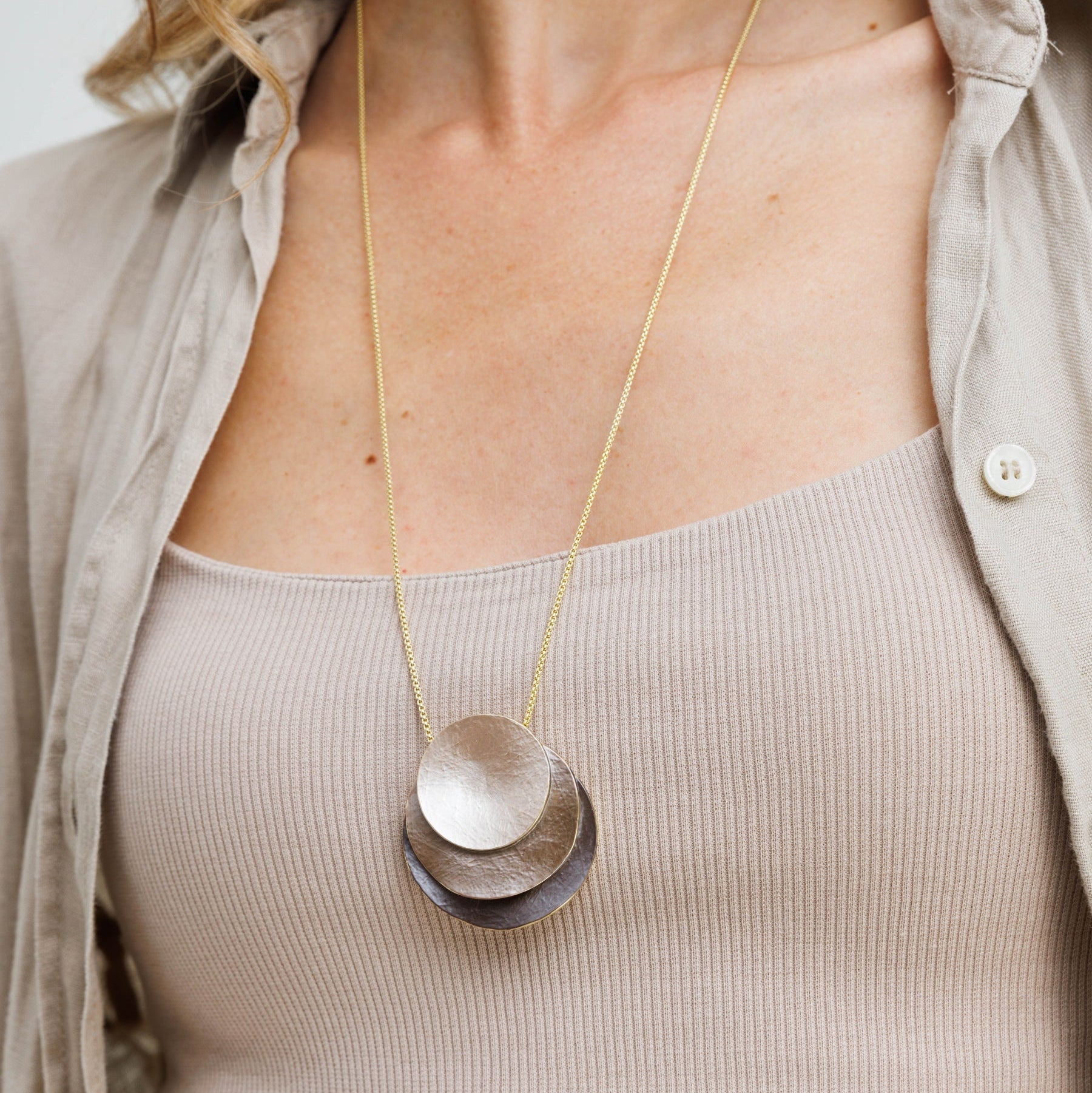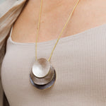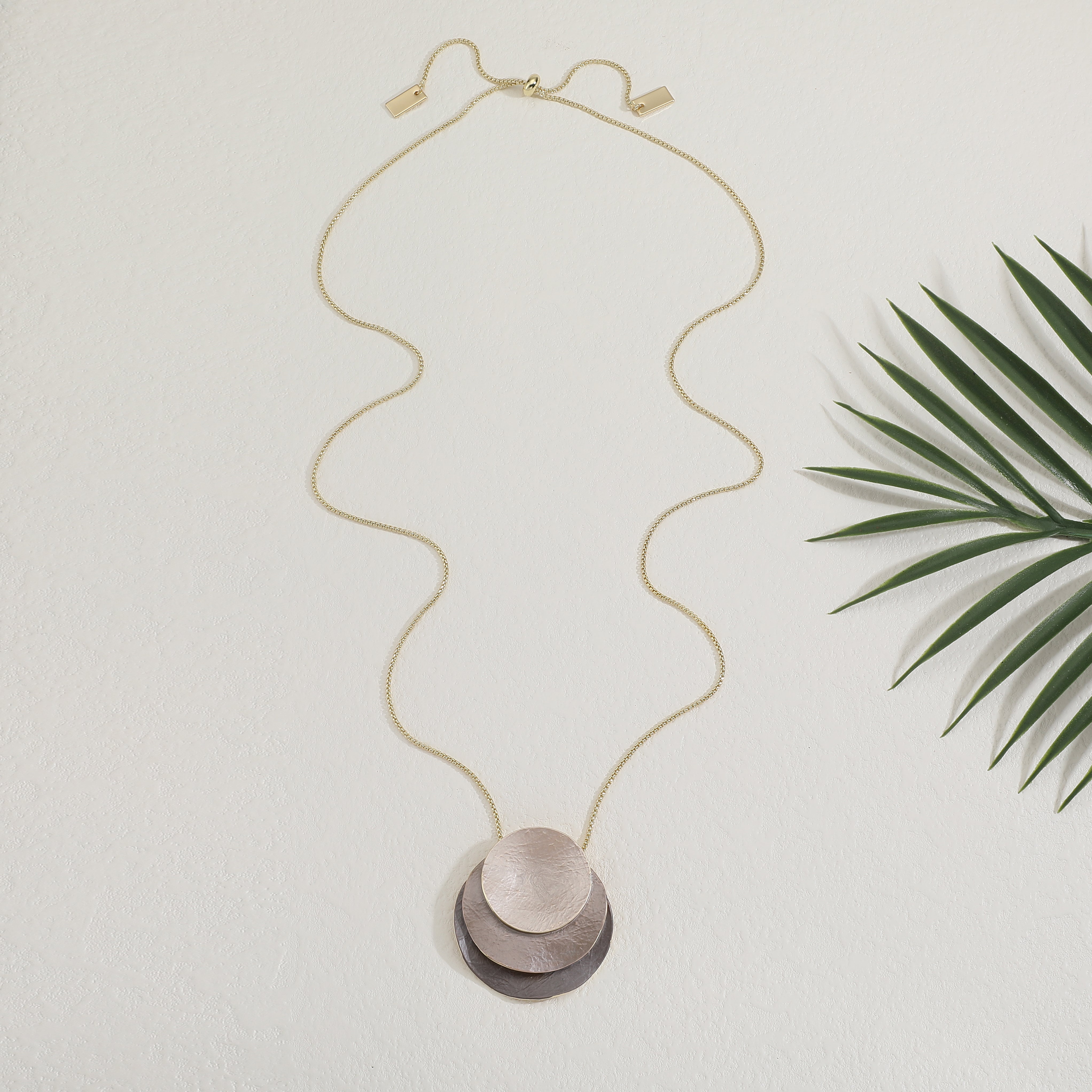 שרשרת ארוכה דונטל היא שרשרת ארוכה בעלת תליון עם אלמנטים עיגוליים בגווני חום מלאת נוכחות וסטייל.