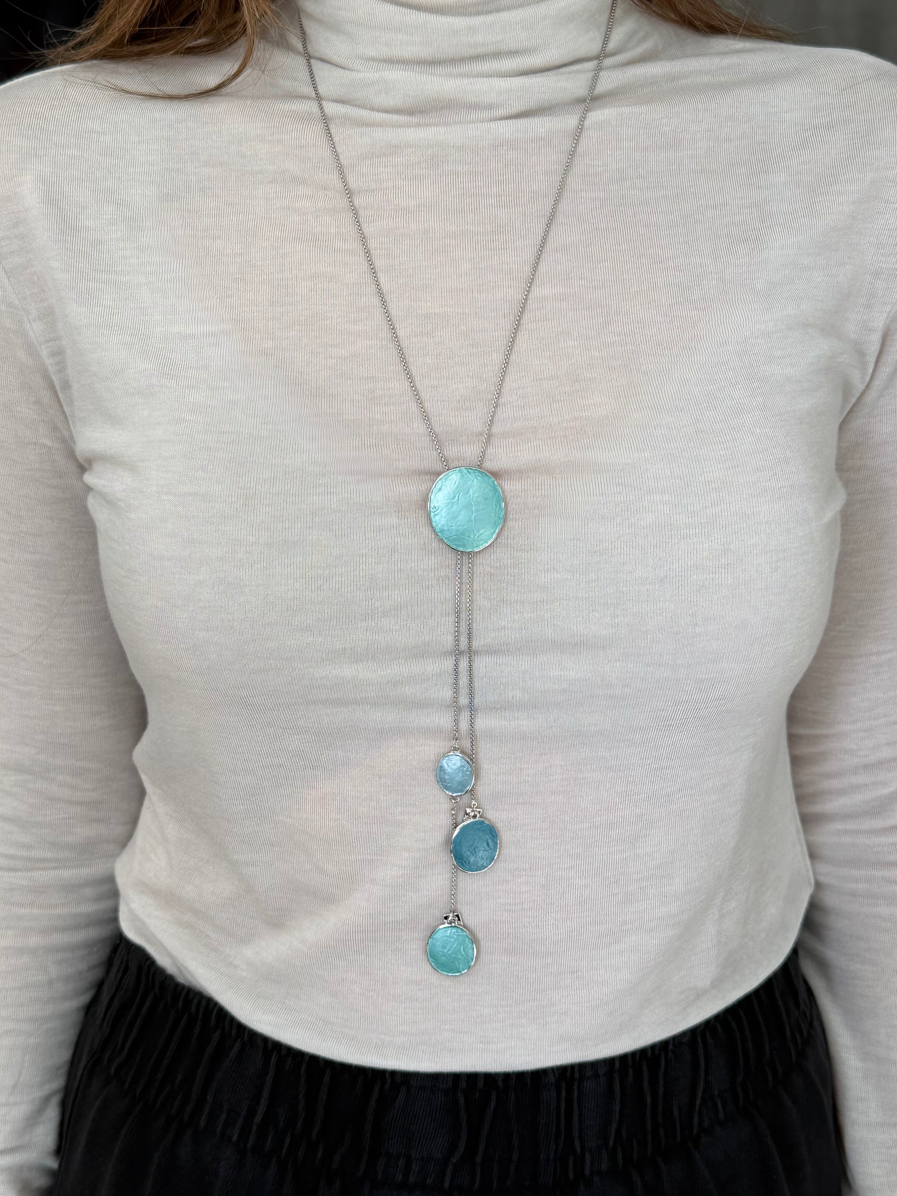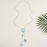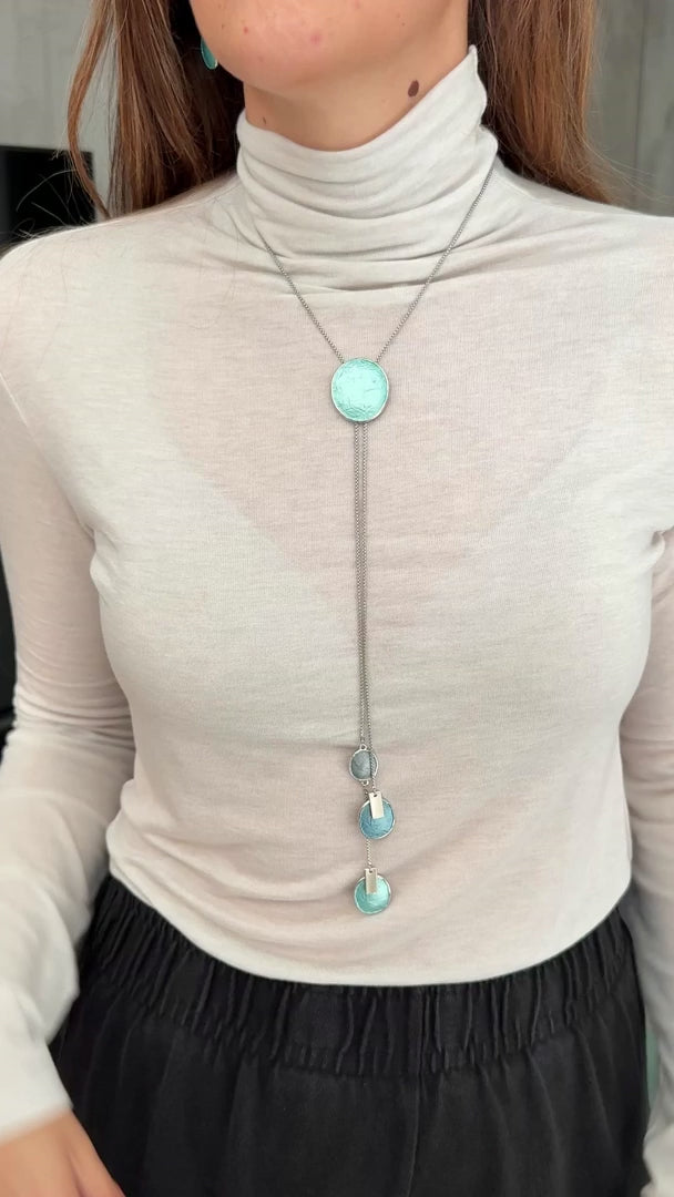 שרשרת ארוכה ניו תאיה טורקיז היא שרשרת ארוכה עם אלמנטים ייחודיים בצורות מעוגלות בגווני טורקיז מושלמים.