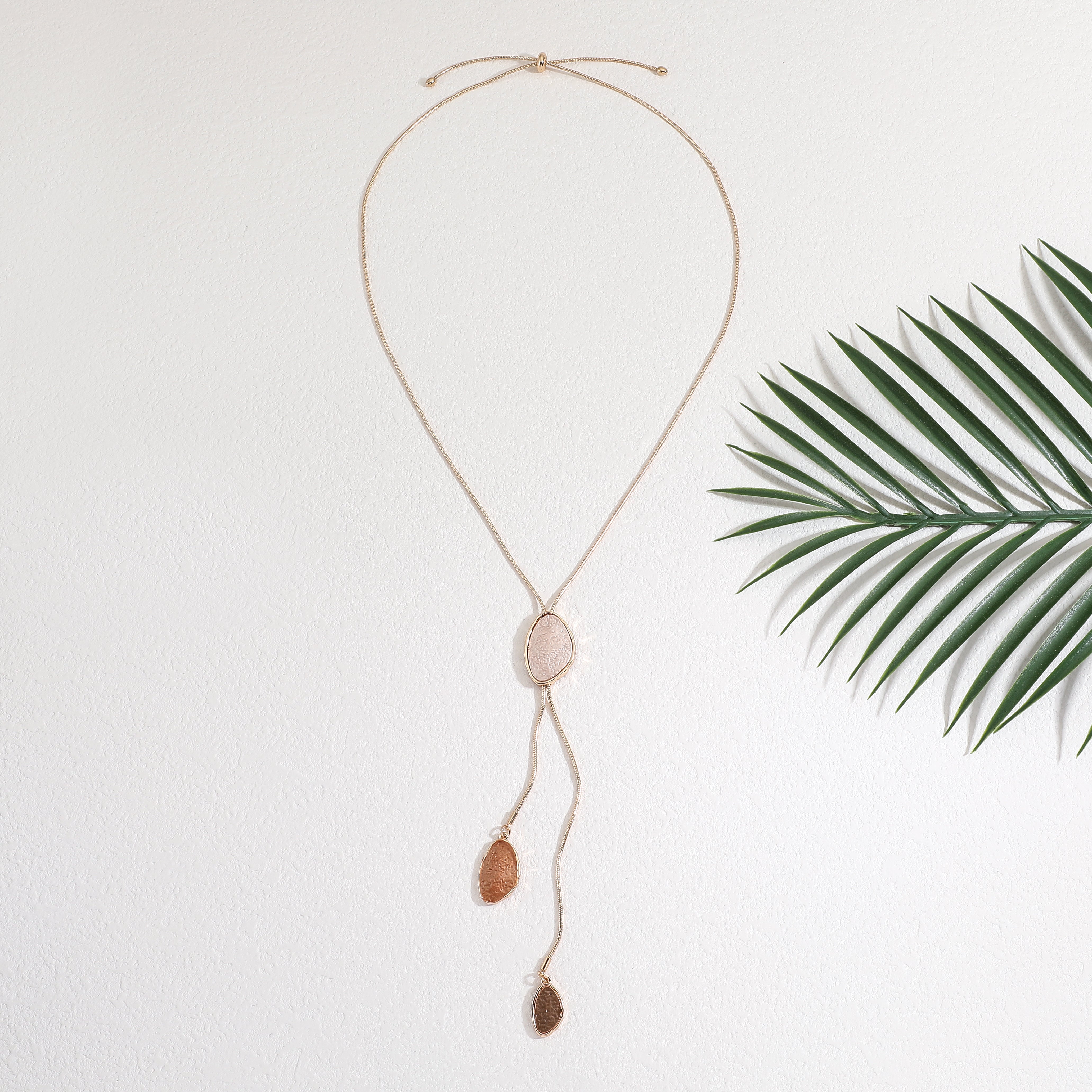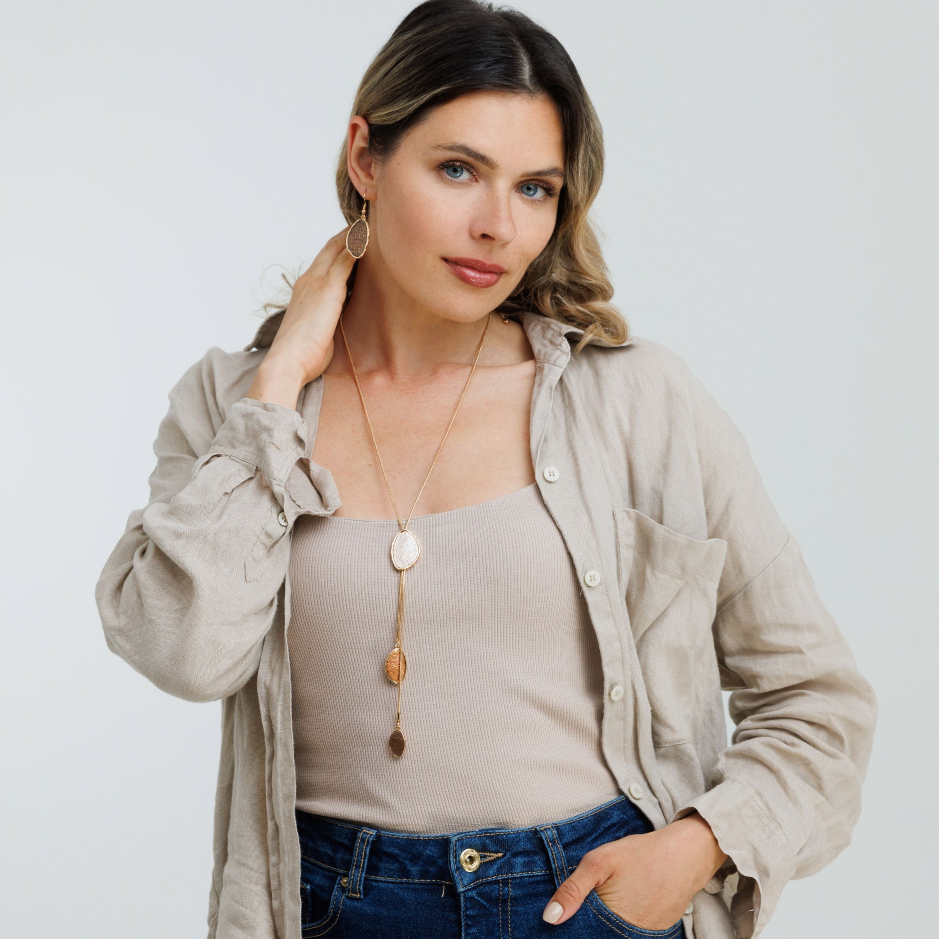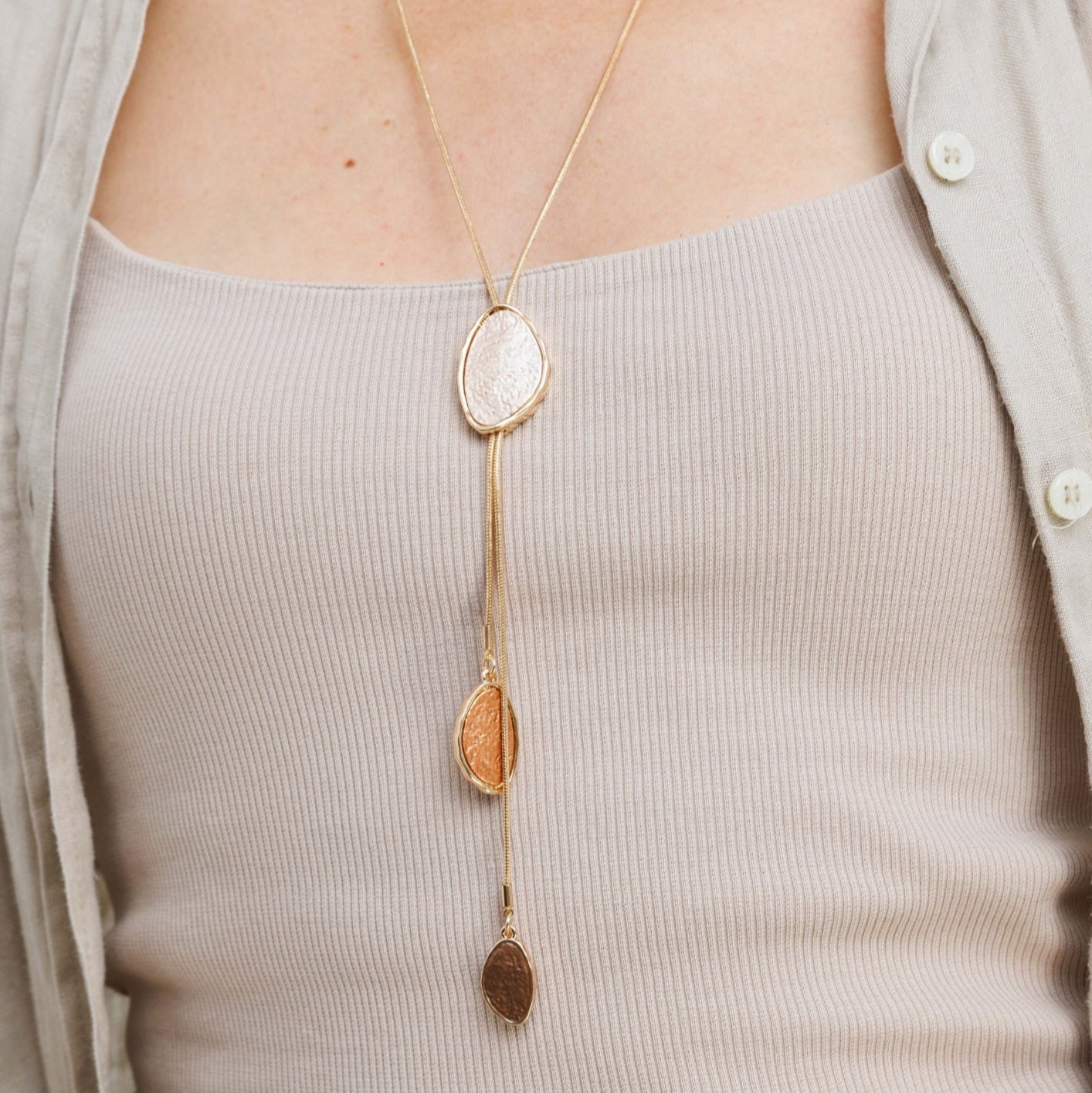 שרשרת ארוכה תאיה גולד היא שרשרת ארוכה עם אלמנטים יחודיים בצורת אליפסה בגווני חום שונים.
