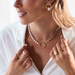 שרשרת הולו ראונד פרל היא שרשרת הורסת שמשלבת בין פנינים קלאסיות לבין חוליות בשילוב אמלנט עגול מרשים.
