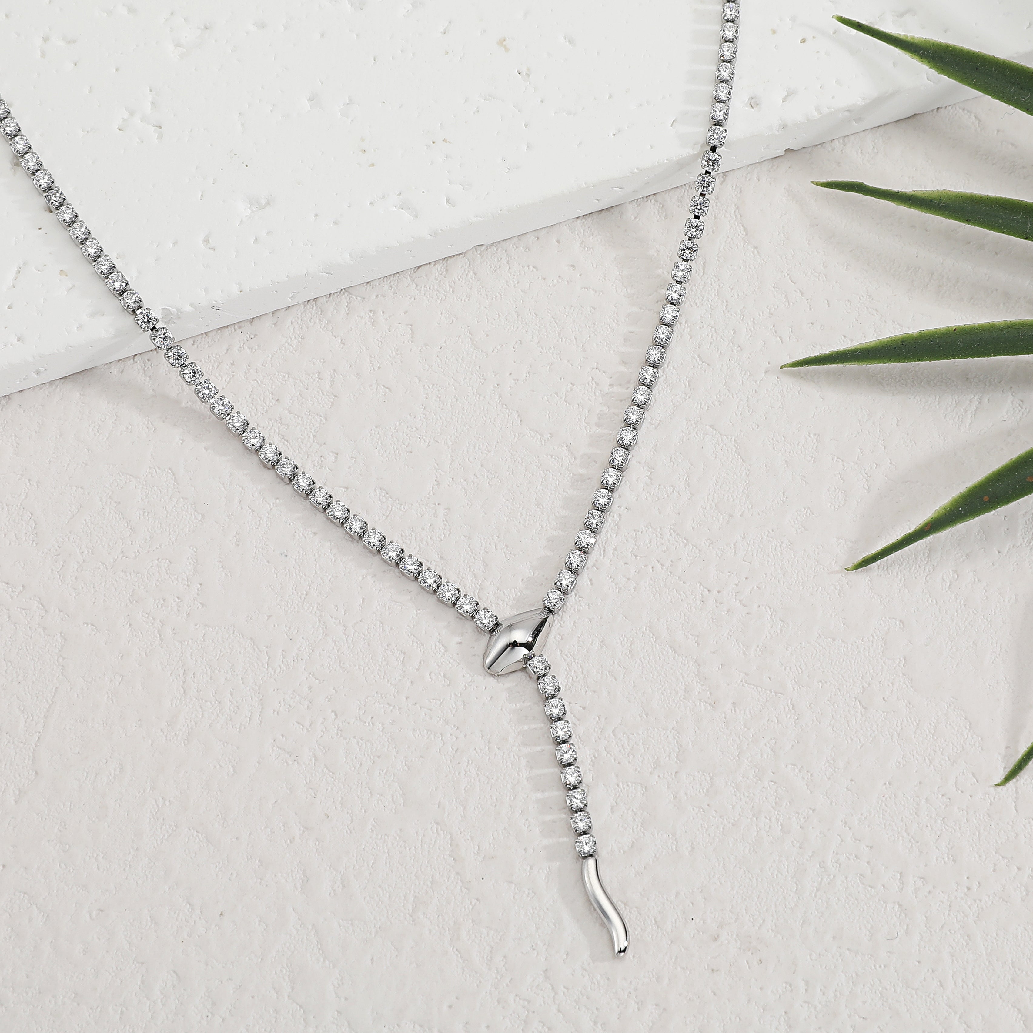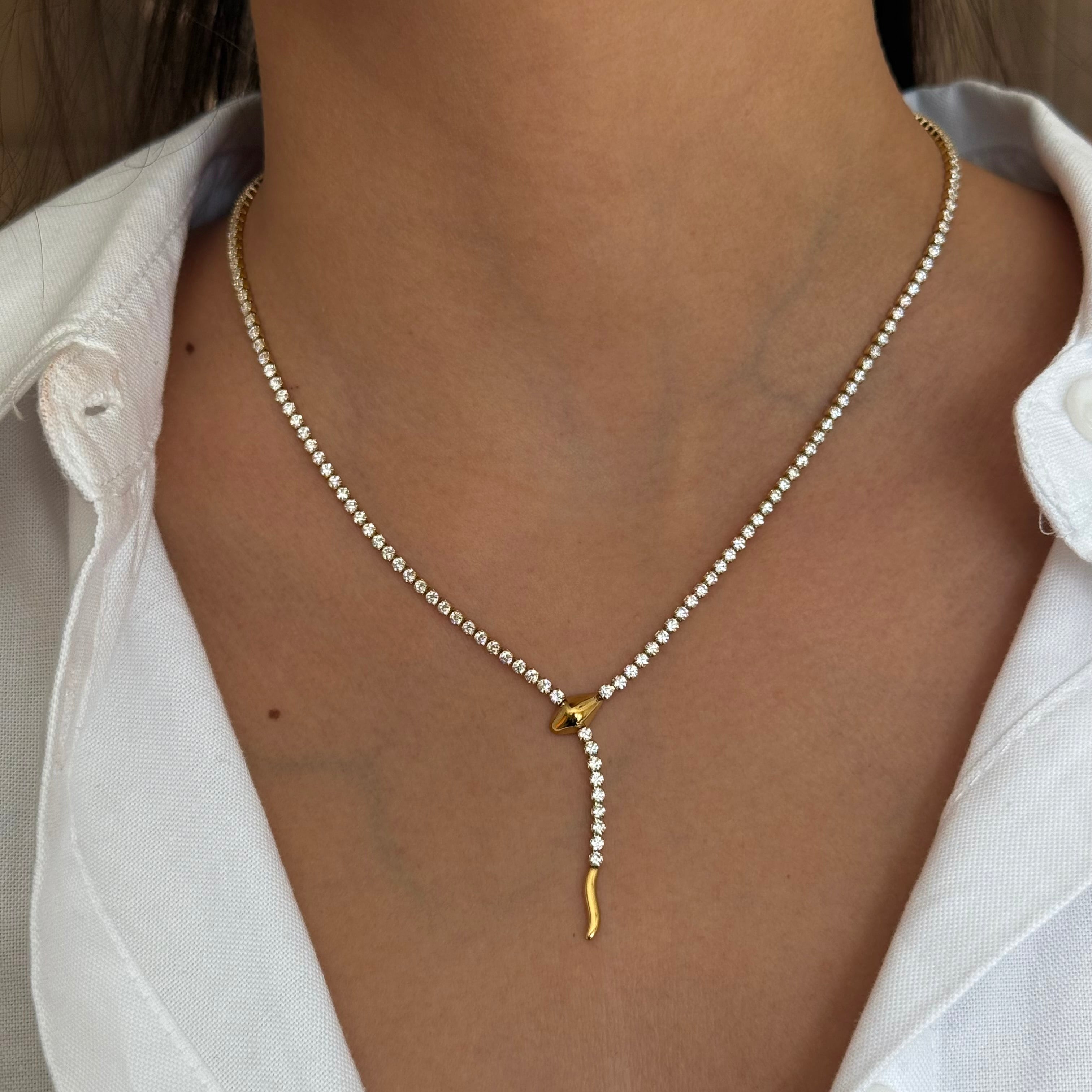 שרשרת טניס נופלת סנייקי היא שרשרת נופלת משובצת זרקונים בצורת וי עם אדג' ייחודי סטייל נחש ונוכחות מהפנטת.