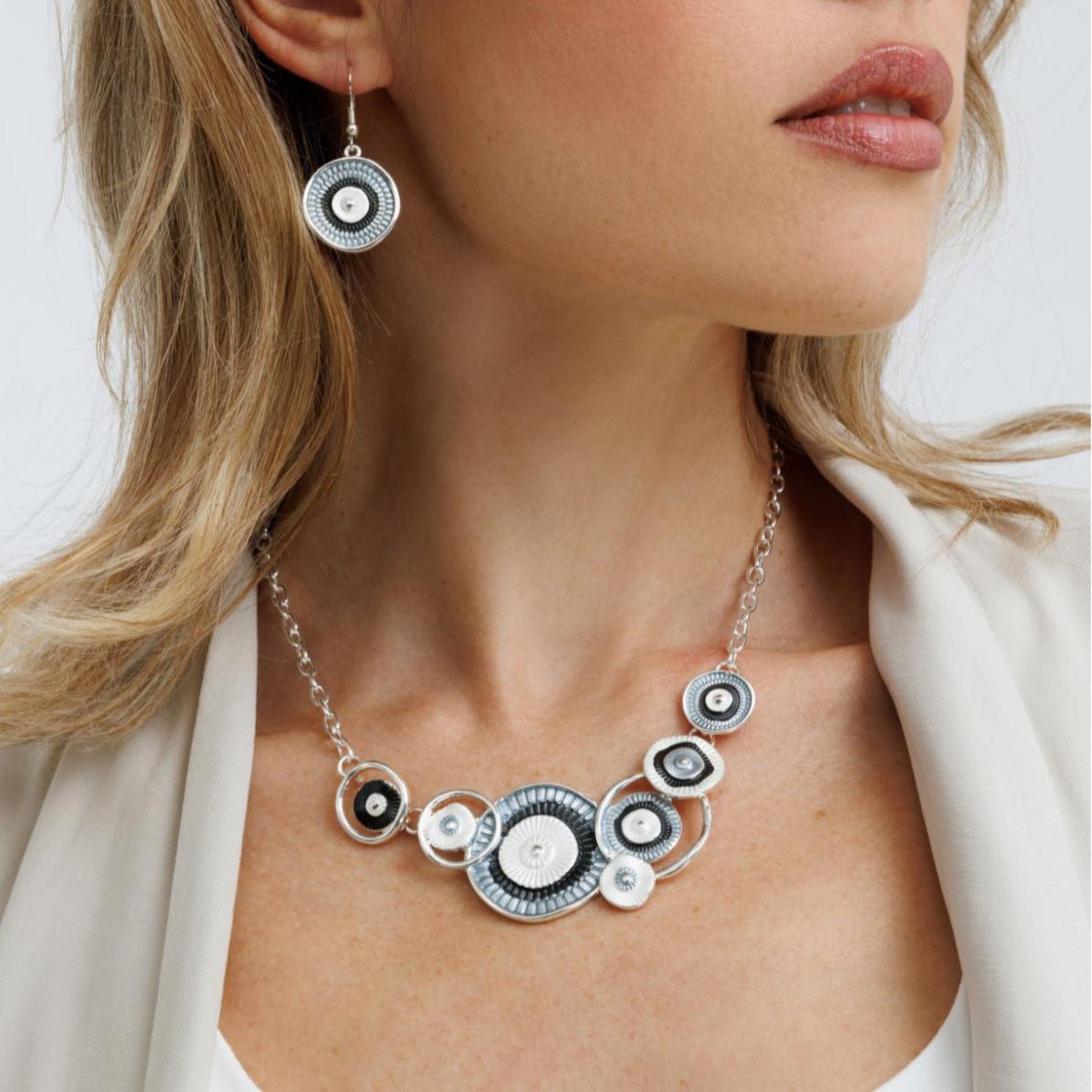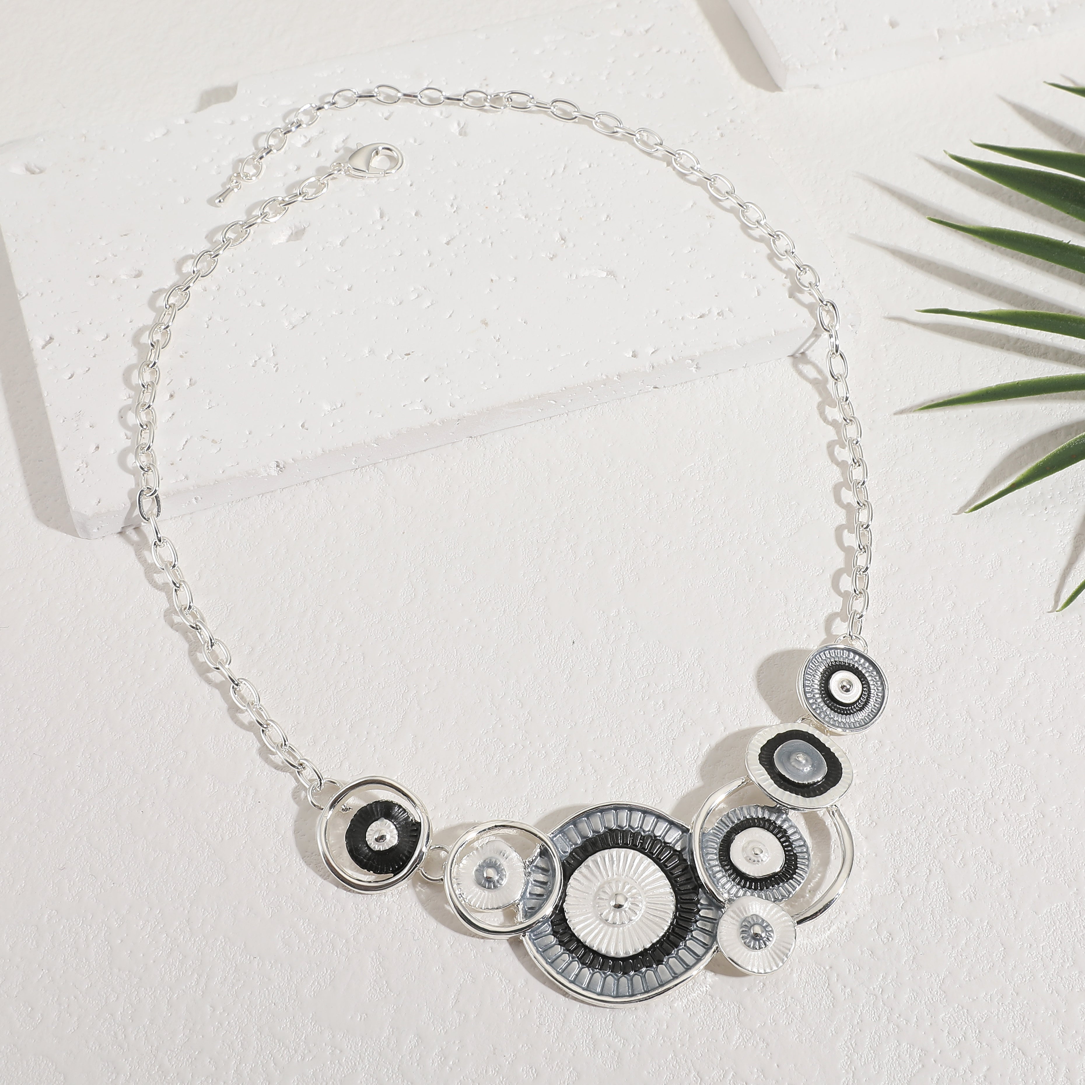 בשרשרת אלמנטים שונים בצורות עגולות שונות היוצרים שילוב מעניין וייחודי בריקוע וינטאג'י.