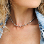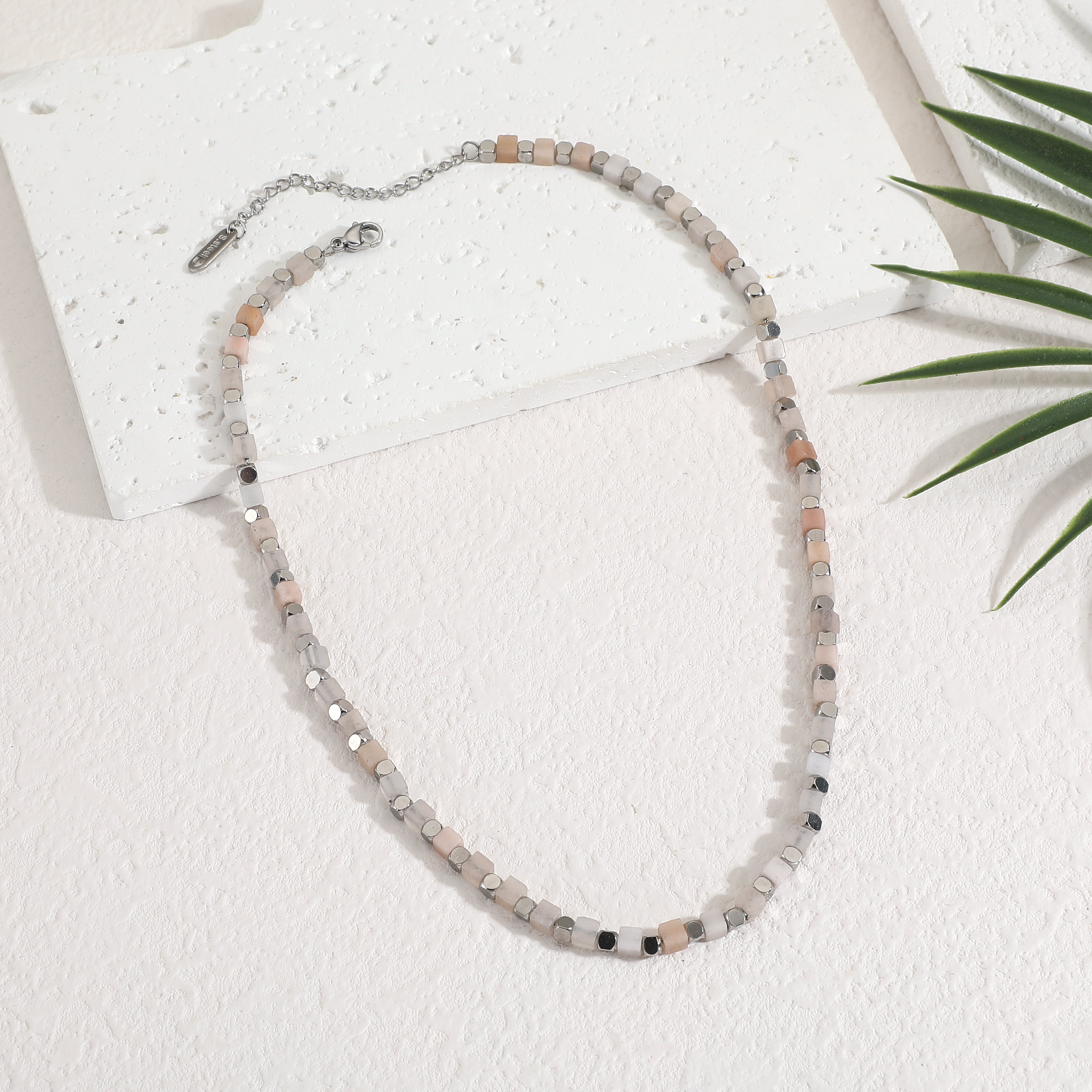 בשרשרת שזורות אבנים אמיתיות בגווני ורוד בהיר בשילוב אלמנטים מרובעים בגוון כסוף.