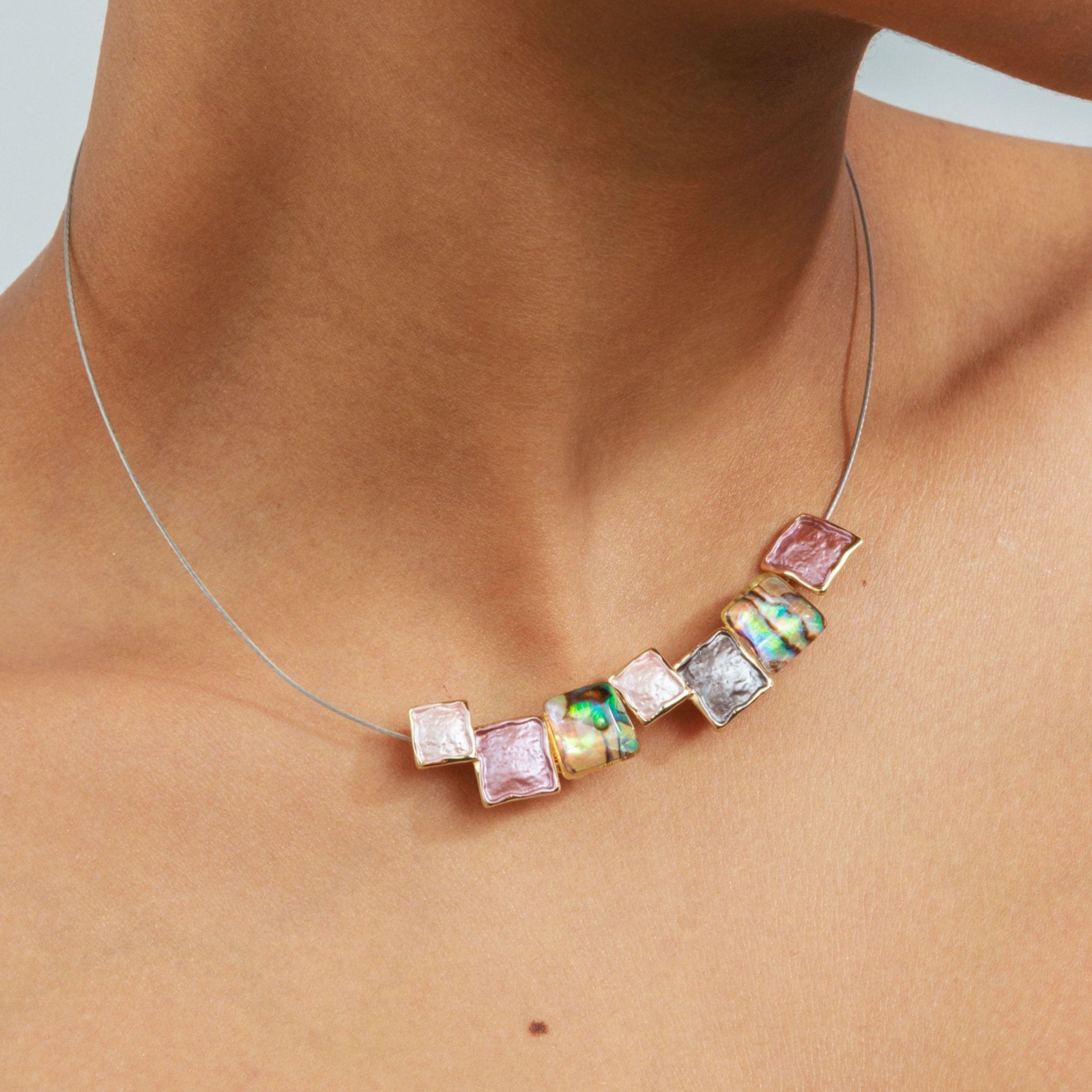 שרשרת קנדי היא שרשרת תליונים מרובעים בגווני חום וורוד עתיק בשילוב אלמנט צדף ייחודי וחדשני.