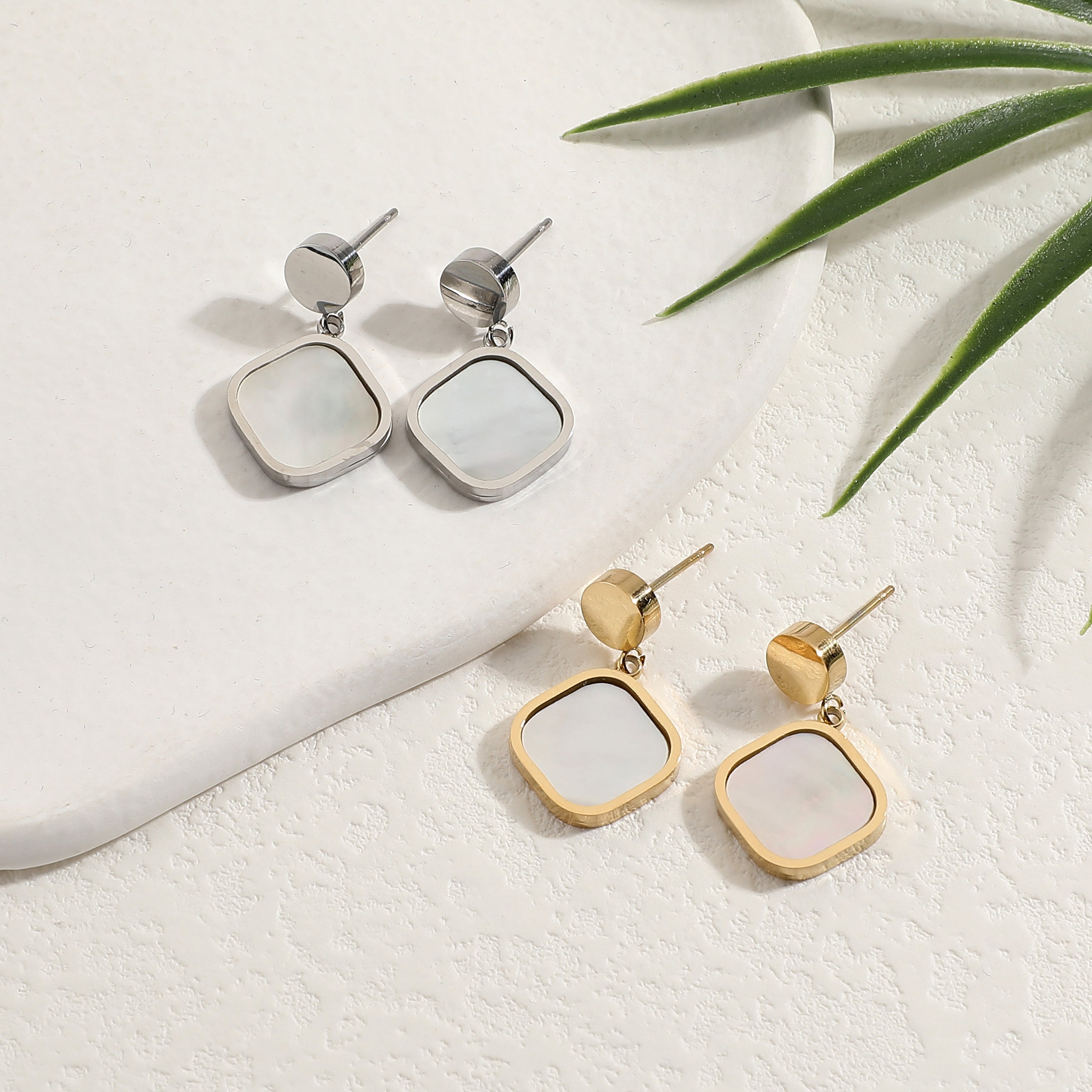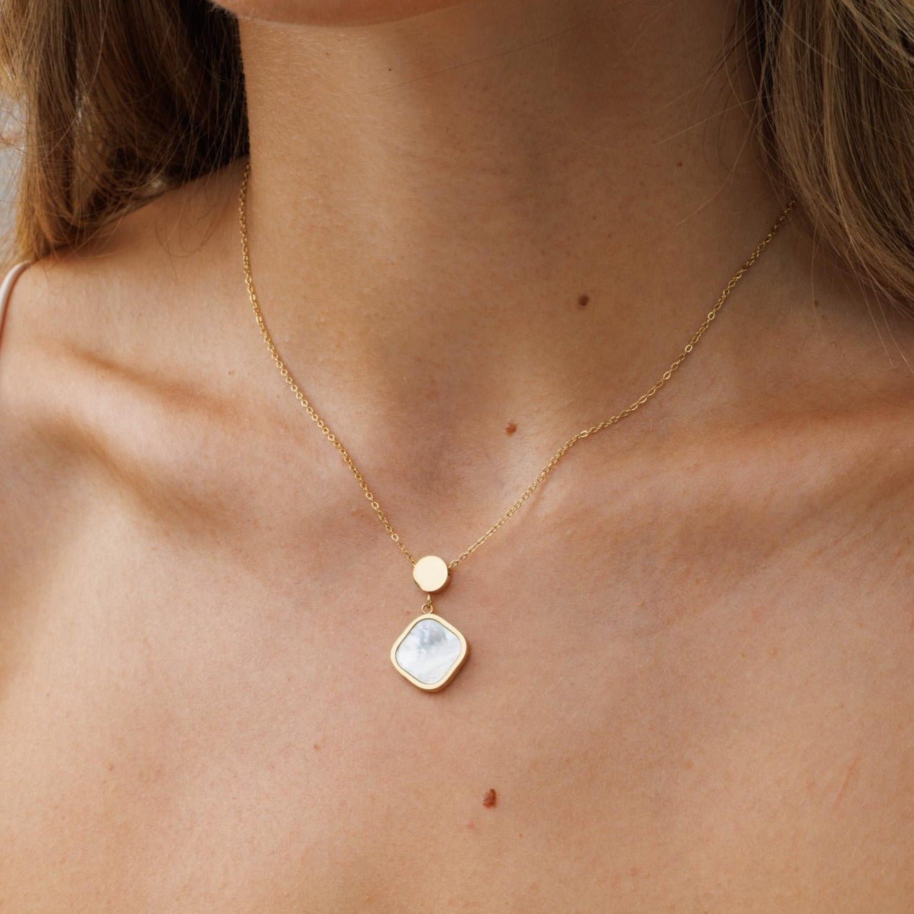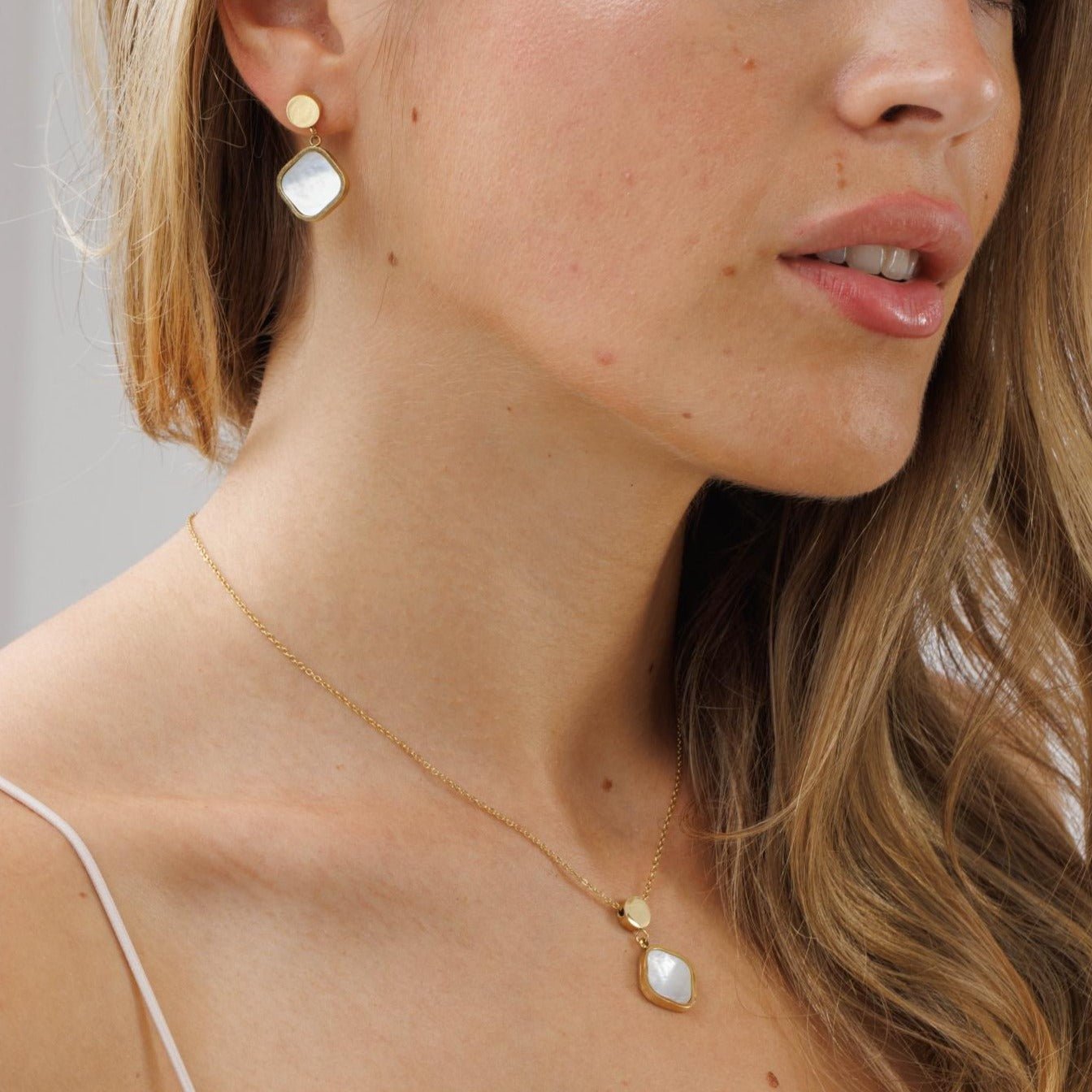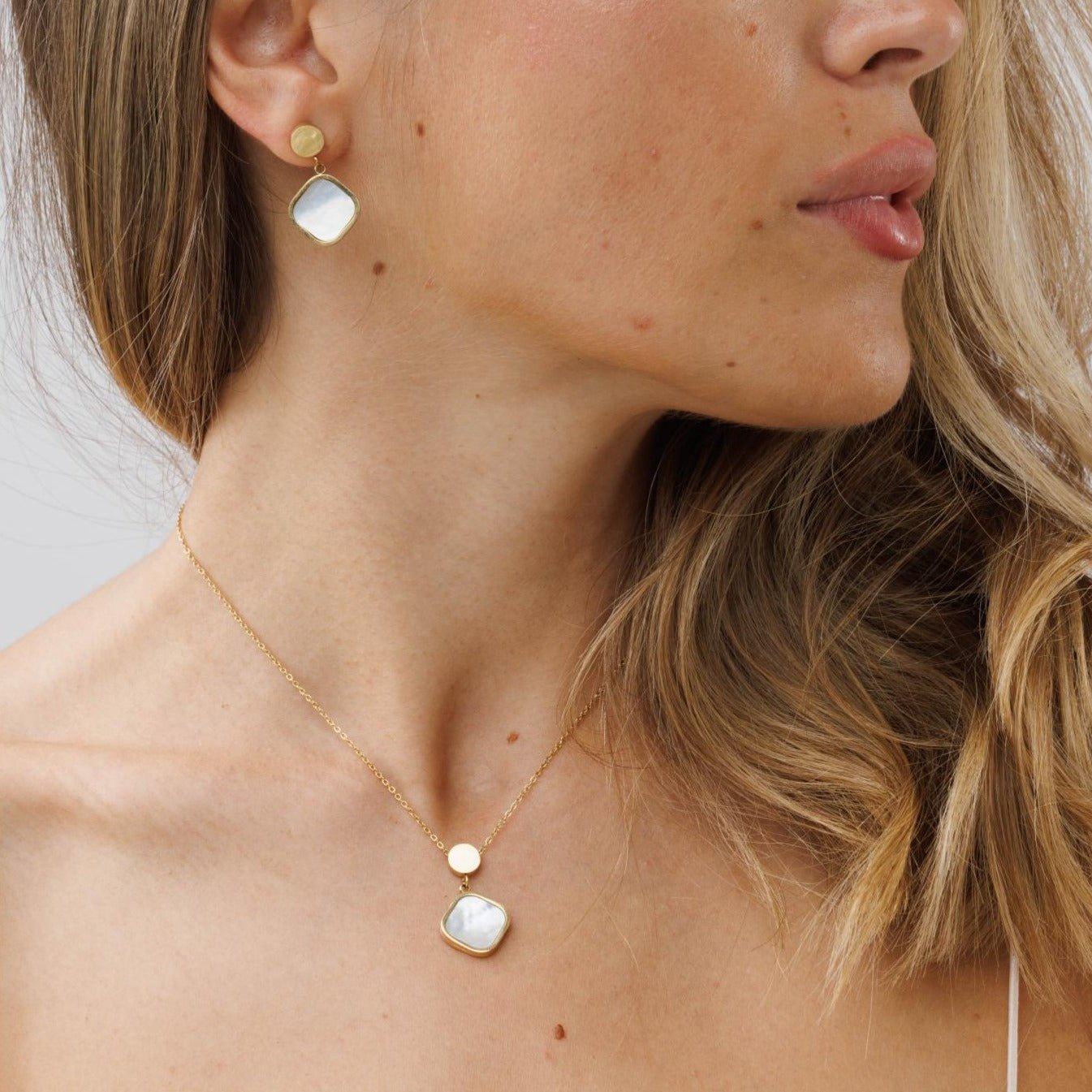 סט שרשרת ועגילי שייל סקוור הוא סט עם תליוני צדף לבן קלאסיים ונצחיים.